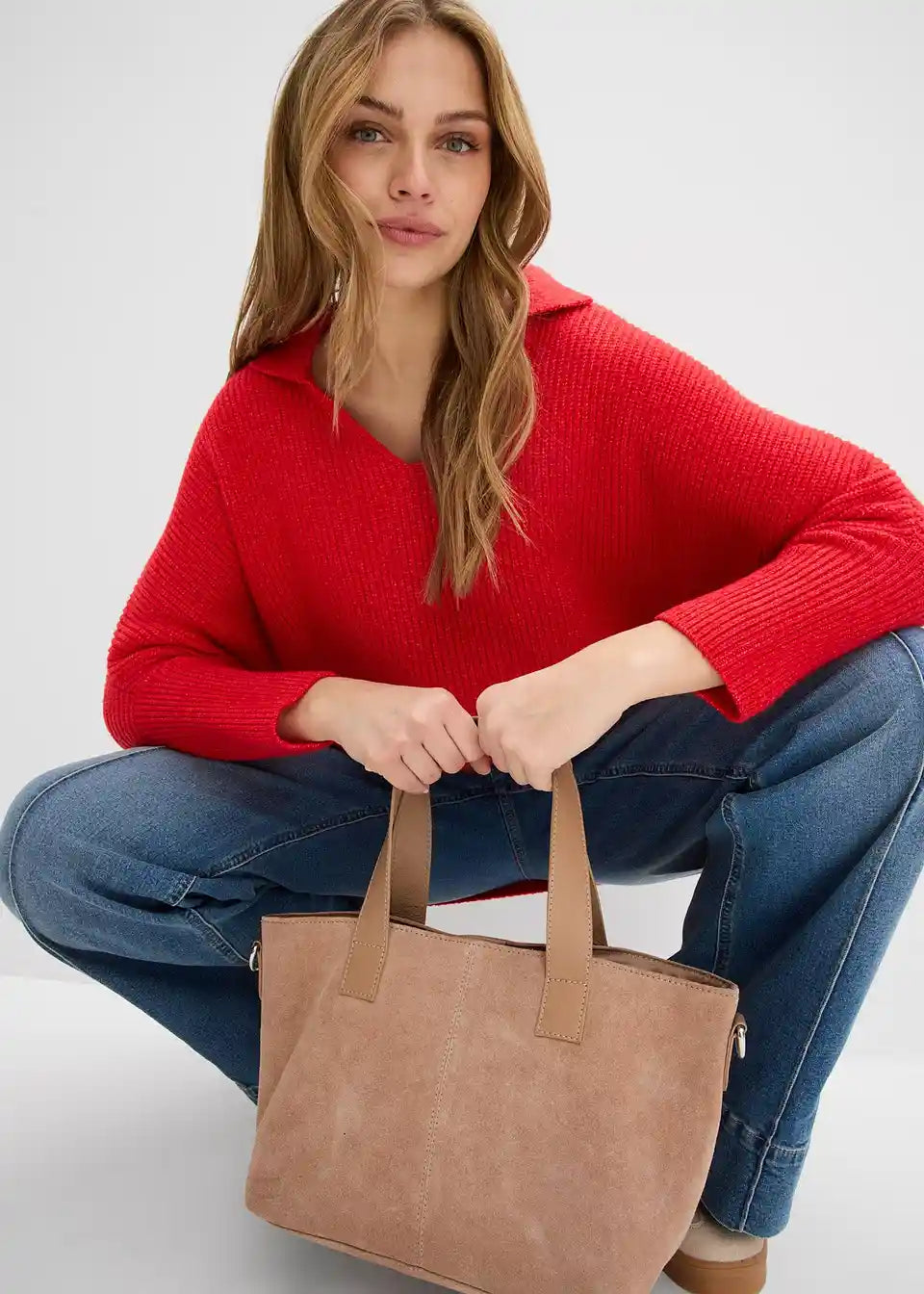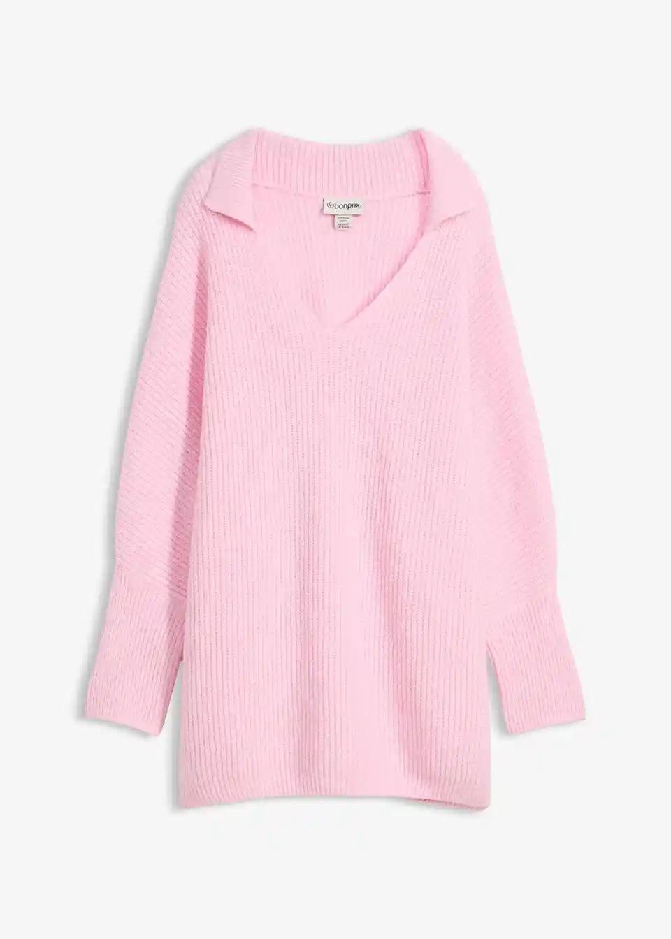 Ohlapen pulover s širokim polo ovratnikom, V-odprtino spredaj in netopirskimi rokavi v 7/8-dolžini.