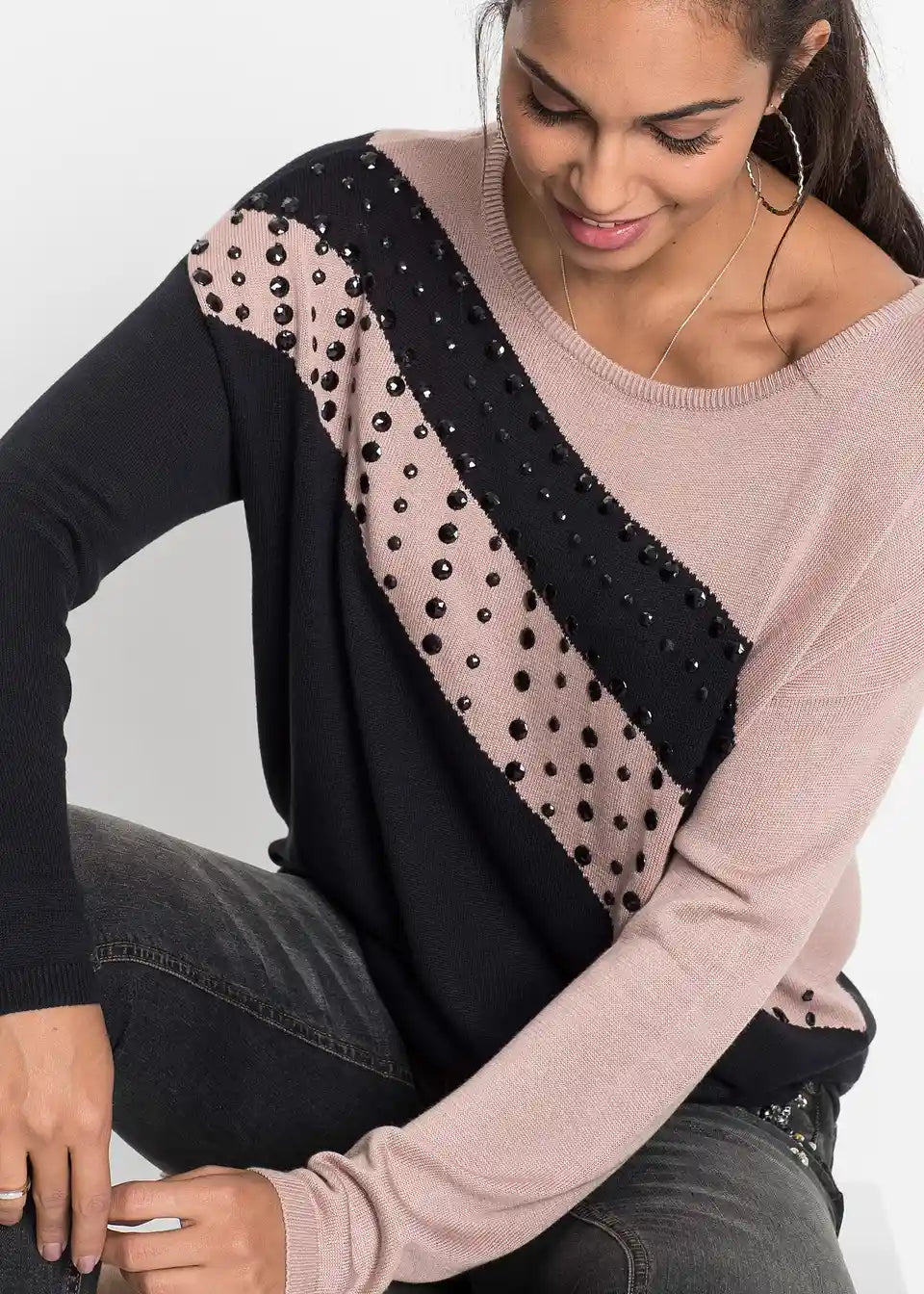 Slogovni pulover s prevelikimi rameni in aplikacijami iz kamnov