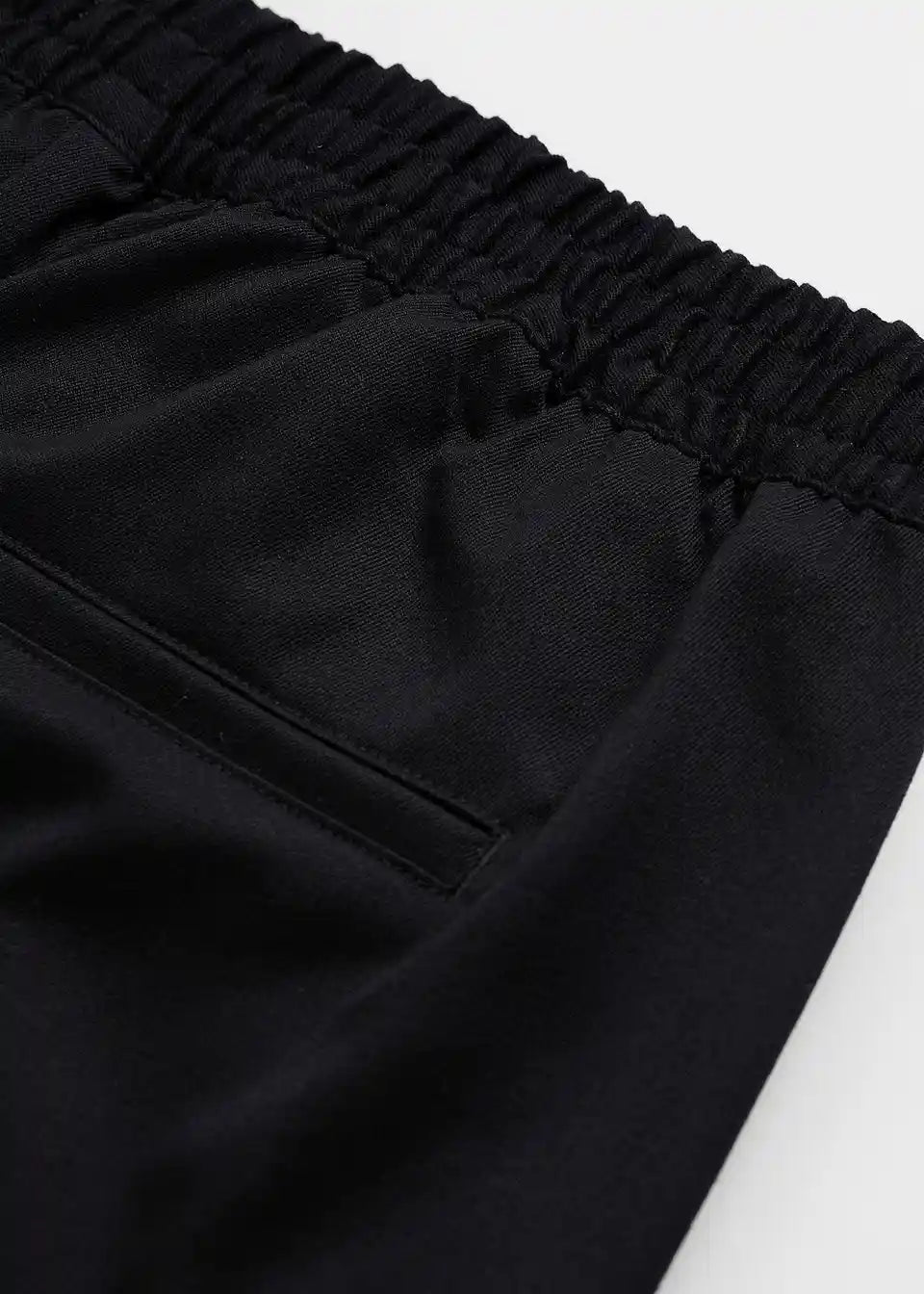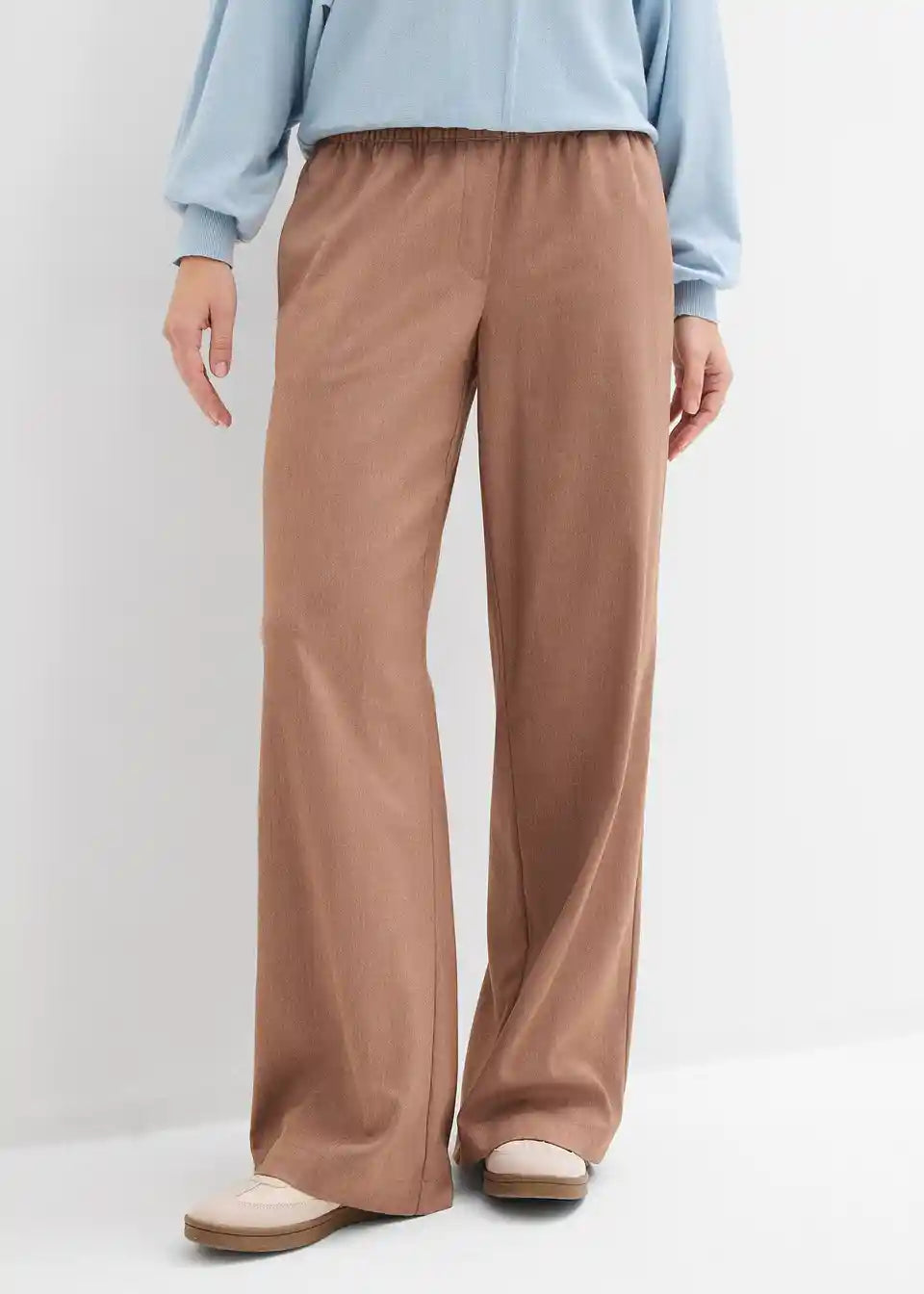 Hlače z elastičnim pasom in lažnim razporkom. S poševnimi stranskimi žepi, nakazanimi žepi z letvico zadaj in širokimi hlačnicami.