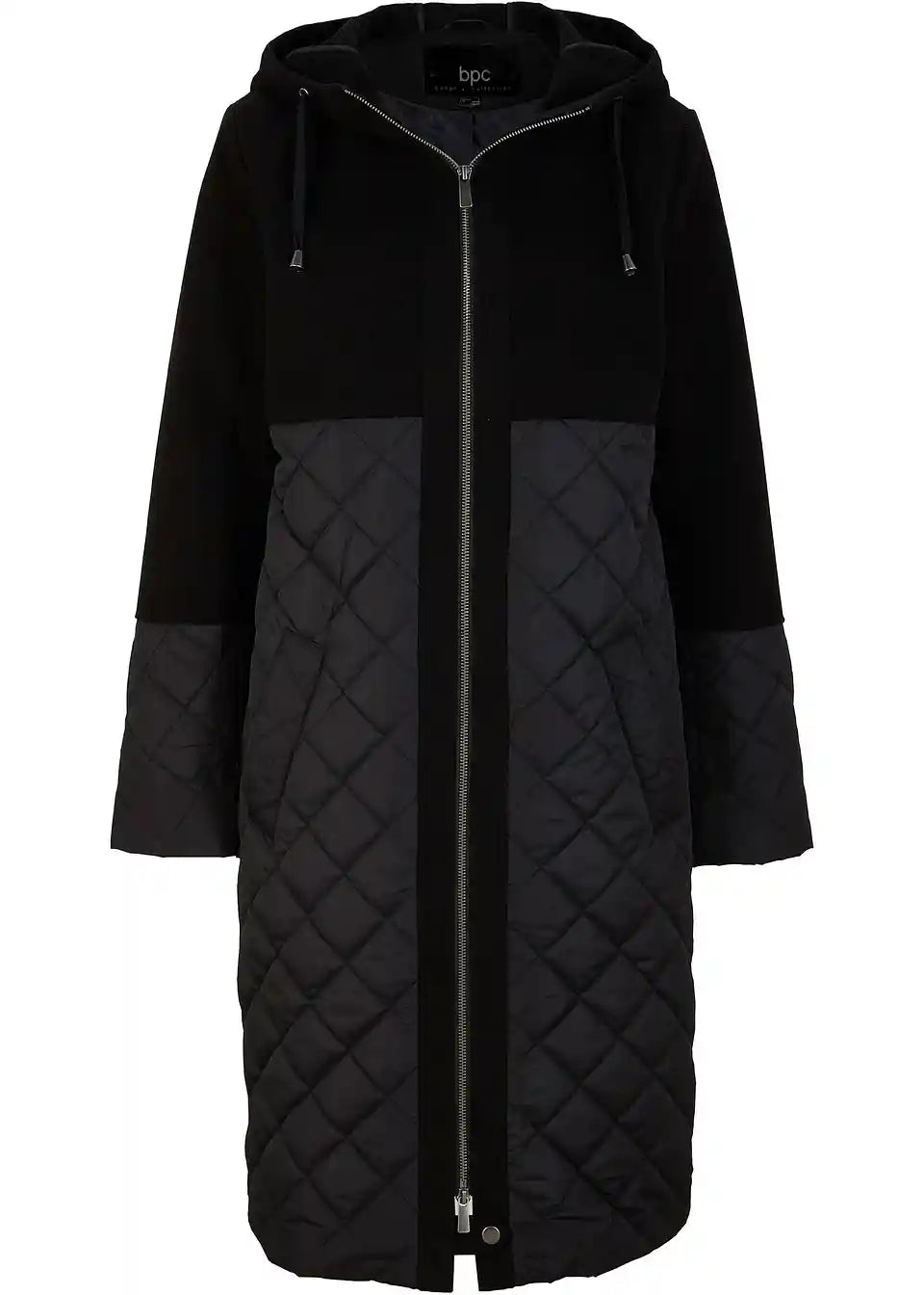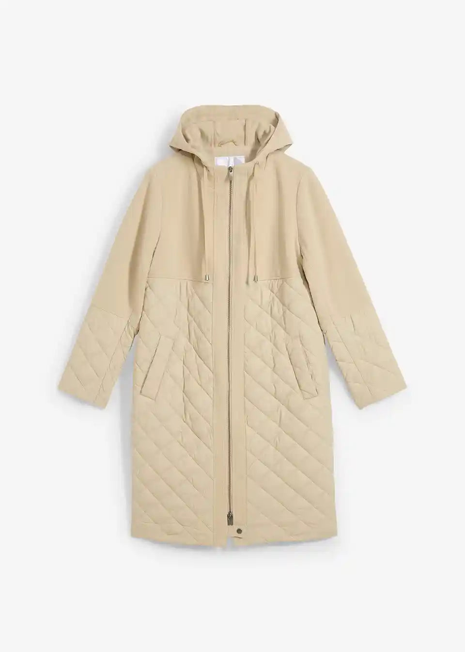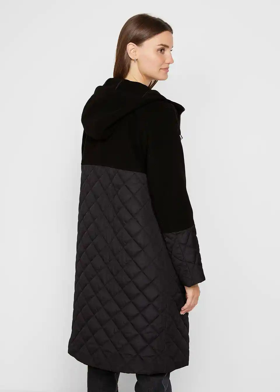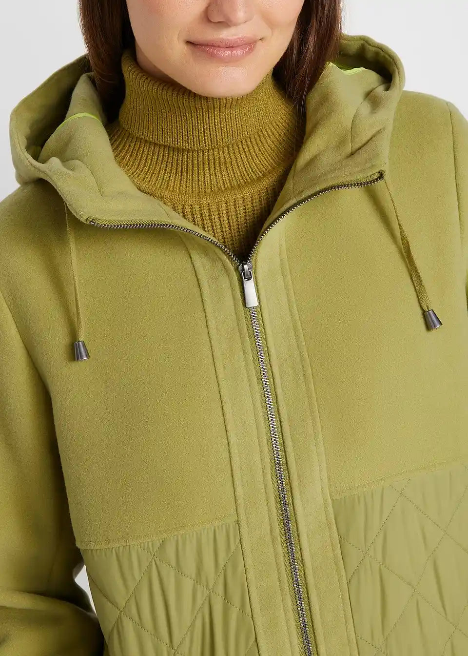 Okusen plašč s kapuco in ravnim krojem iz privlačne mešanice materialov