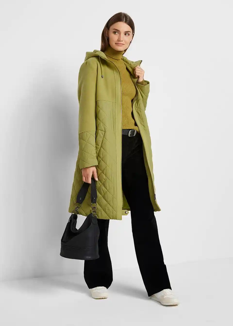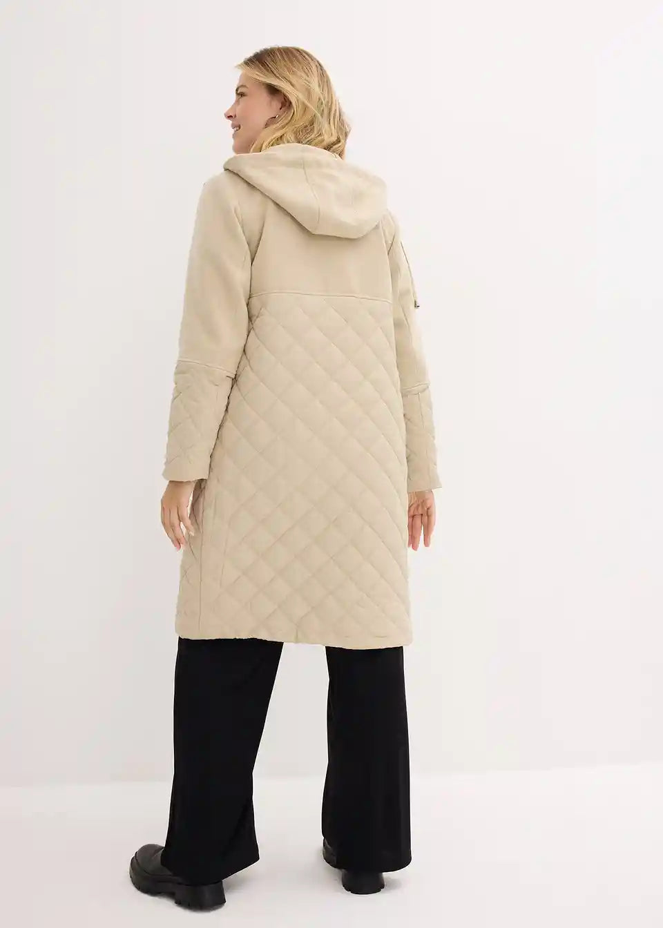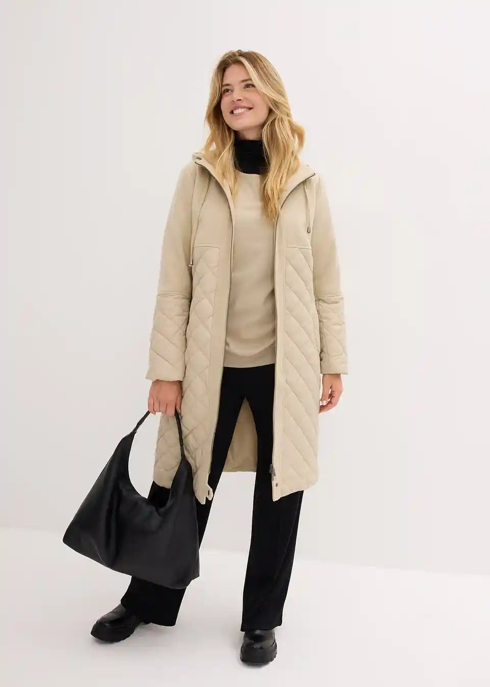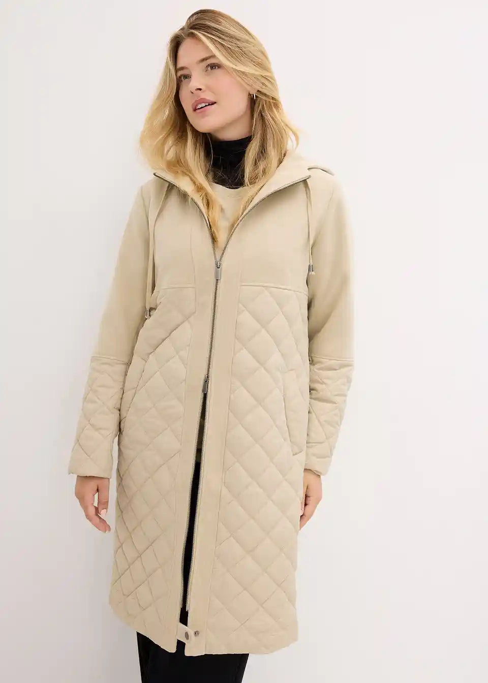 Okusen plašč s kapuco in ravnim krojem iz privlačne mešanice materialov