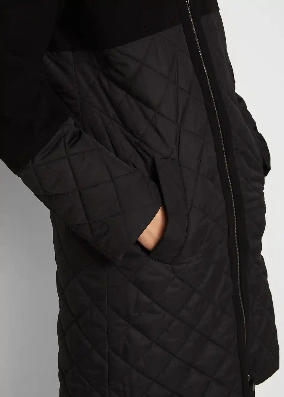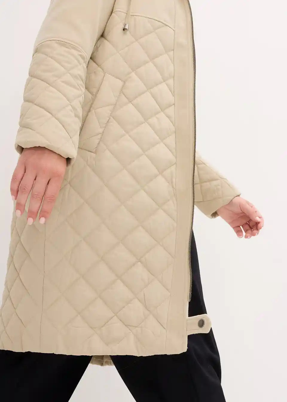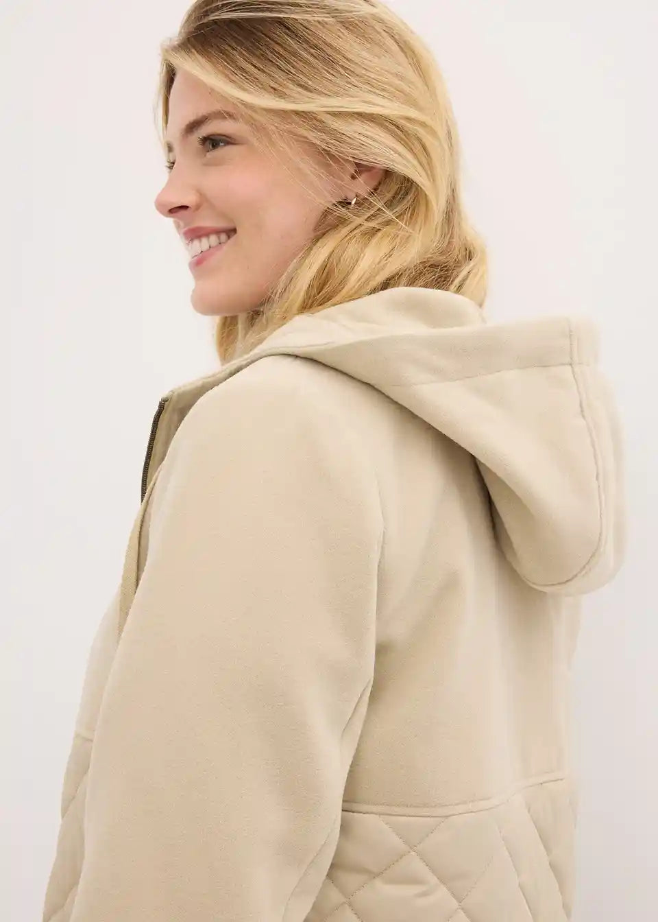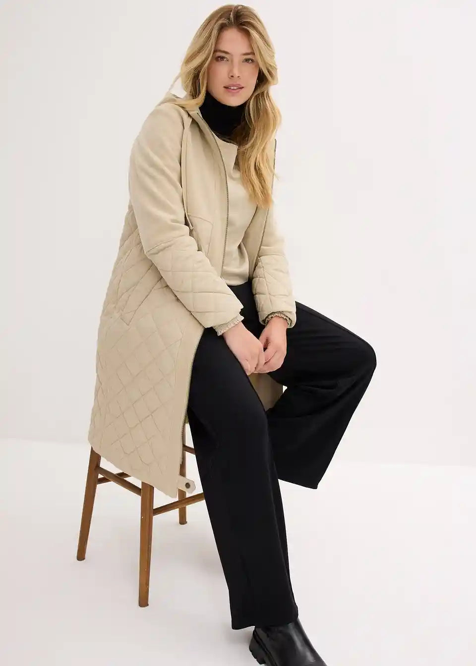 Okusen plašč s kapuco in ravnim krojem iz privlačne mešanice materialov