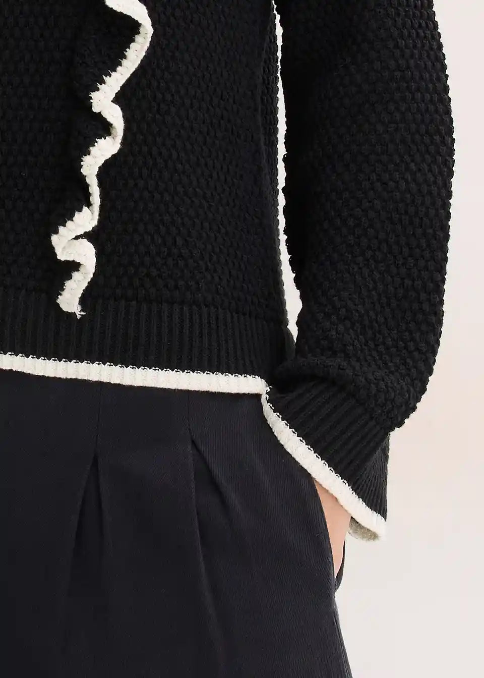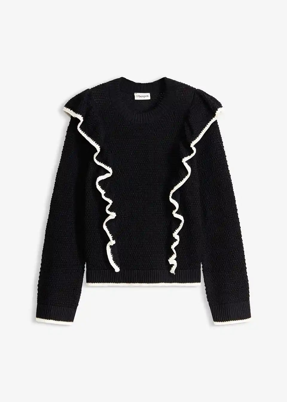 Moderen pulover z volani in zapovedanim kontrastnim dizajnom