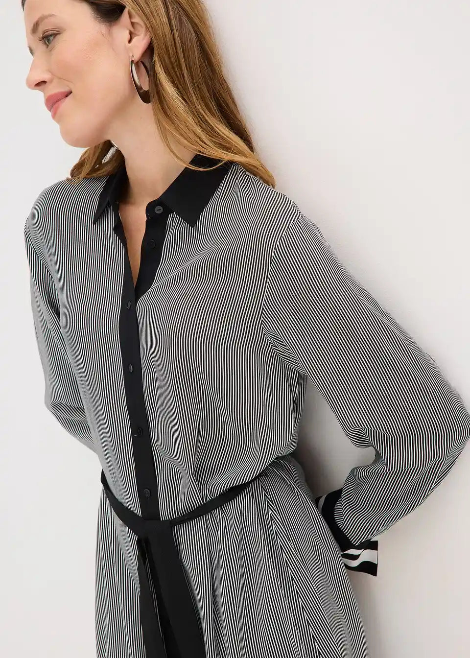 Krtka srajčna obleka, ki se zapenja z gumbi, z rahlo v rokav podaljšanimi ramami in dolgimi rokavi z razporkom in gumbom na manšetah. Brez podloge.