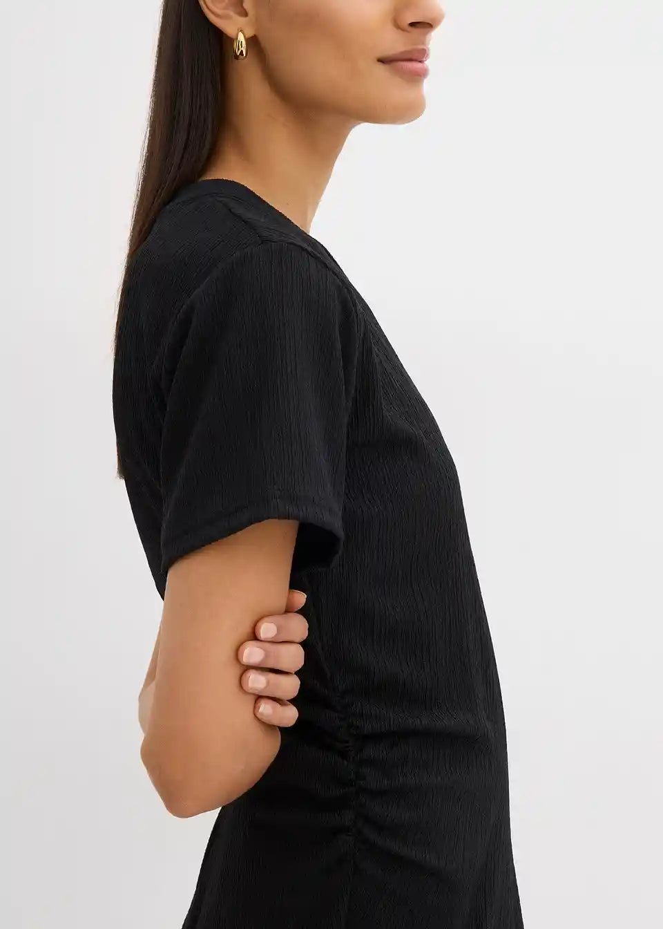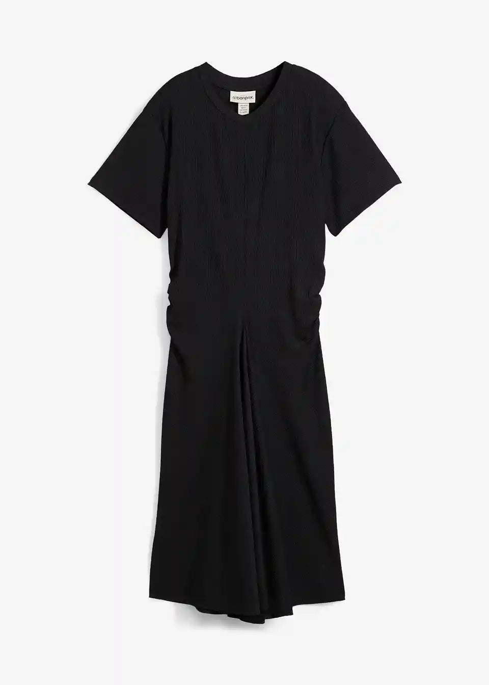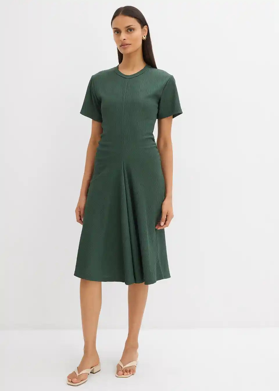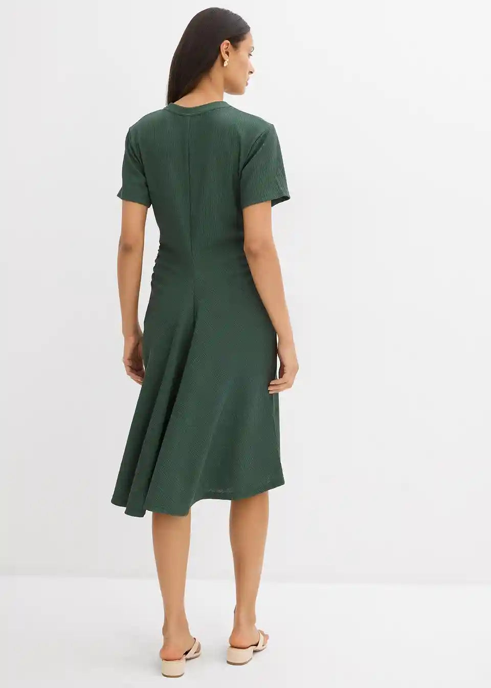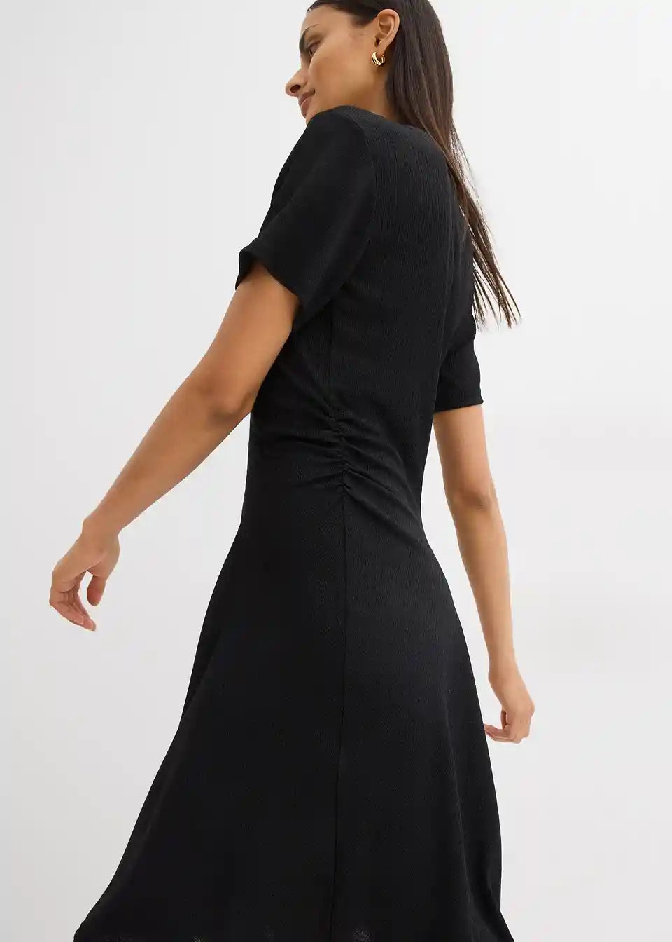 Srajčna obleka iz blaga s strukturiranim vzorcem. Okrogel izrez in kratki rokavi. Naborki v pasu ter navpični delilni šiv spredaj.