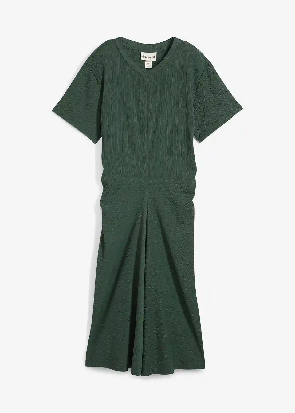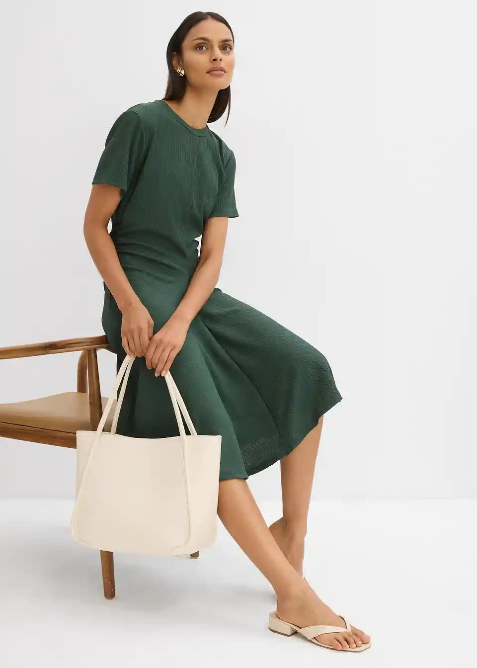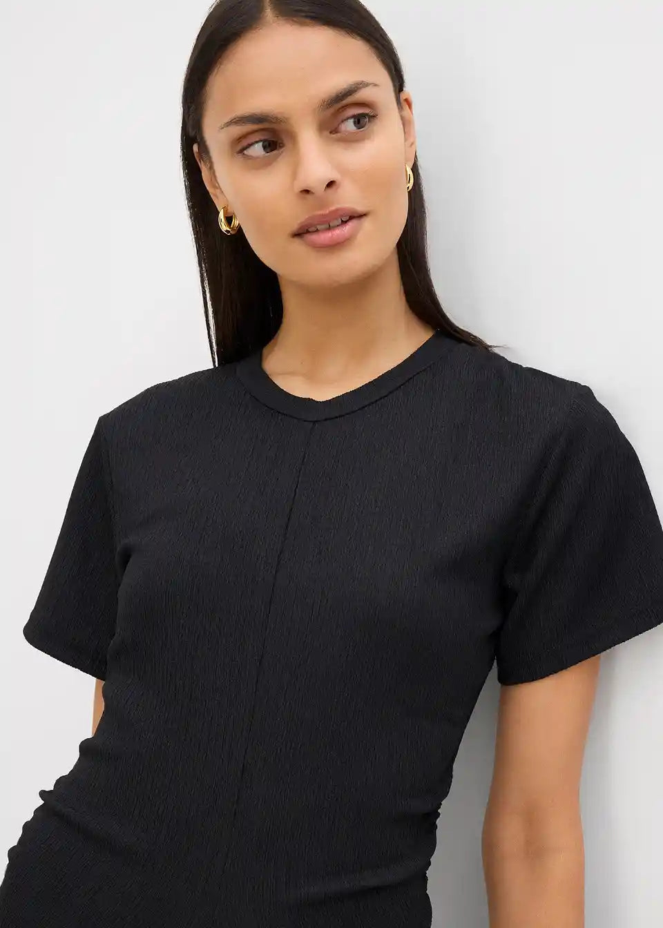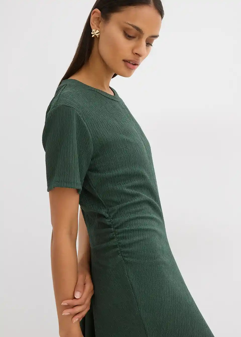 Srajčna obleka iz blaga s strukturiranim vzorcem. Okrogel izrez in kratki rokavi. Naborki v pasu ter navpični delilni šiv spredaj.