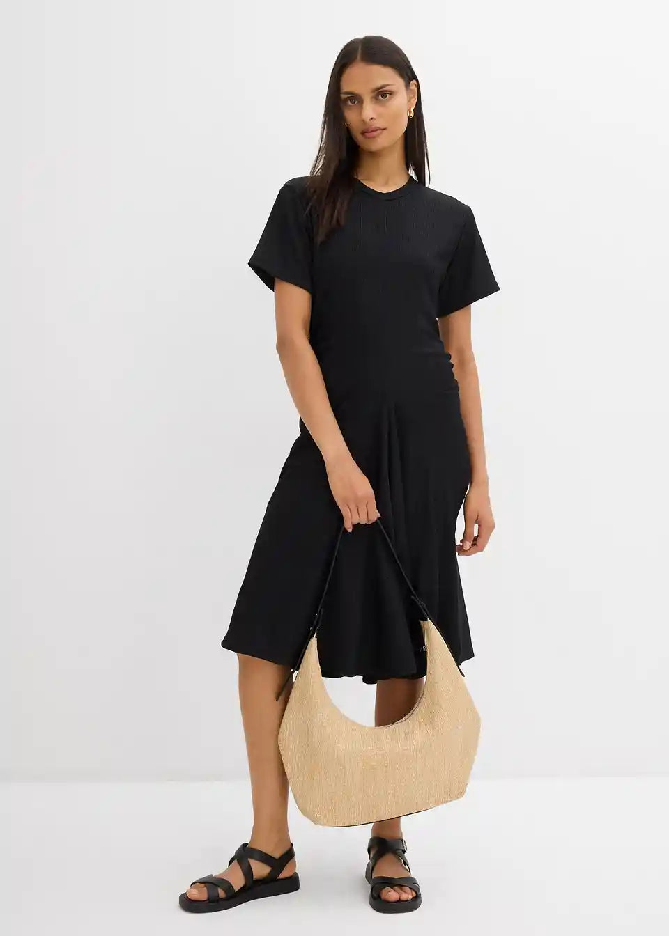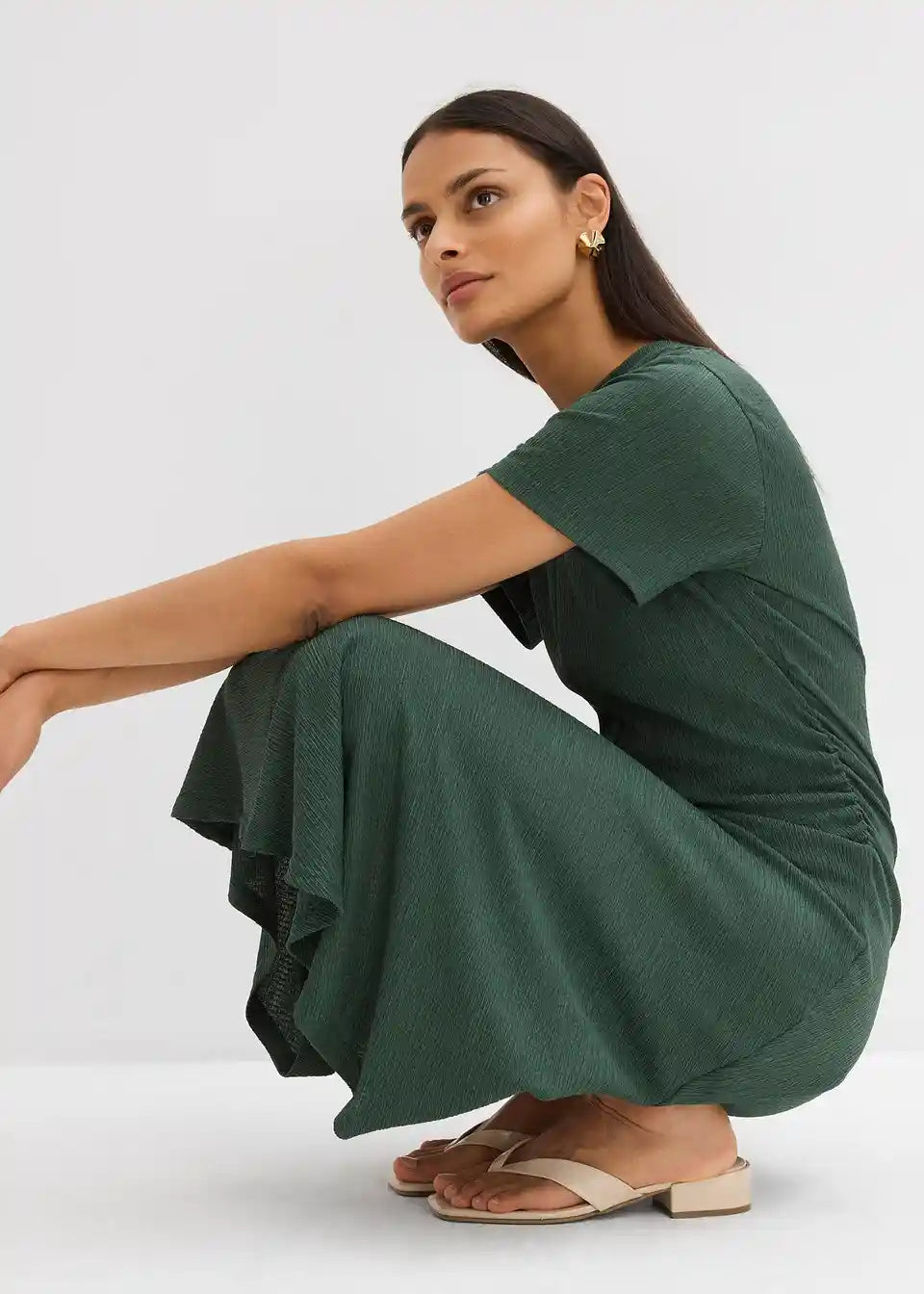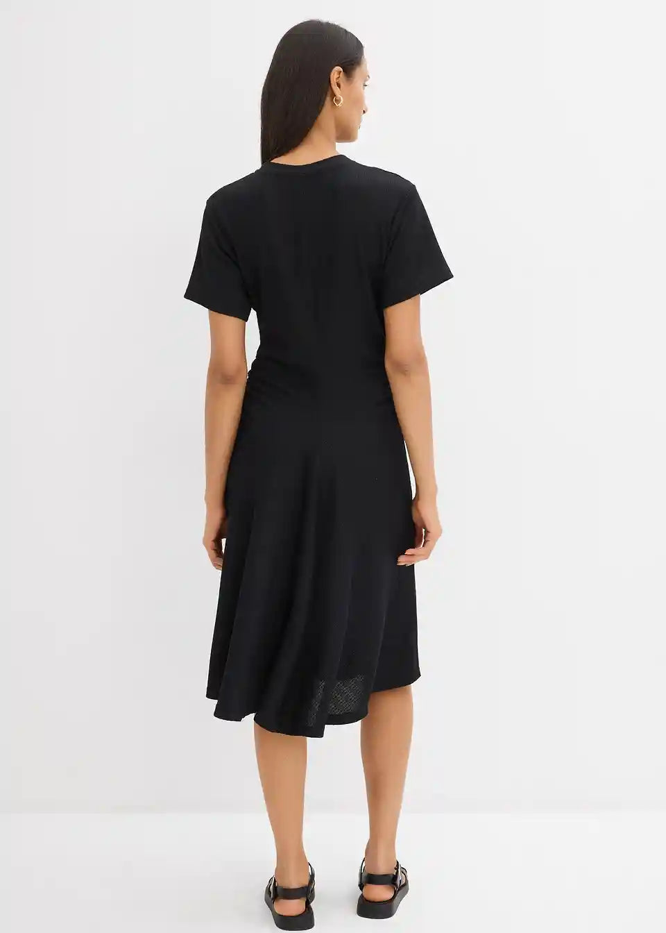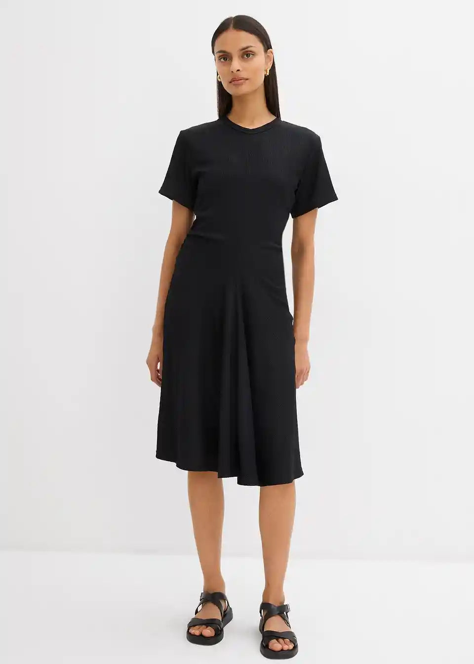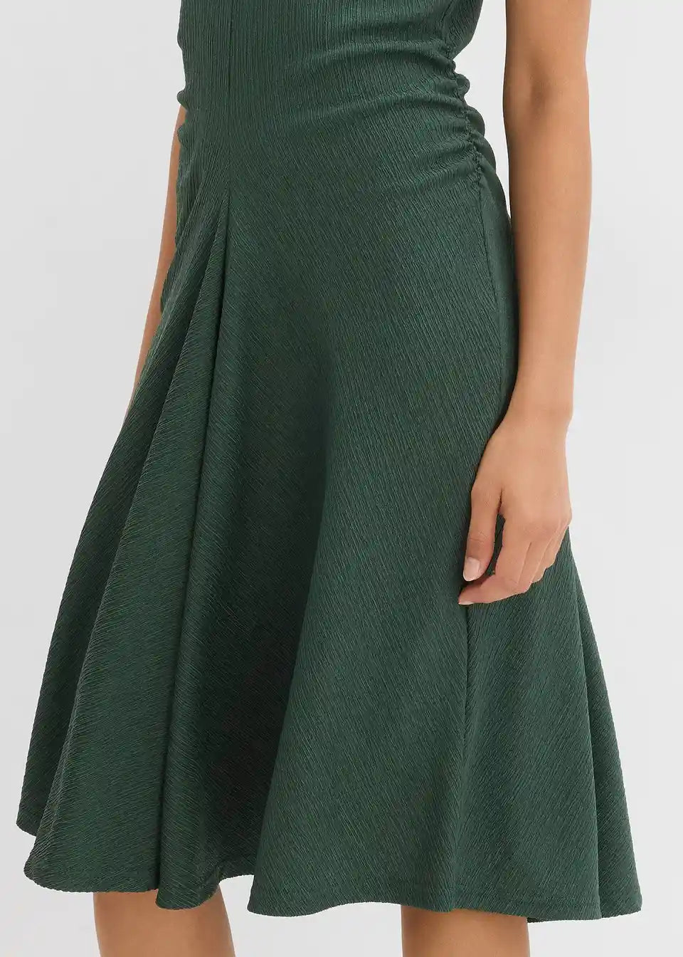 Srajčna obleka iz blaga s strukturiranim vzorcem. Okrogel izrez in kratki rokavi. Naborki v pasu ter navpični delilni šiv spredaj.