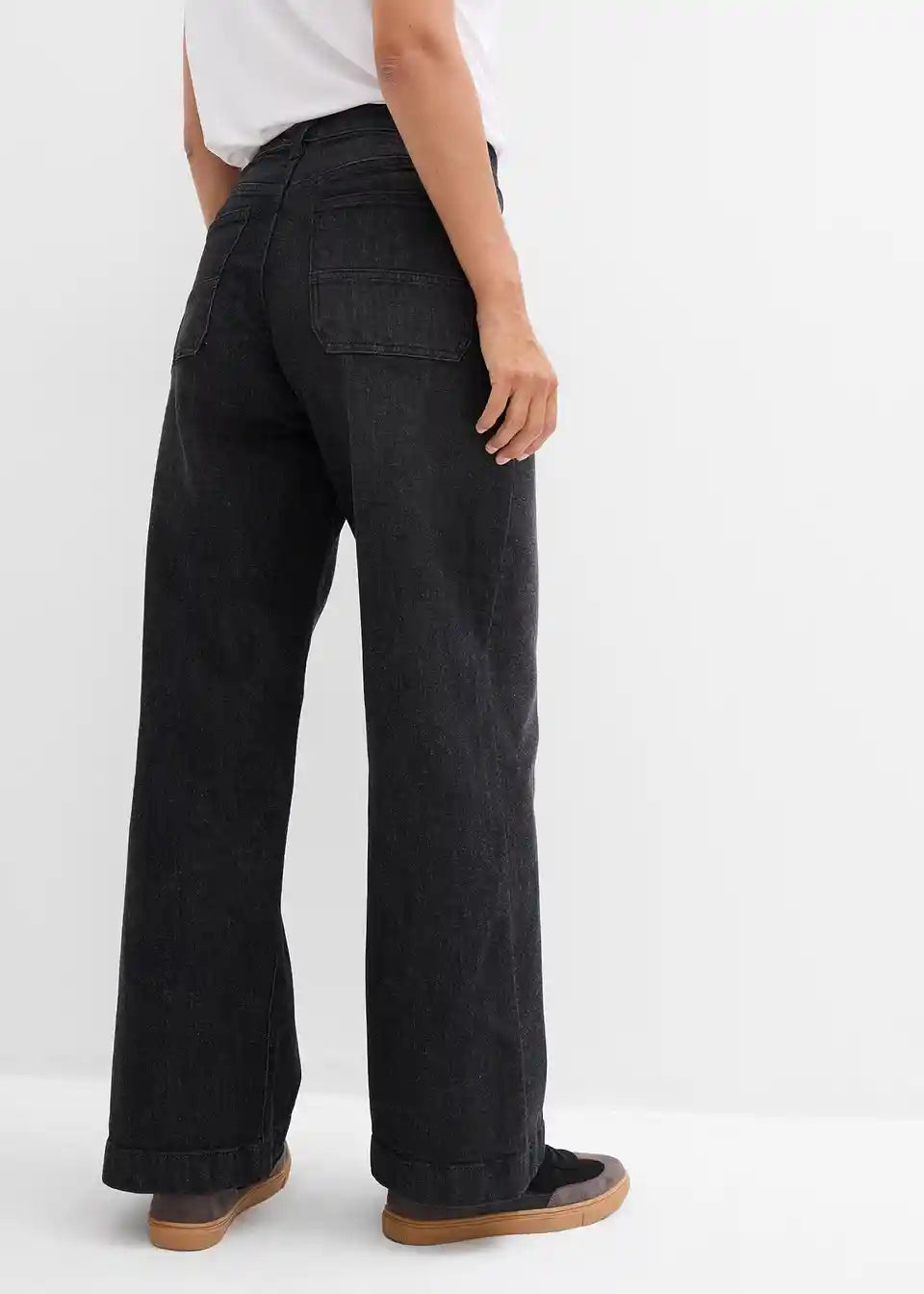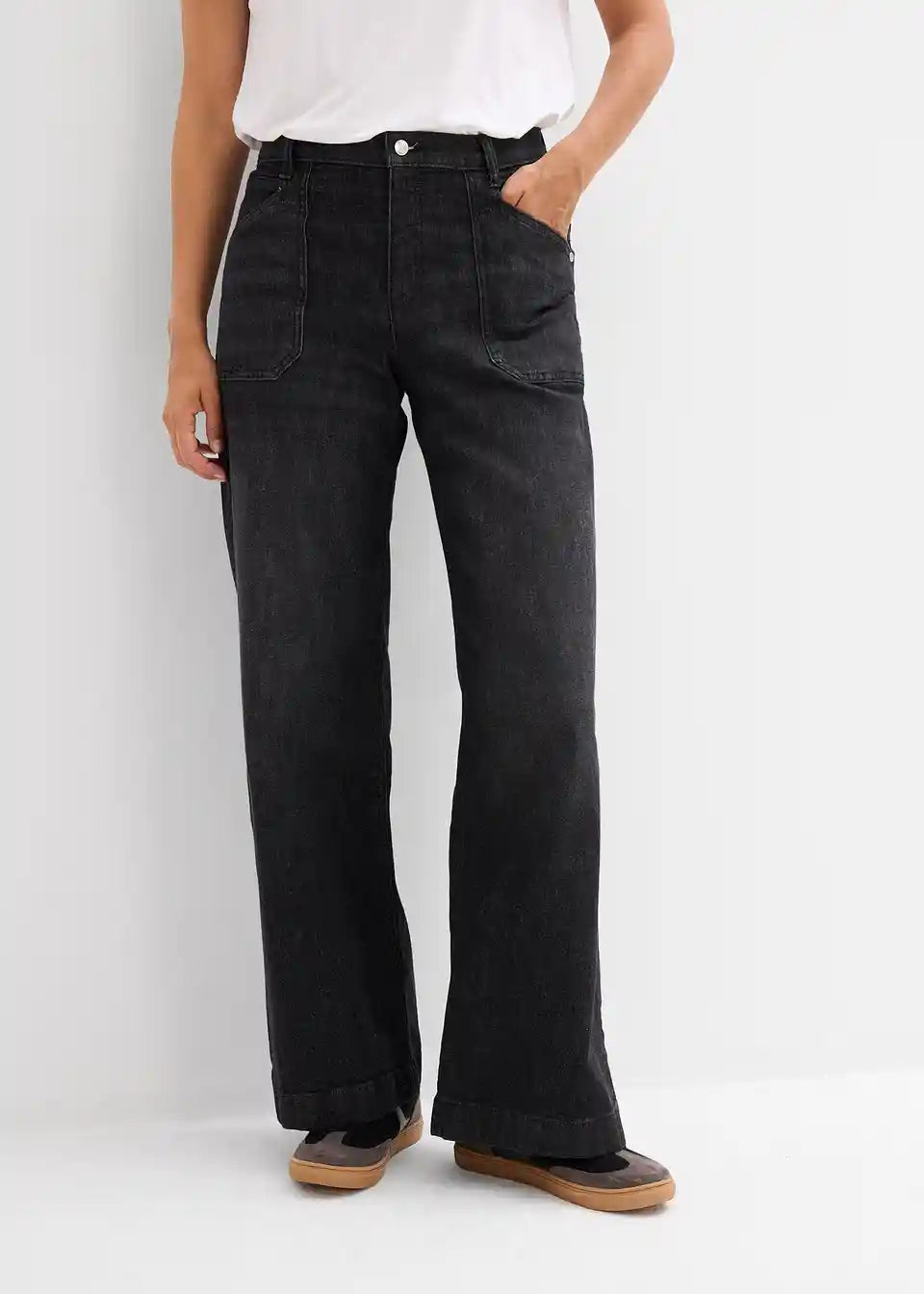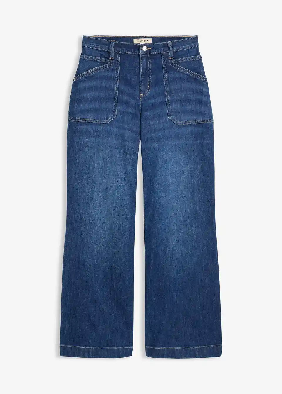 Kavbojke s širokimi hlačnicami, srednje visokim pasom in našitimi žepi