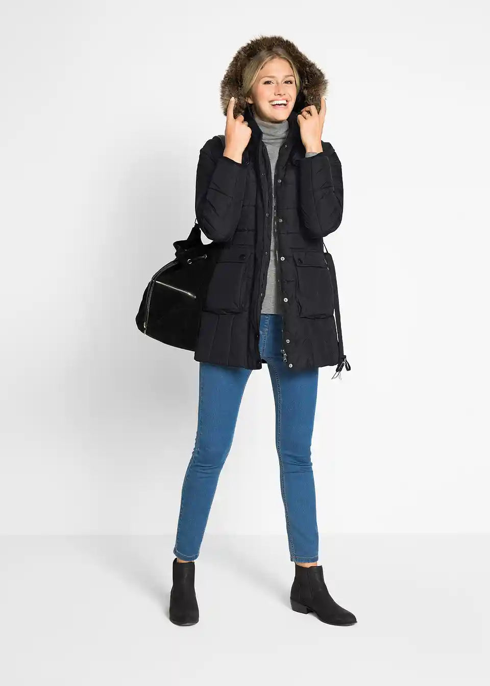 Ta jakna znamke bpc je praktičen in privlačen spremljevalec v hladnih dneh. Je toplo podložena in izdelana z rahlo prešito strukturo. Mehko umetno krzno krasi snemljivo kapuco in poskrbi za modno noto. Zimska jakna z dvema velikima žepoma se zapira z zadrgo in gumbi. S prilagodljivim pasom je mogoče poljubno regulirati širino.