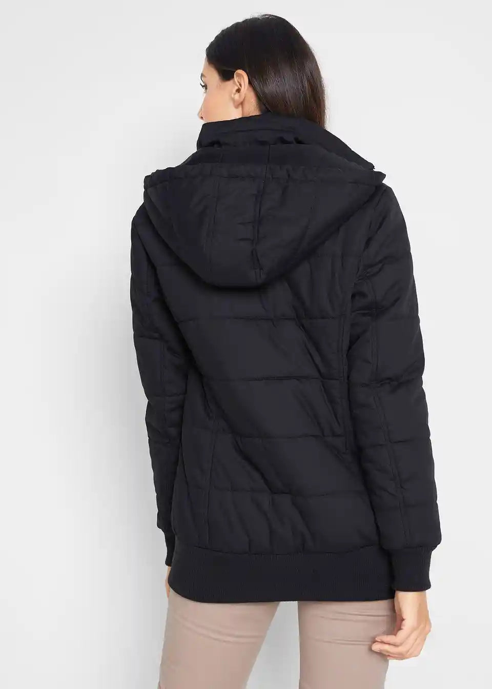 Udobna prešita jakna s kapuco, rebrastimi patentnimi robovi in žepi z zadrgo, podložena