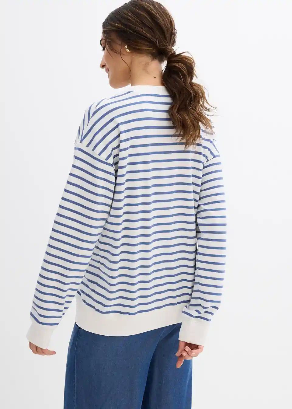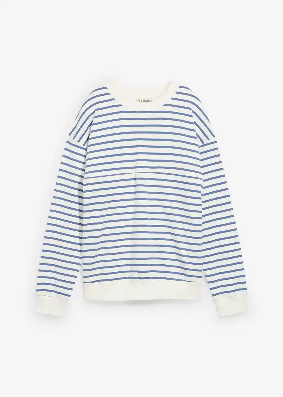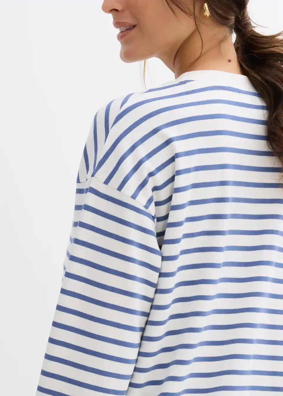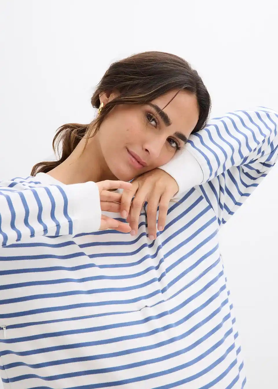 Črtasta nosečniška majica izmehkega neprosojnega jerseyja iz ekološkega bombaža z izjemno diskretno funkcijo za dojenje. Zadrge na obeh straneh omogočajo udobno in nekomplicirano dojenje za mati in otroka.