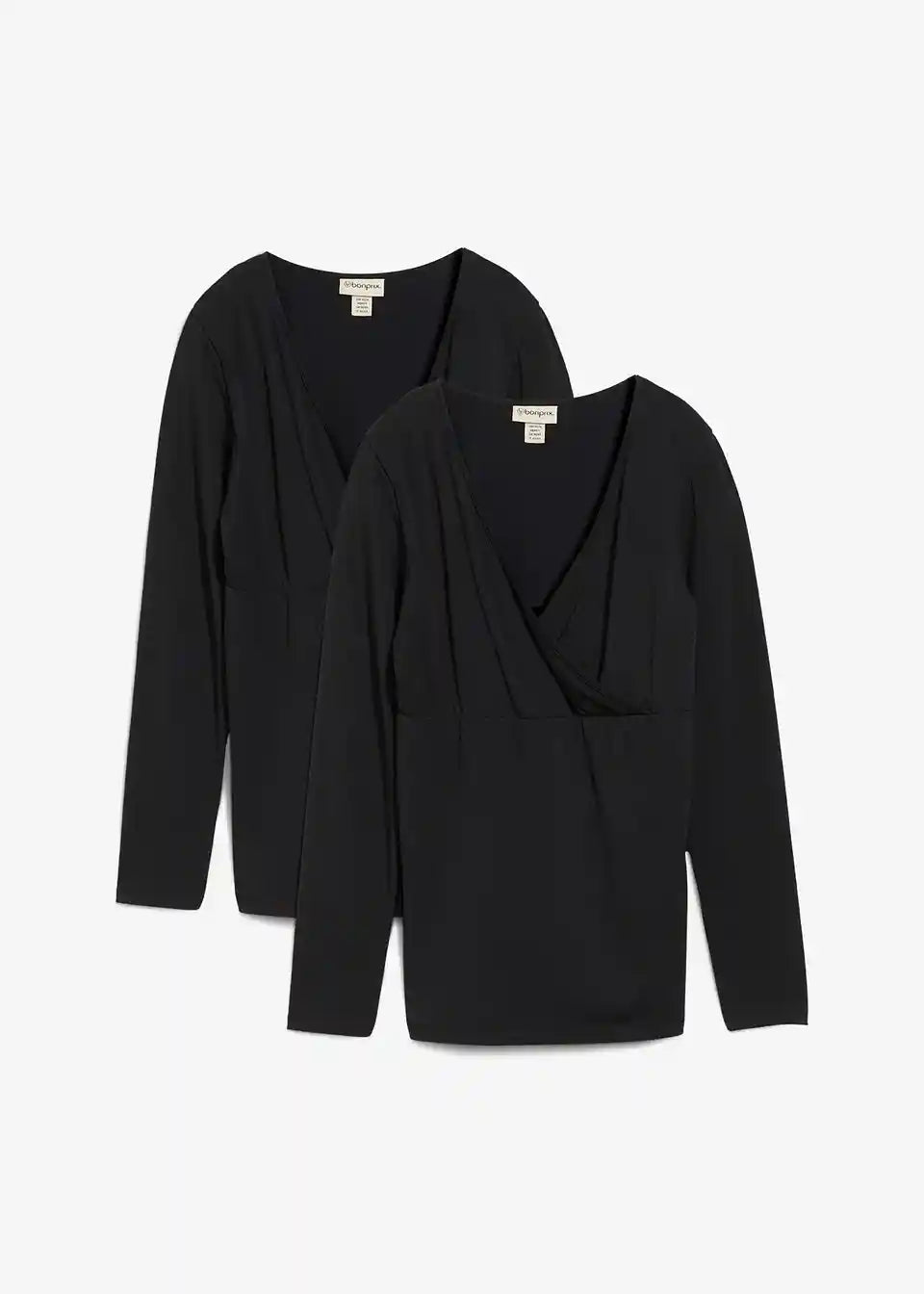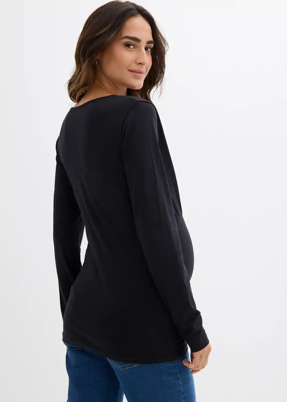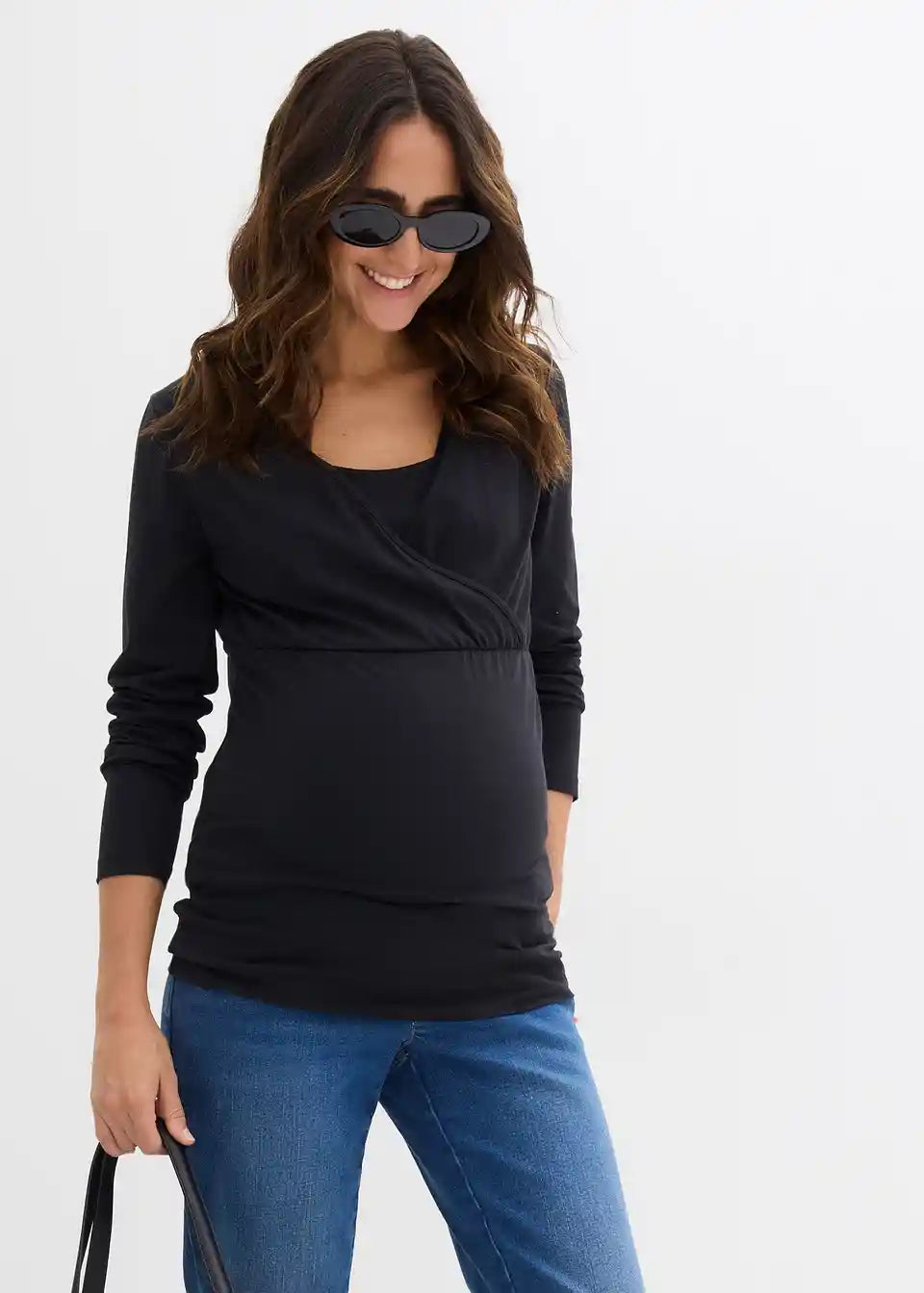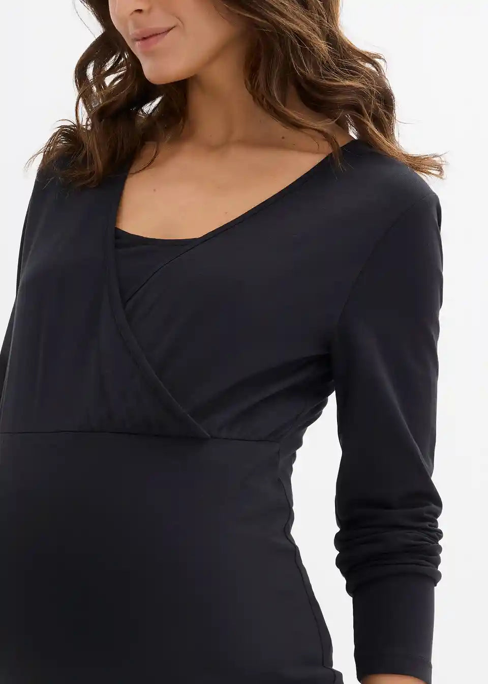 Majice z dolgimi rokavi iz mehkega džersija iz ekološkega bombaža z malo raztegljivosti za udobno nošenje. Imajo V-izrez v preklopnem videzu z diskretno funkcijo za dojenje in kratkimi rokavi prijetne dolžine. Dizajn z dvojnimi sloji pomaga preprečiti izgubo toplote in omogoča udobno dojenje za mamico in otroka.