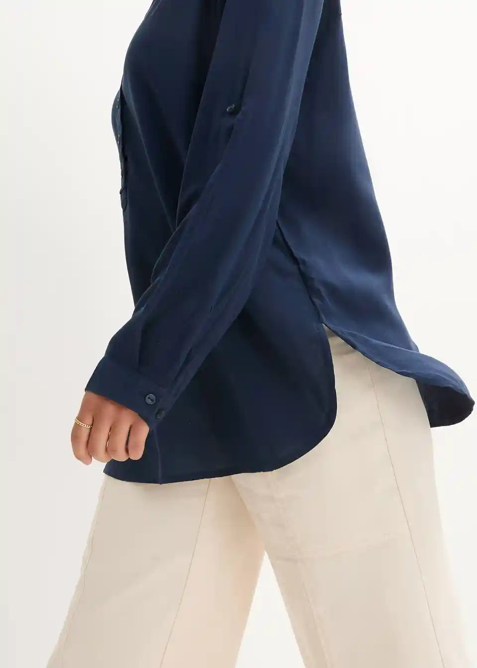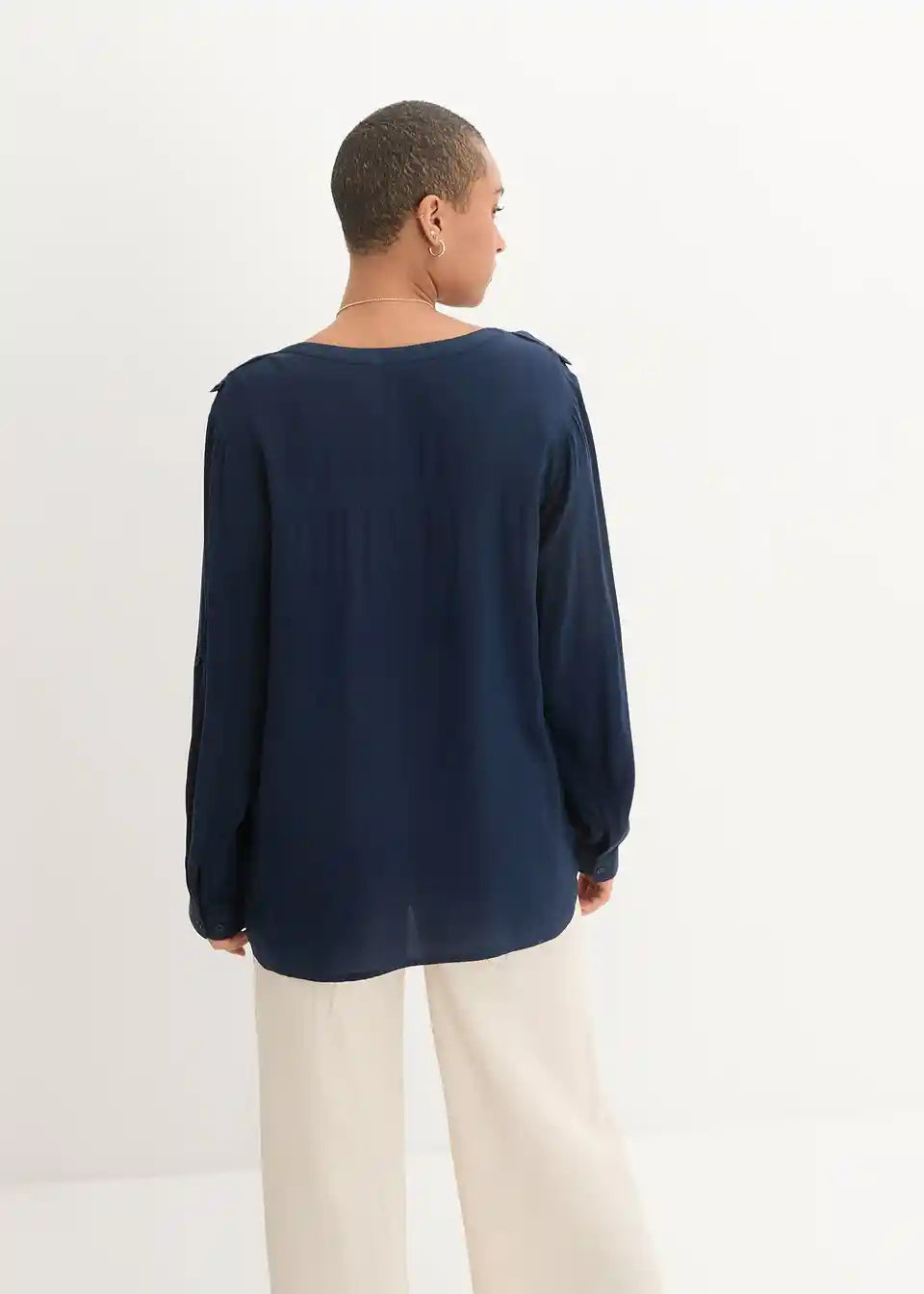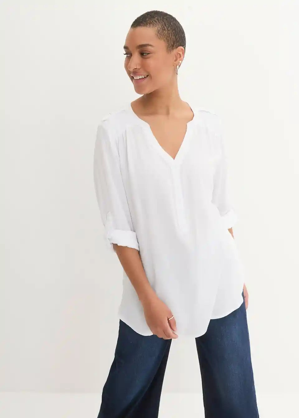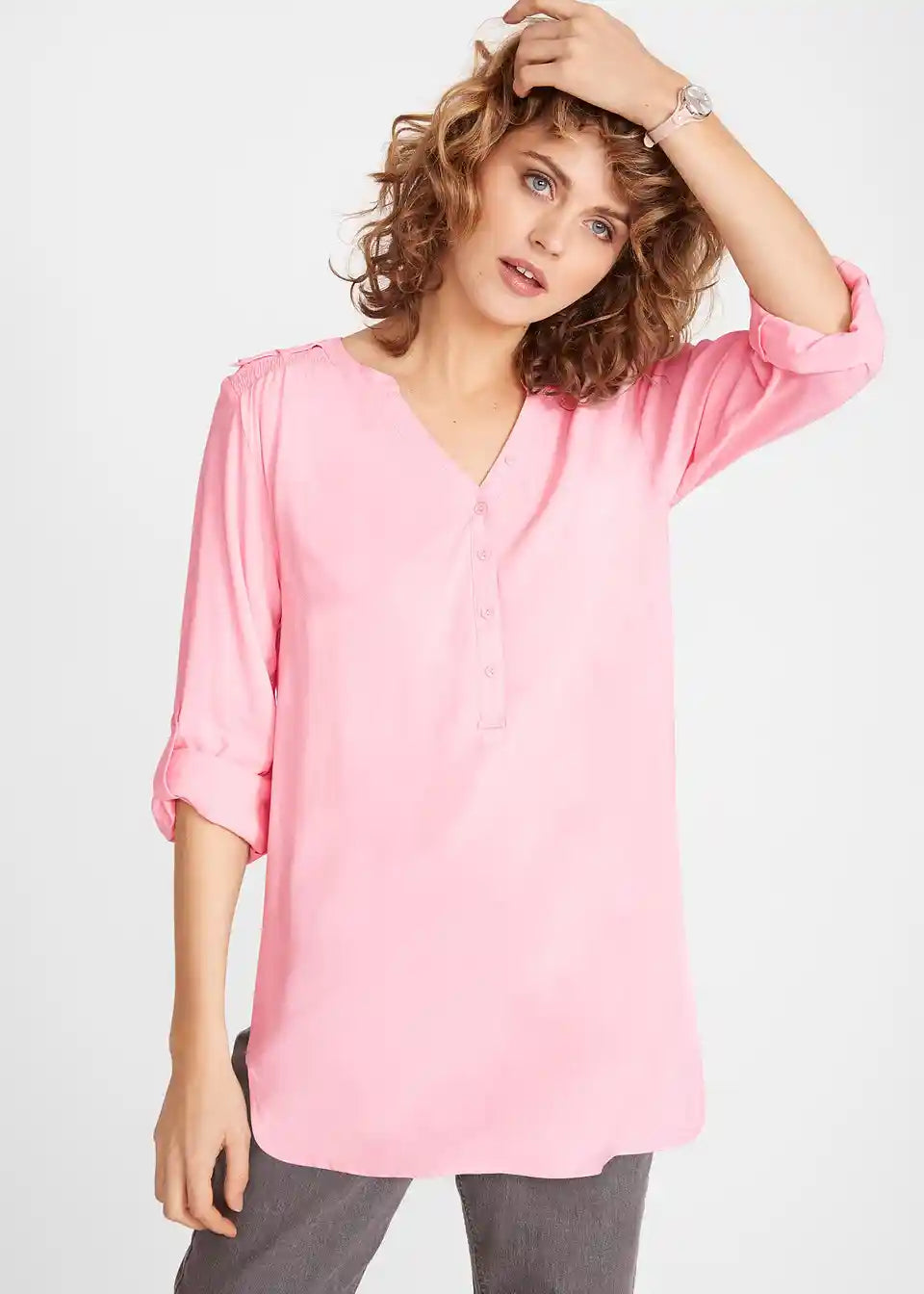 V tej sezoni je za sproščen videz ključna bluzasta tunika iz kakovostnega bluznega materiala z dolgimi rokavi. Ta model prepriča z ležernim krojem in detajli, kot so majhne zanke na rokavih za zavihan videz. Tunika ima zaobljen rob in V-izrez, ki prehaja v kratko zapenjanje na gumbe. Ne glede na to, ali jo nosite casual z jeansom ali igrivo s kavbojskim krilom in balerinkami: Bluza iz bpc kolekcije omogoča številne kombinacije.