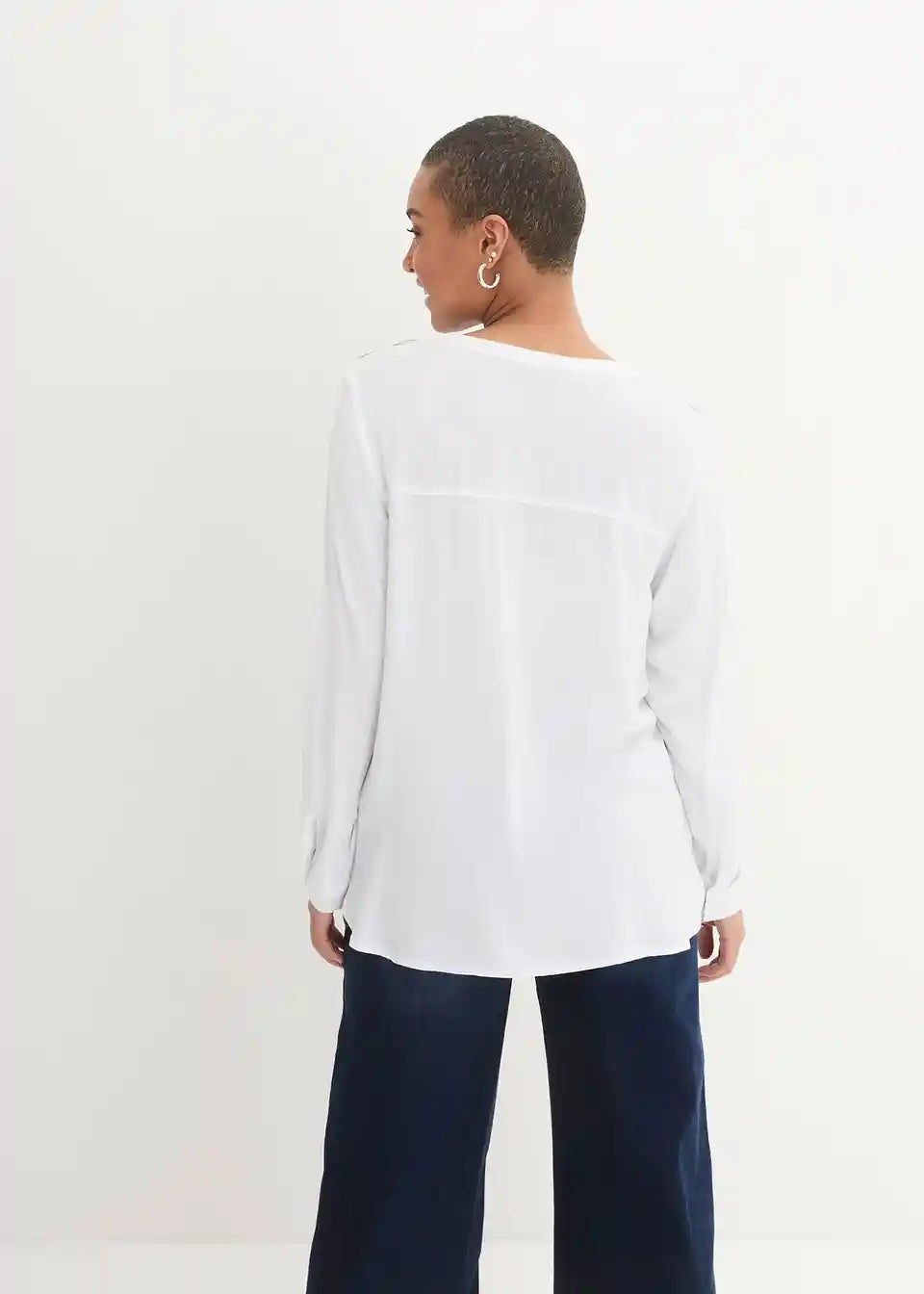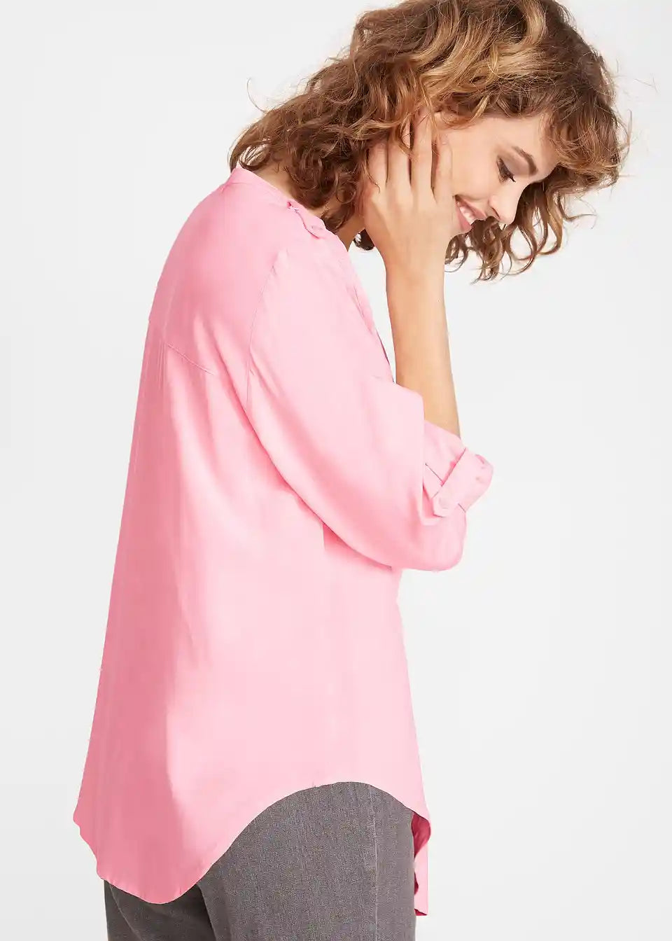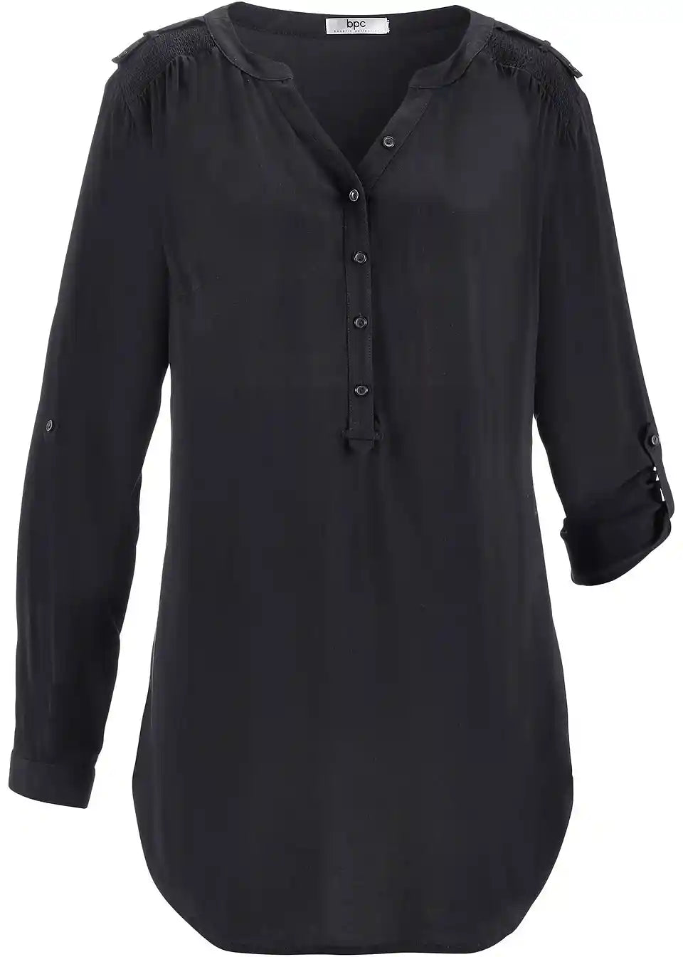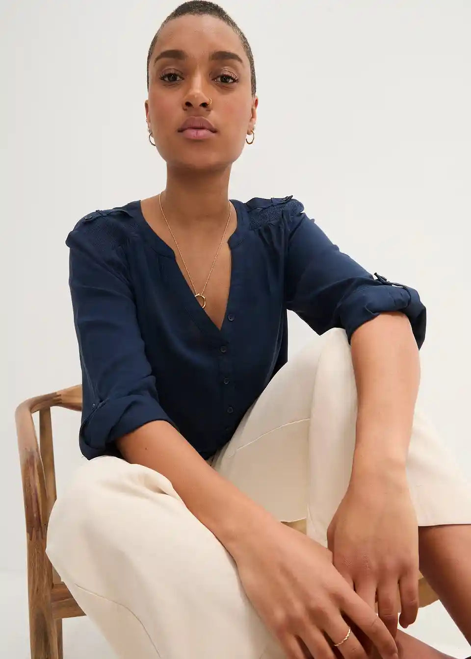 V tej sezoni je za sproščen videz ključna bluzasta tunika iz kakovostnega bluznega materiala z dolgimi rokavi. Ta model prepriča z ležernim krojem in detajli, kot so majhne zanke na rokavih za zavihan videz. Tunika ima zaobljen rob in V-izrez, ki prehaja v kratko zapenjanje na gumbe. Ne glede na to, ali jo nosite casual z jeansom ali igrivo s kavbojskim krilom in balerinkami: Bluza iz bpc kolekcije omogoča številne kombinacije.