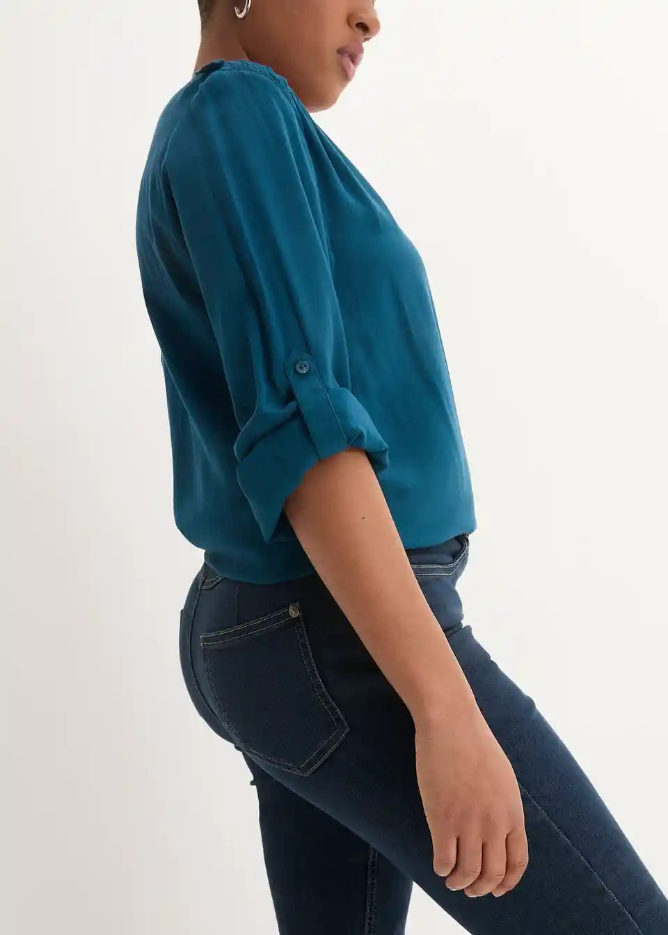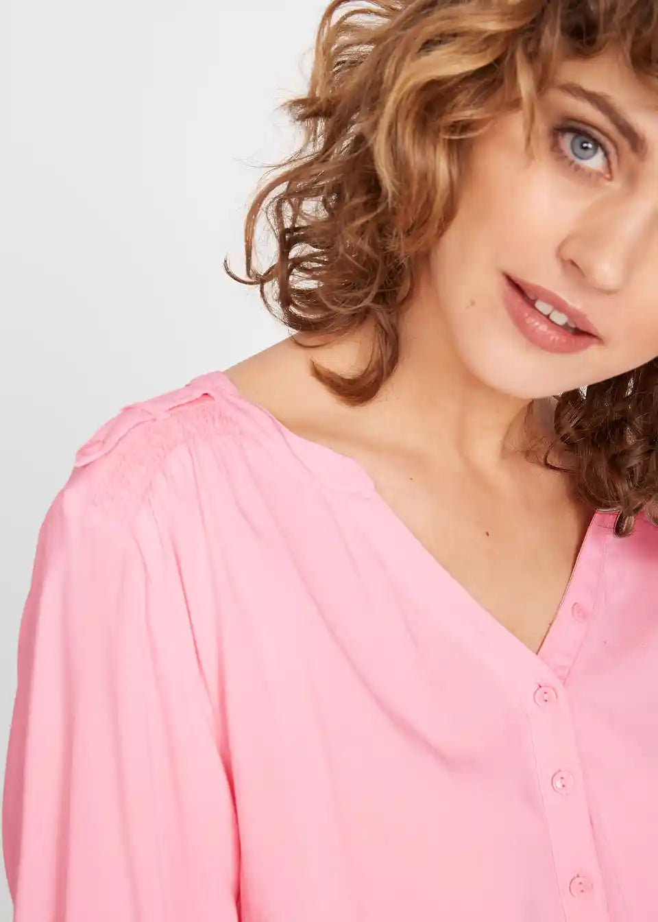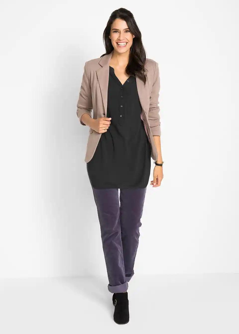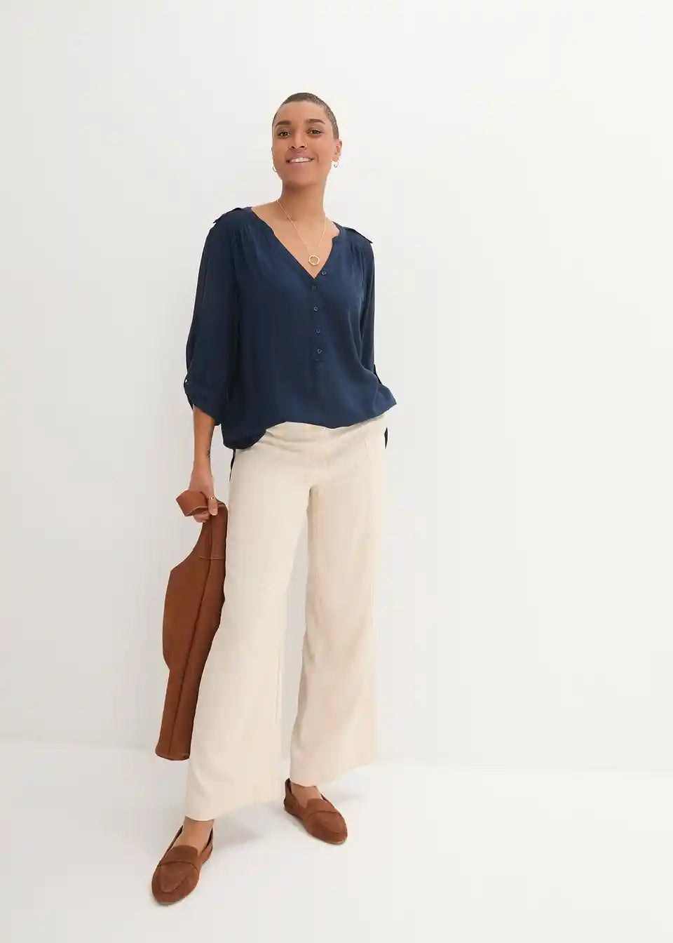 V tej sezoni je za sproščen videz ključna bluzasta tunika iz kakovostnega bluznega materiala z dolgimi rokavi. Ta model prepriča z ležernim krojem in detajli, kot so majhne zanke na rokavih za zavihan videz. Tunika ima zaobljen rob in V-izrez, ki prehaja v kratko zapenjanje na gumbe. Ne glede na to, ali jo nosite casual z jeansom ali igrivo s kavbojskim krilom in balerinkami: Bluza iz bpc kolekcije omogoča številne kombinacije.