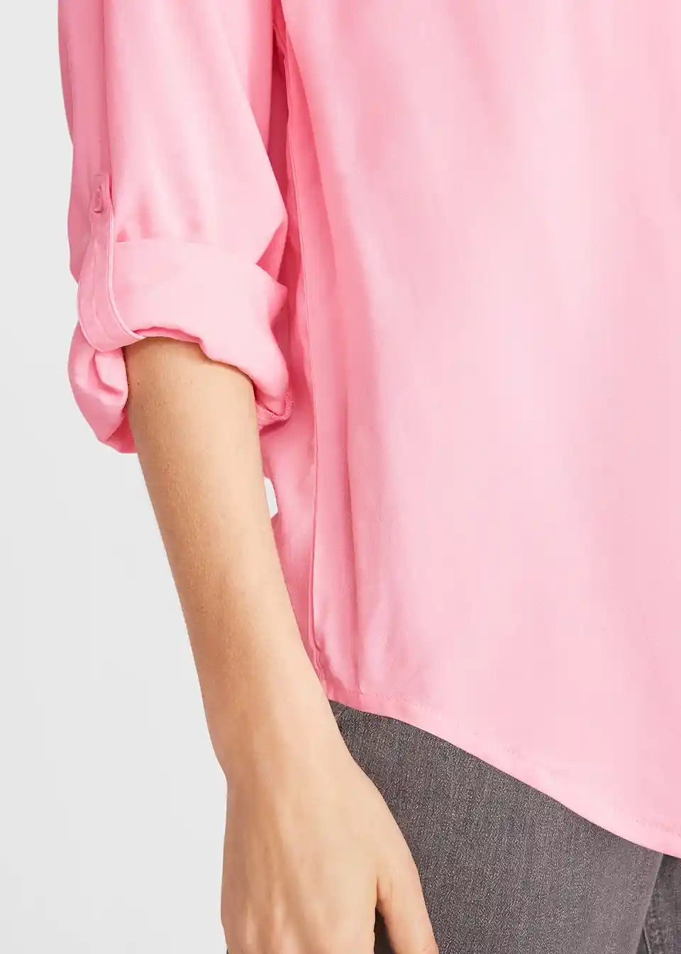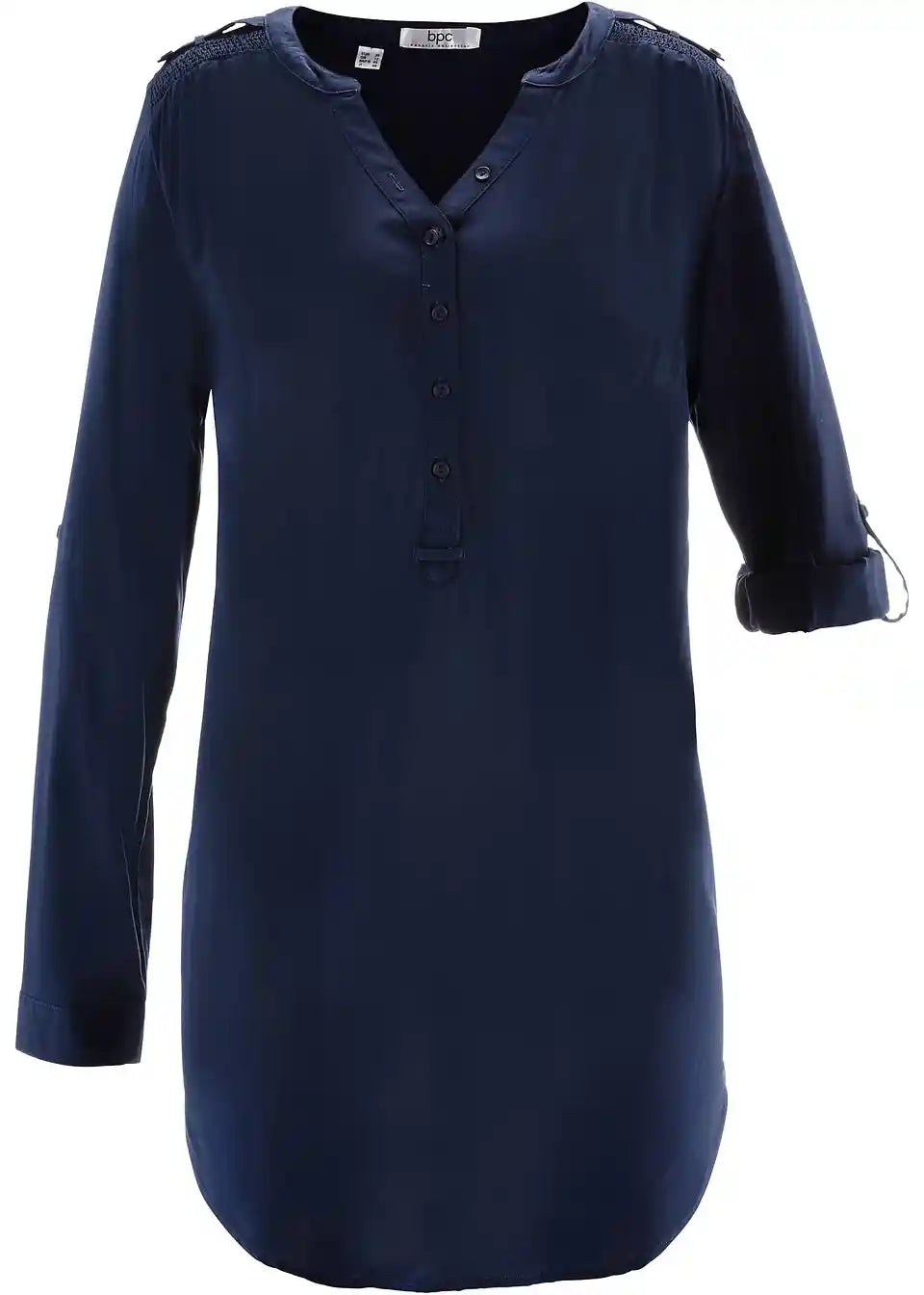 Bluzasta tunika, ki laskavo poudari obliko, z dolgimi rokavi, zaobljenim robom in zapenjanjem na gumbe