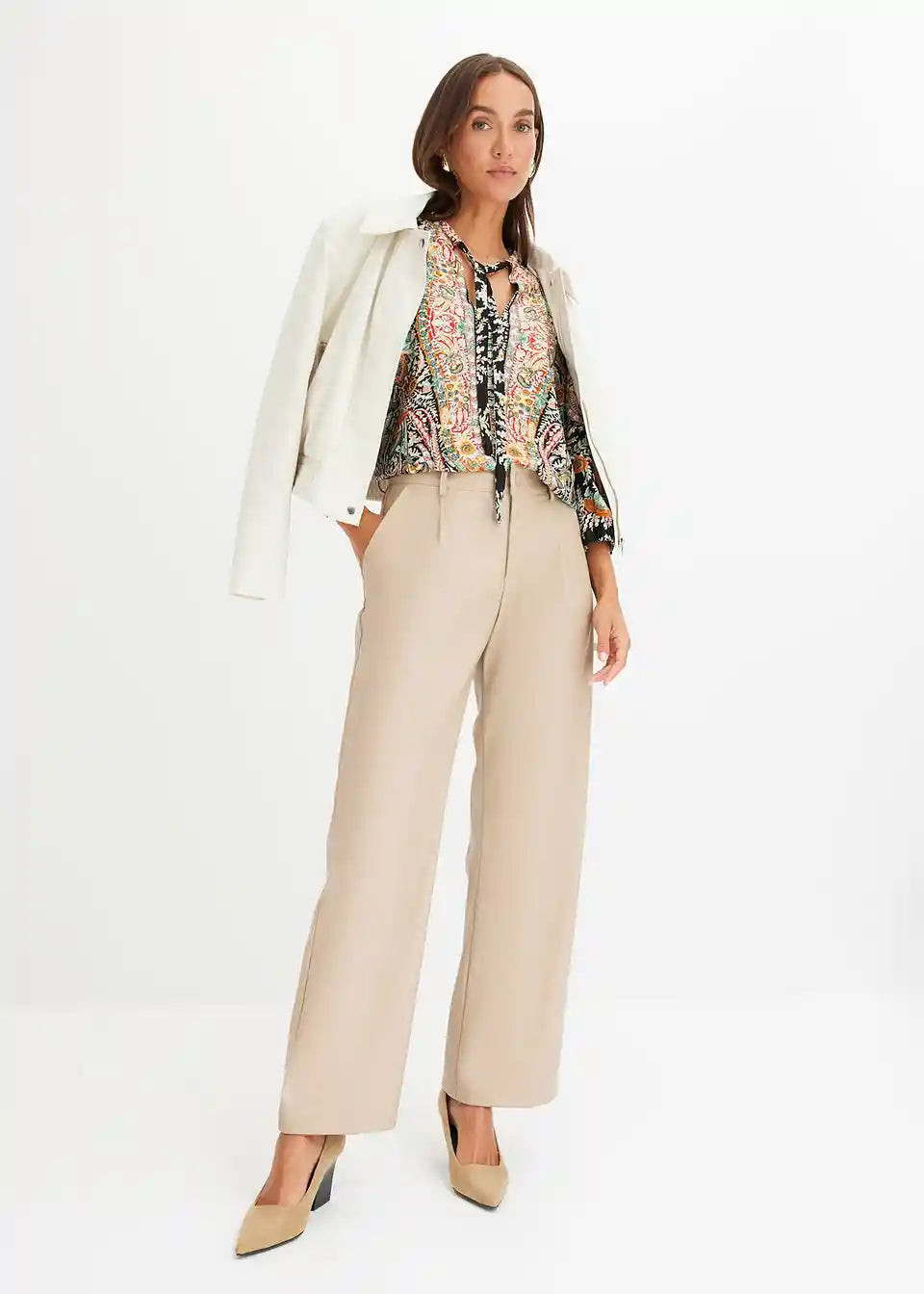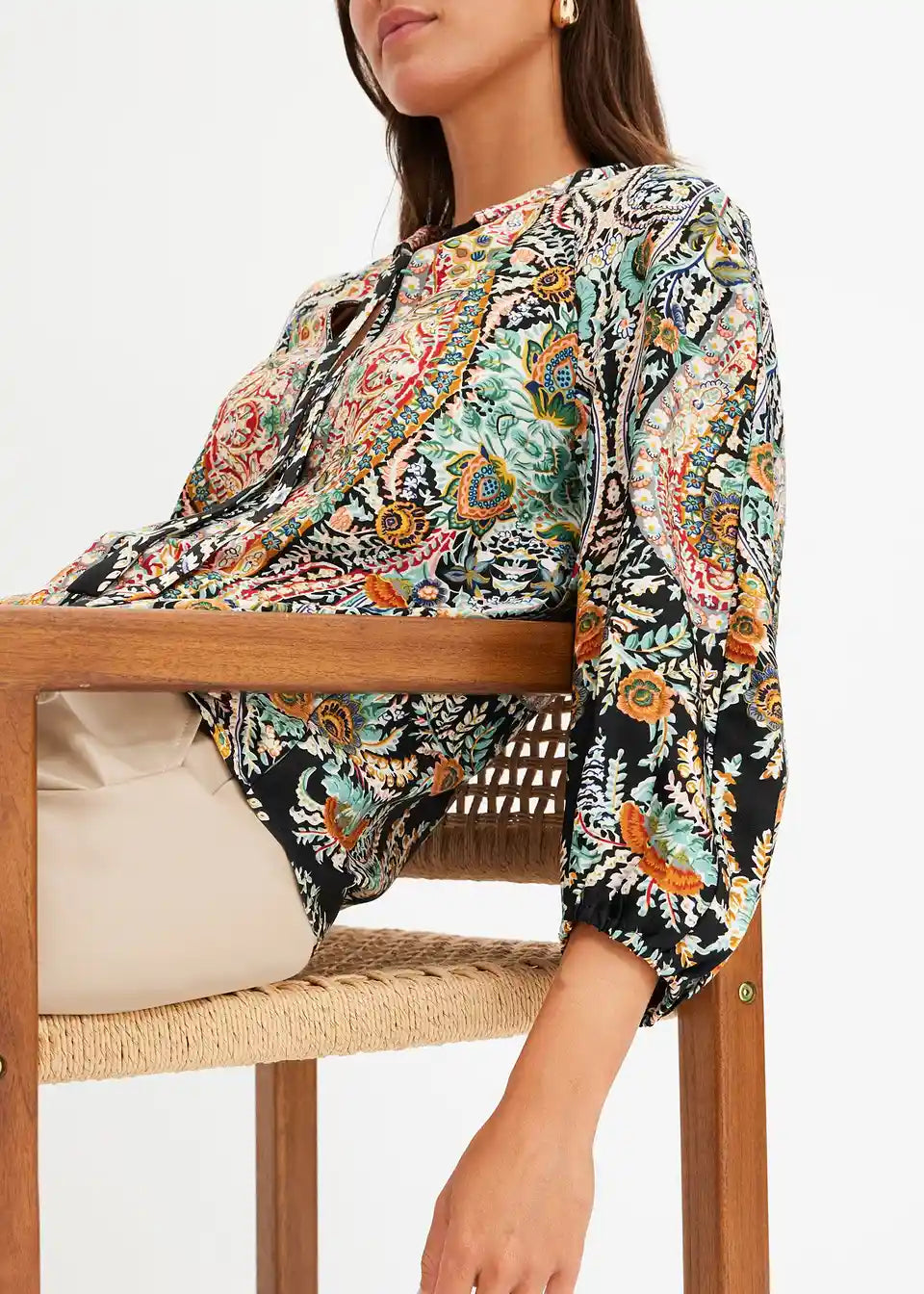 potiskana satinasta bluza s sprednjo vezalko pri izrezu
