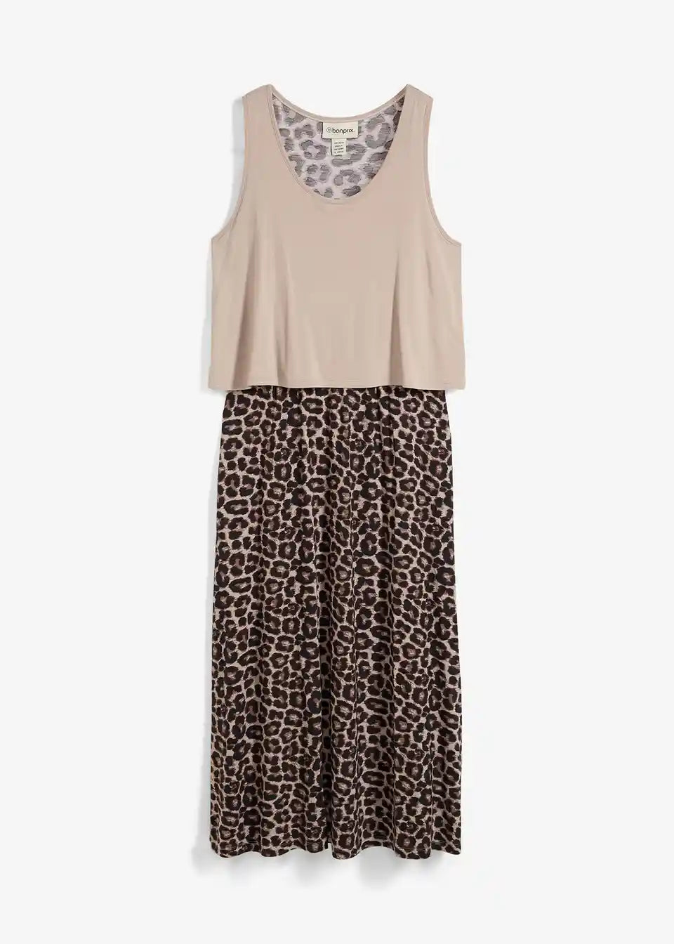 Telesni obliki lepo pristajajoča dolga obleka v kroju majice v modnem večplastnem videzu