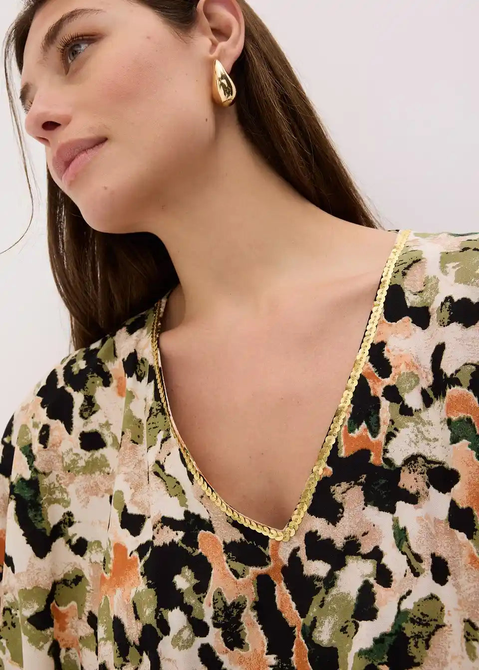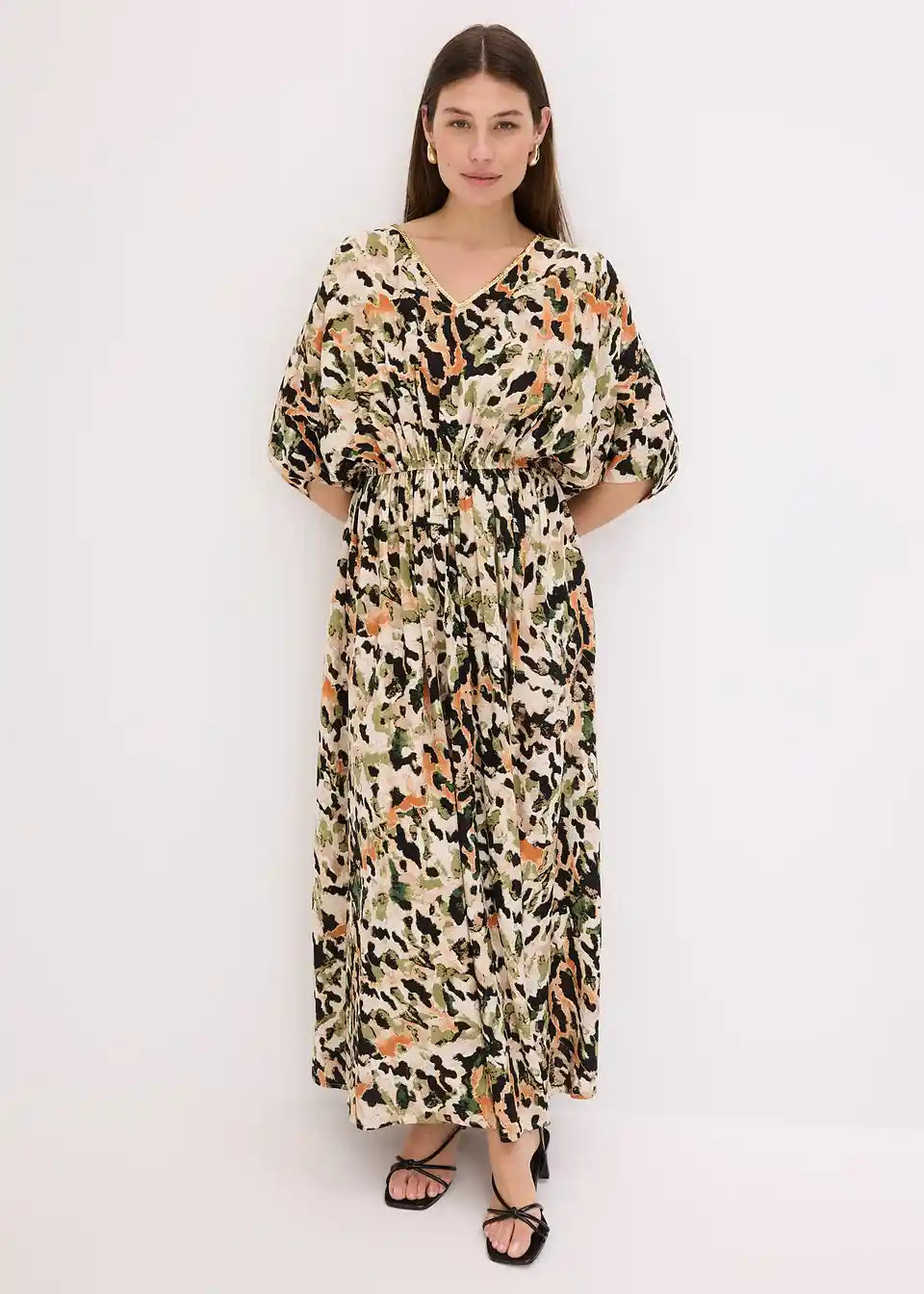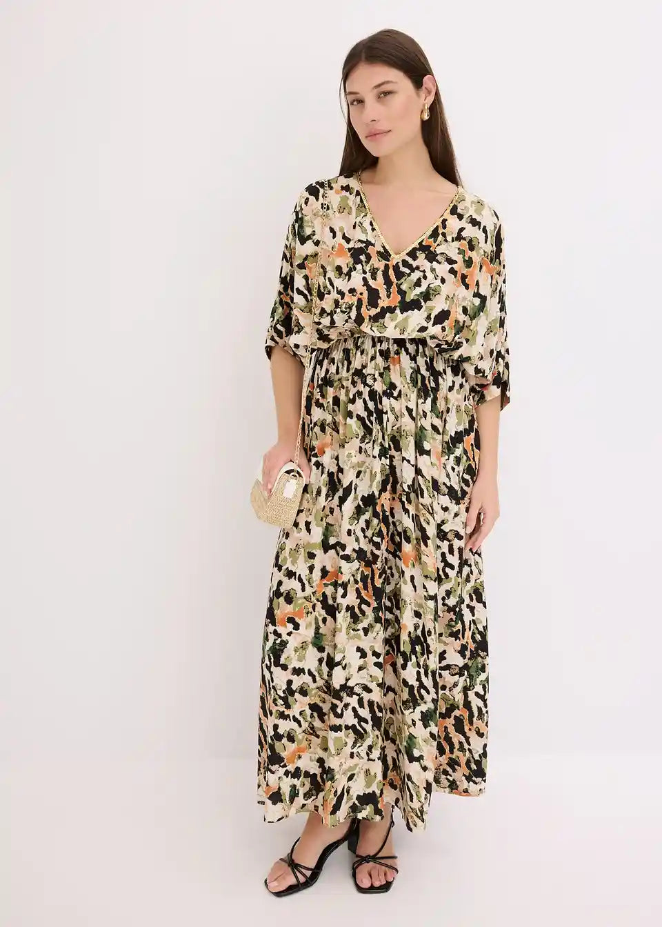 modno potiskana maksi obleka iz padajoče viskoze z dekorativno aplikacijo iz bleščic spredaj ob V-izrezu