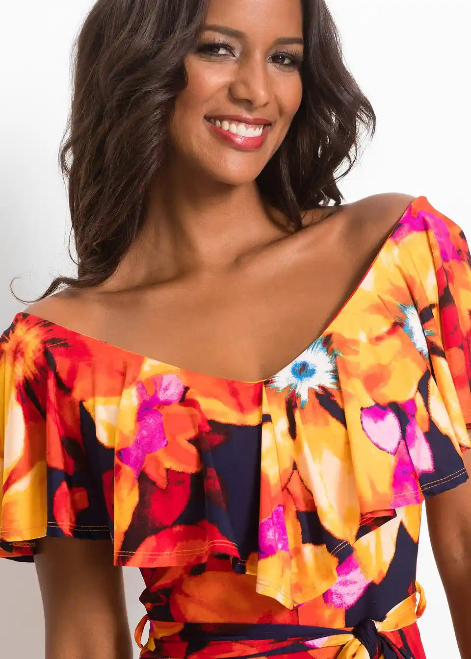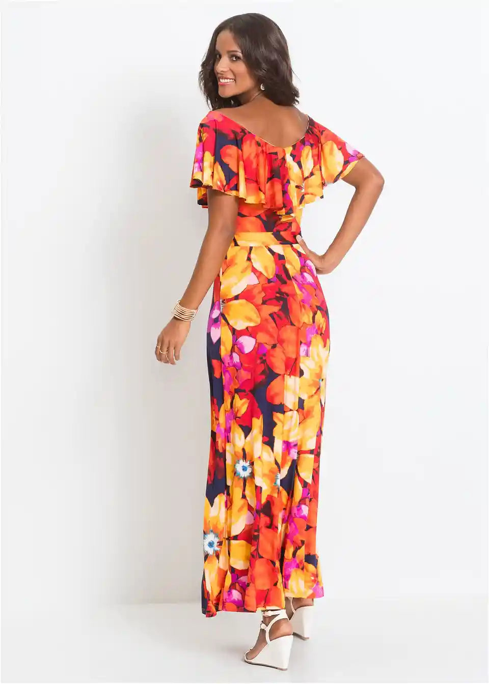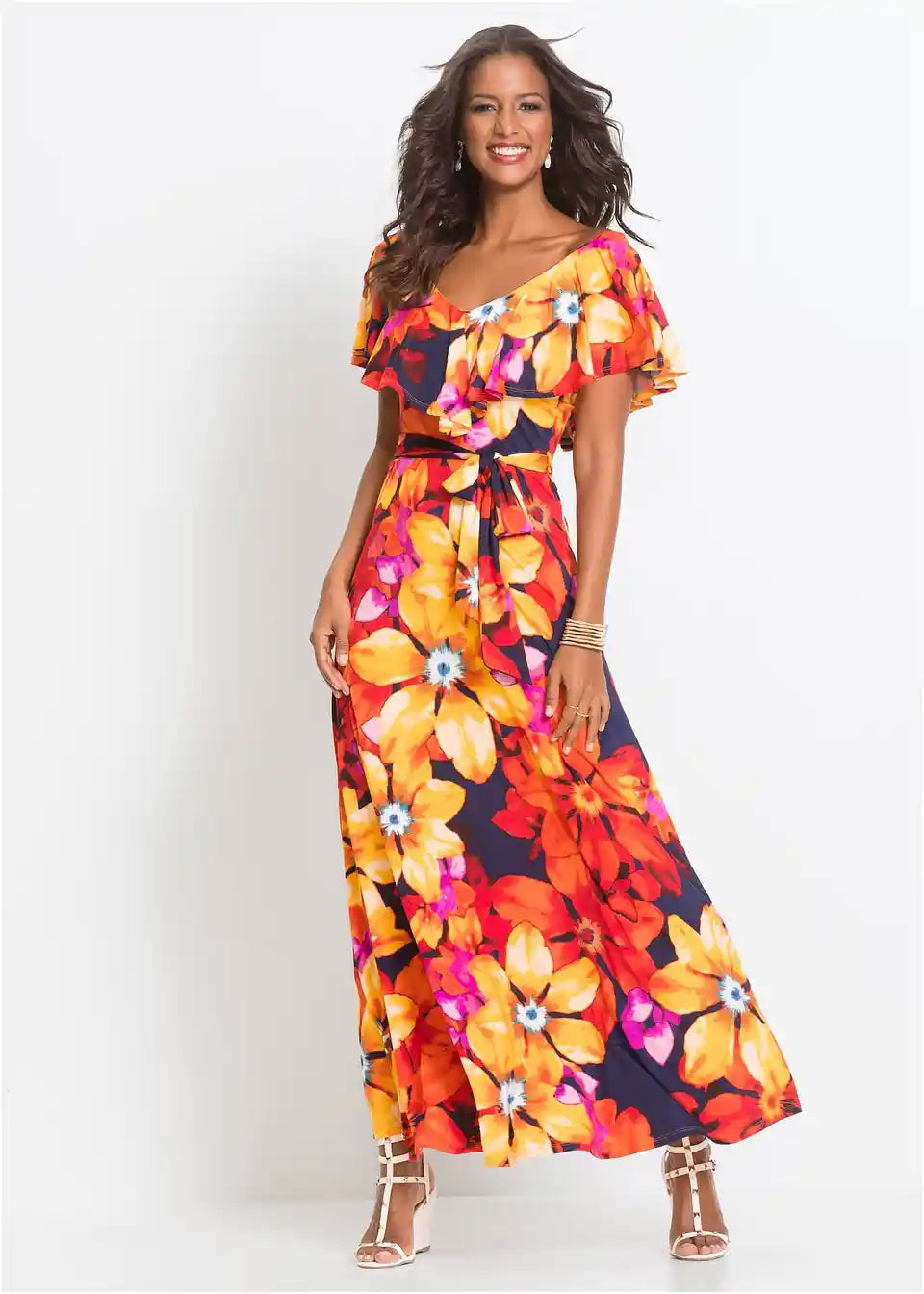 Preprosto očarljivo. Ta čudovita obleka z volanom in vezalnim pasom je nujen kos za vsako garderobo. Dolžina pri št. 36/38 približno 136 cm.