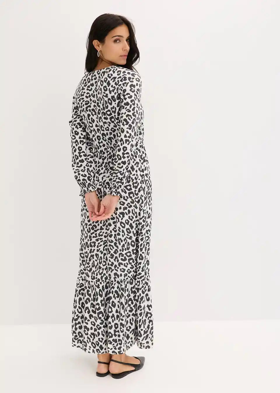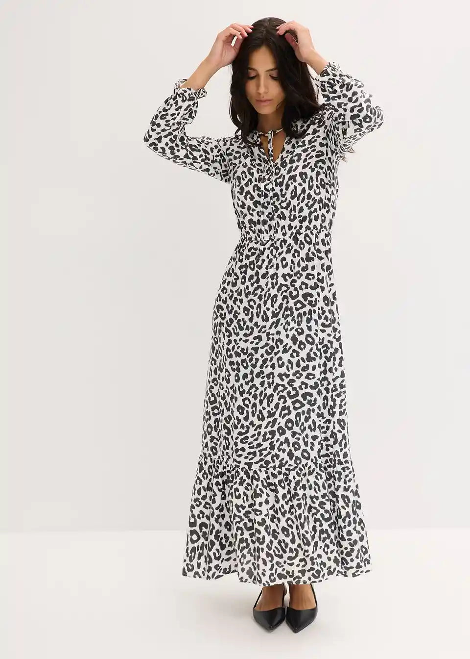 Dolga obleka z volani in trakom za zavezovanje na izrezu