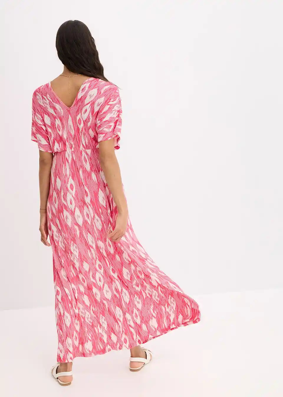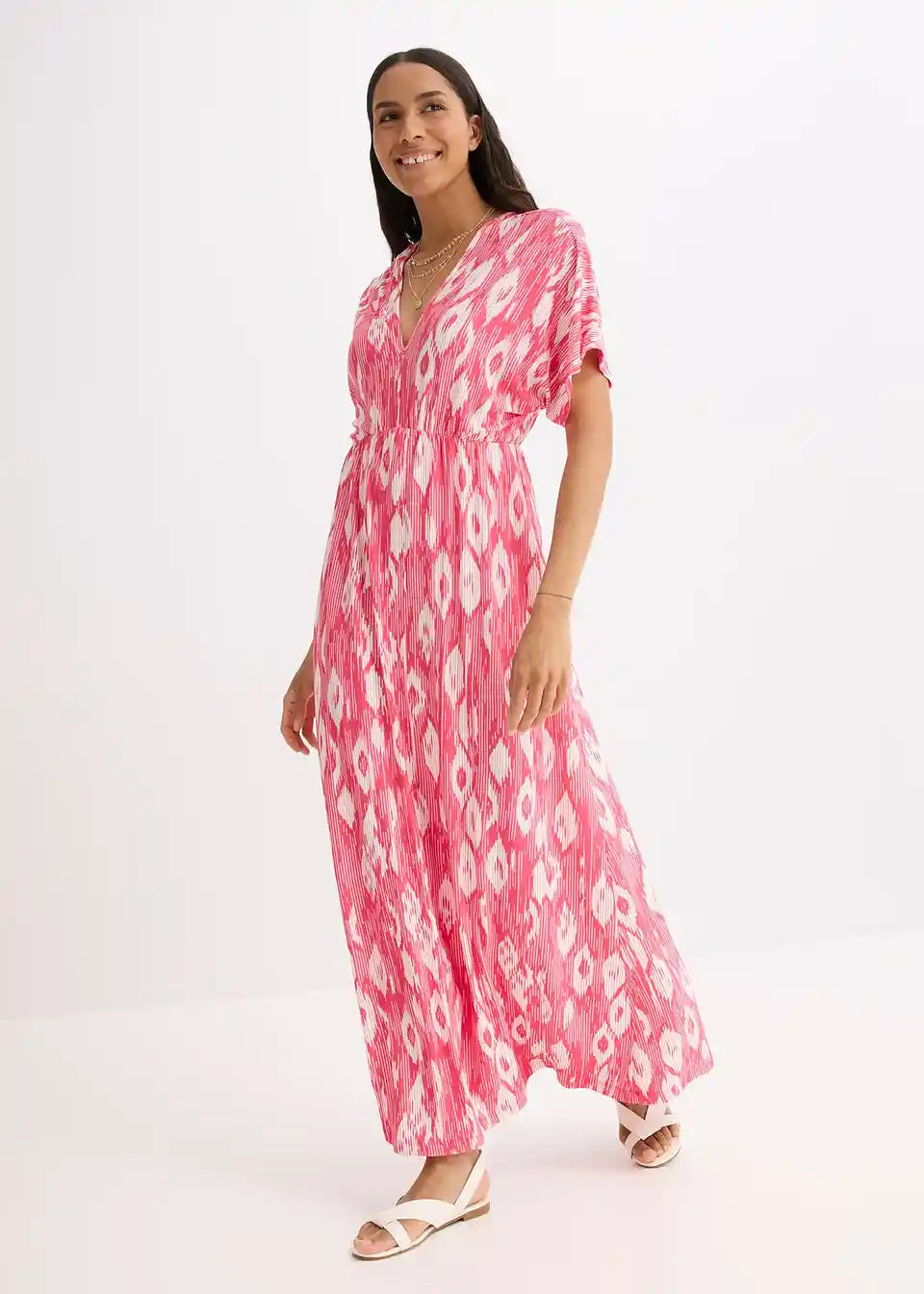 modno potiskana jerseyeva obleka v maksimalni dolžini s širokimi rokavi in globokim V-izrezom spredaj