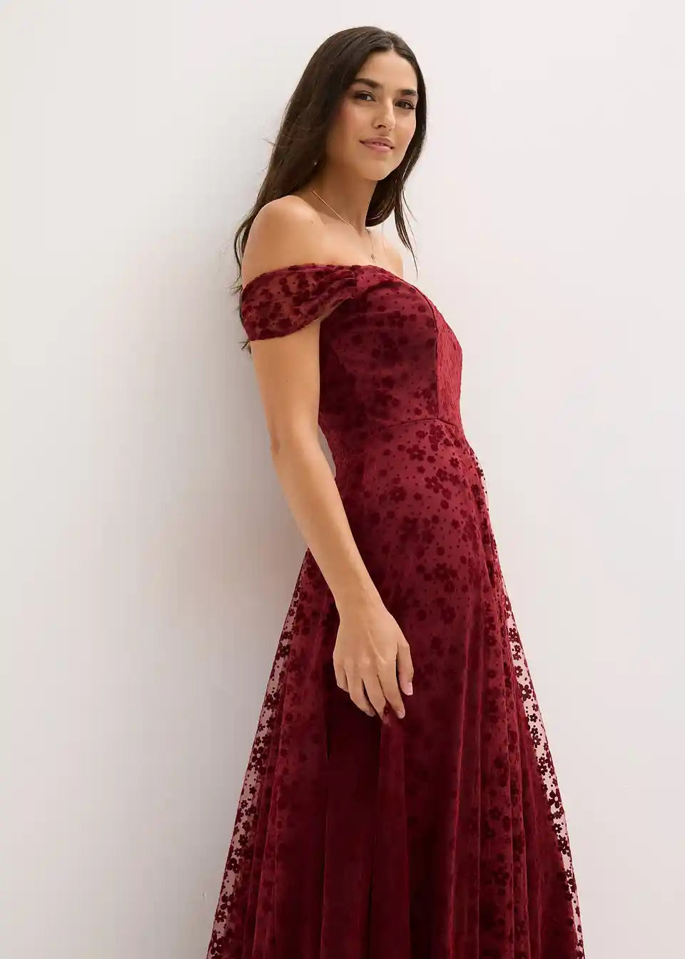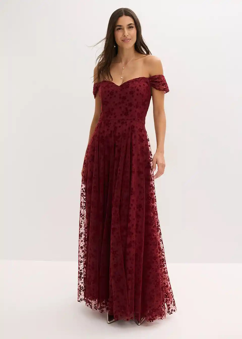 Romantična večerna obleka iz nežnega tila s cvetličnim vzorcem in carmen izrezom
