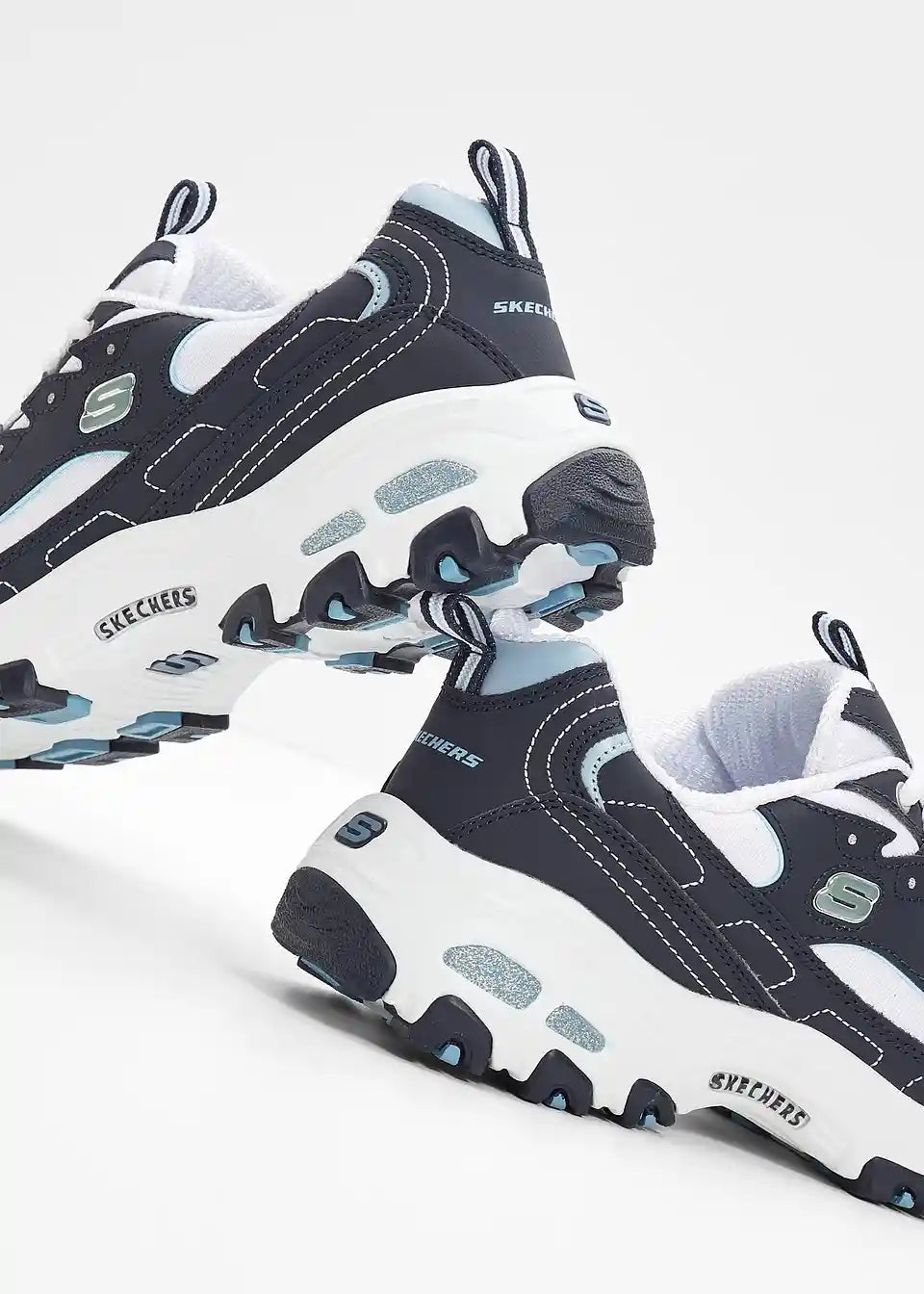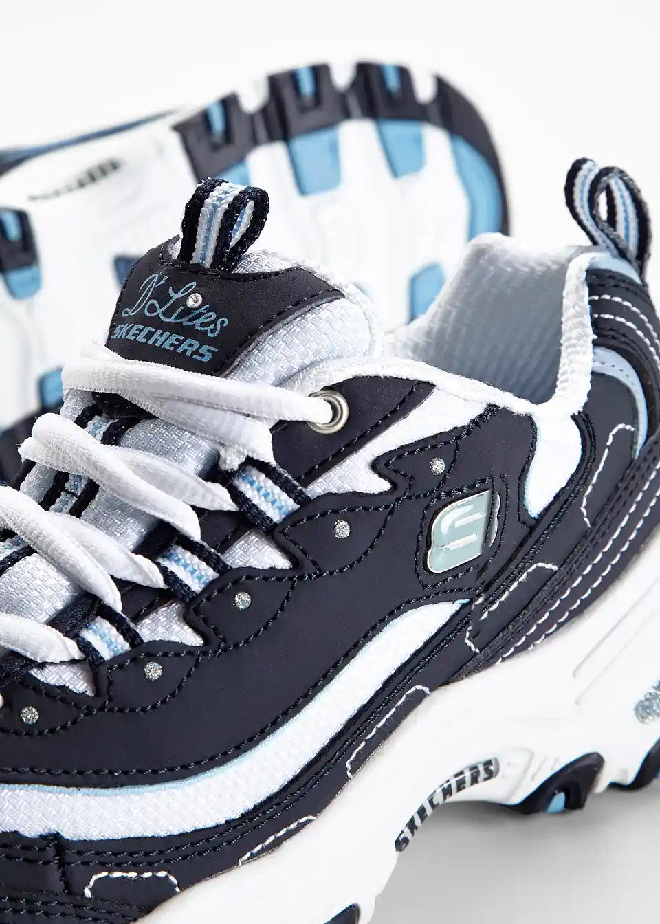 Športna in trendovska superga znamke Skechers prepriča z visokokakovostnim zgornjim materialom, dekorativnimi šivi in igrivimi bleščečimi aplikacijami na podplatu.