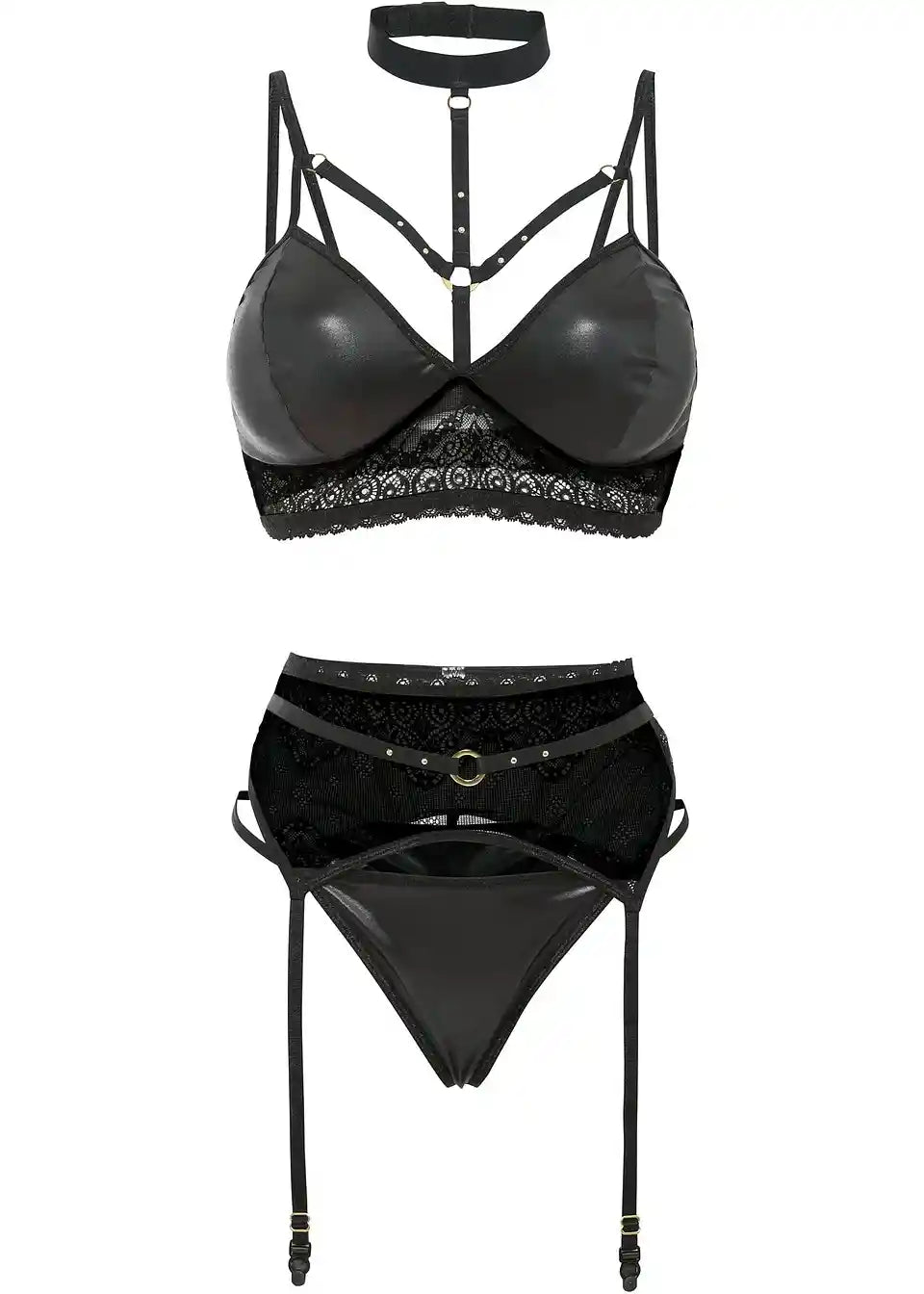 Bralette nedrček, string in pas z držkami za nogavice v mokrem videzu