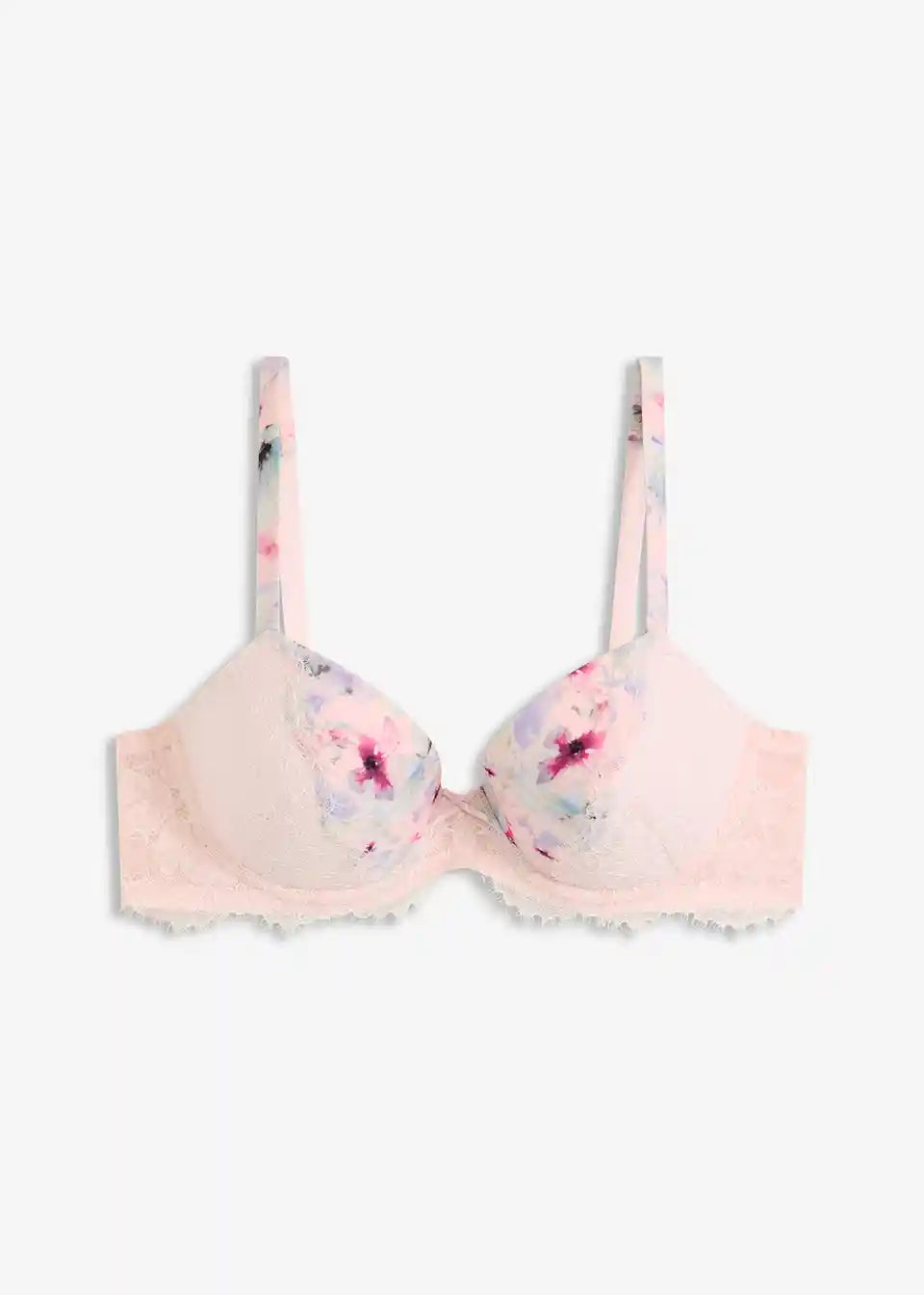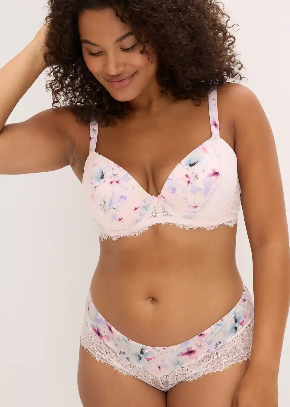 Podložen nedrček z nežnim cvetličnim potiskom in sijočim učinkom.