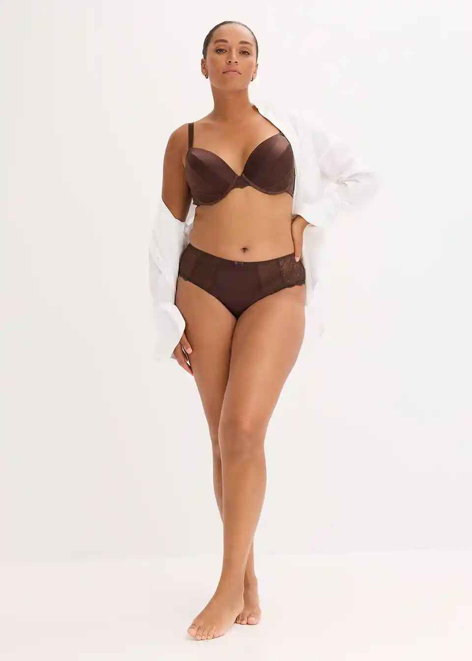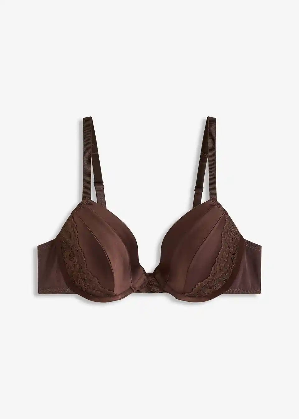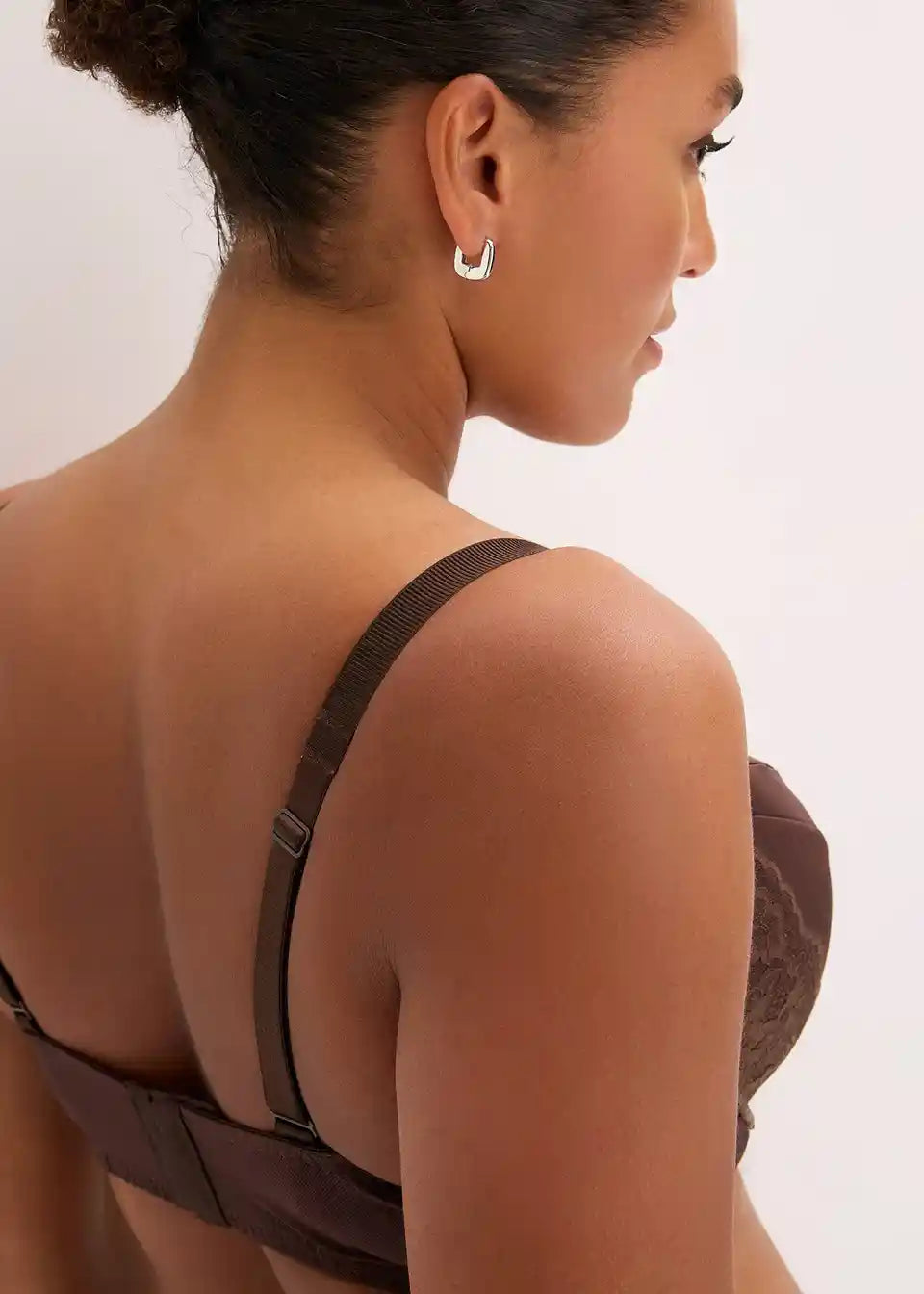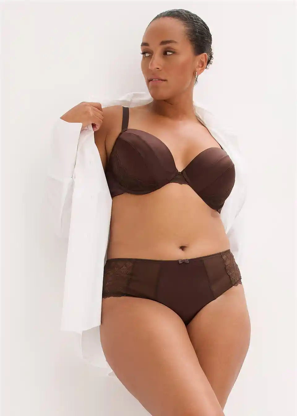 Podložen nedrček s plemenitim sijajem, nabranimi naramnicami in lepim čipkastim okrasjem.