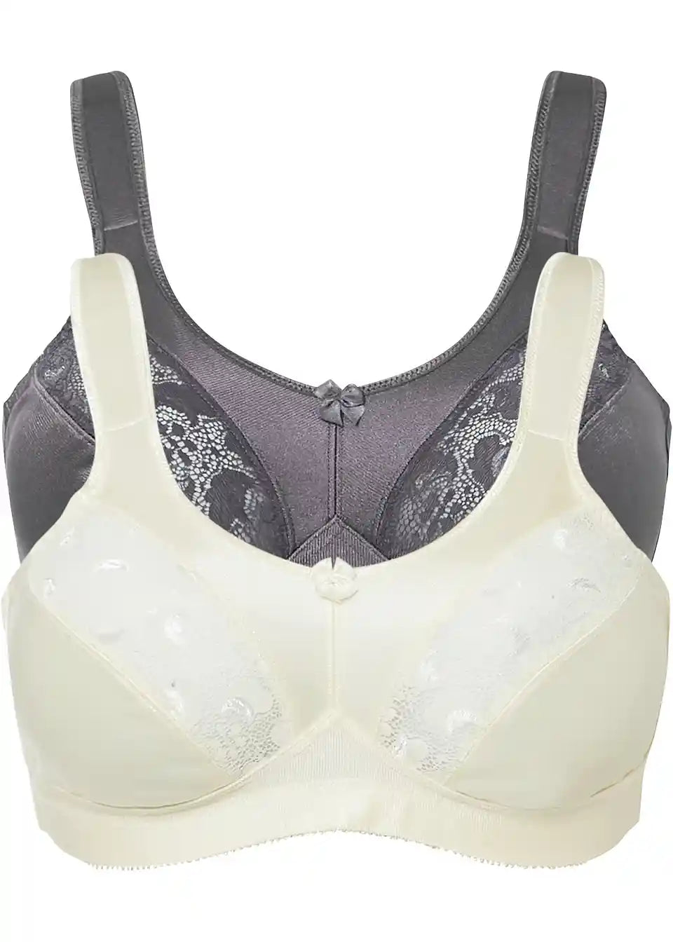 Estetsko oblikovan modrček brez kosti zagotavlja posebej ženskam z večjim obsegom prsi udobno nošenje. Opremljen z elastičnim spodnjim trakom in širokimi, oblazinjenimi naramnicami razbremeni ramena in hrbet. Oblikovalni material poskrbi za dobro oporo in trden občutek nošenja. Ojačana čipka krasi košarice klasičnega modrčka brez kosti iz kolekcije bpc selection v praktičnem paketu po dva kosa.