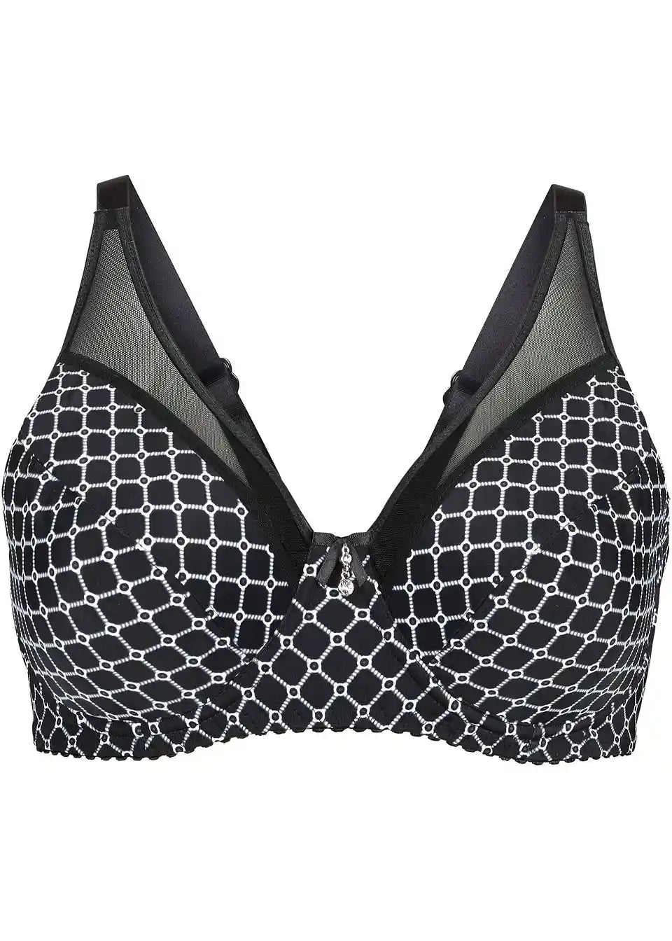 Ta privlačen minimizer nedrček znamke bpc selection vizualno zmanjša dekolte za eno velikost košarice. Nedrček z žico ima na zgornjem delu košaric in sprednji strani naramnic rahlo prosojni vložek. Na sredini mostička nedrčka je majhna pentlja z okrasnim detajlom. Nedrček se na hrbtni strani zapenja z zapenjalom s kaveljčki in očesci, ki je pri večjih košaricah širše oblikovano.