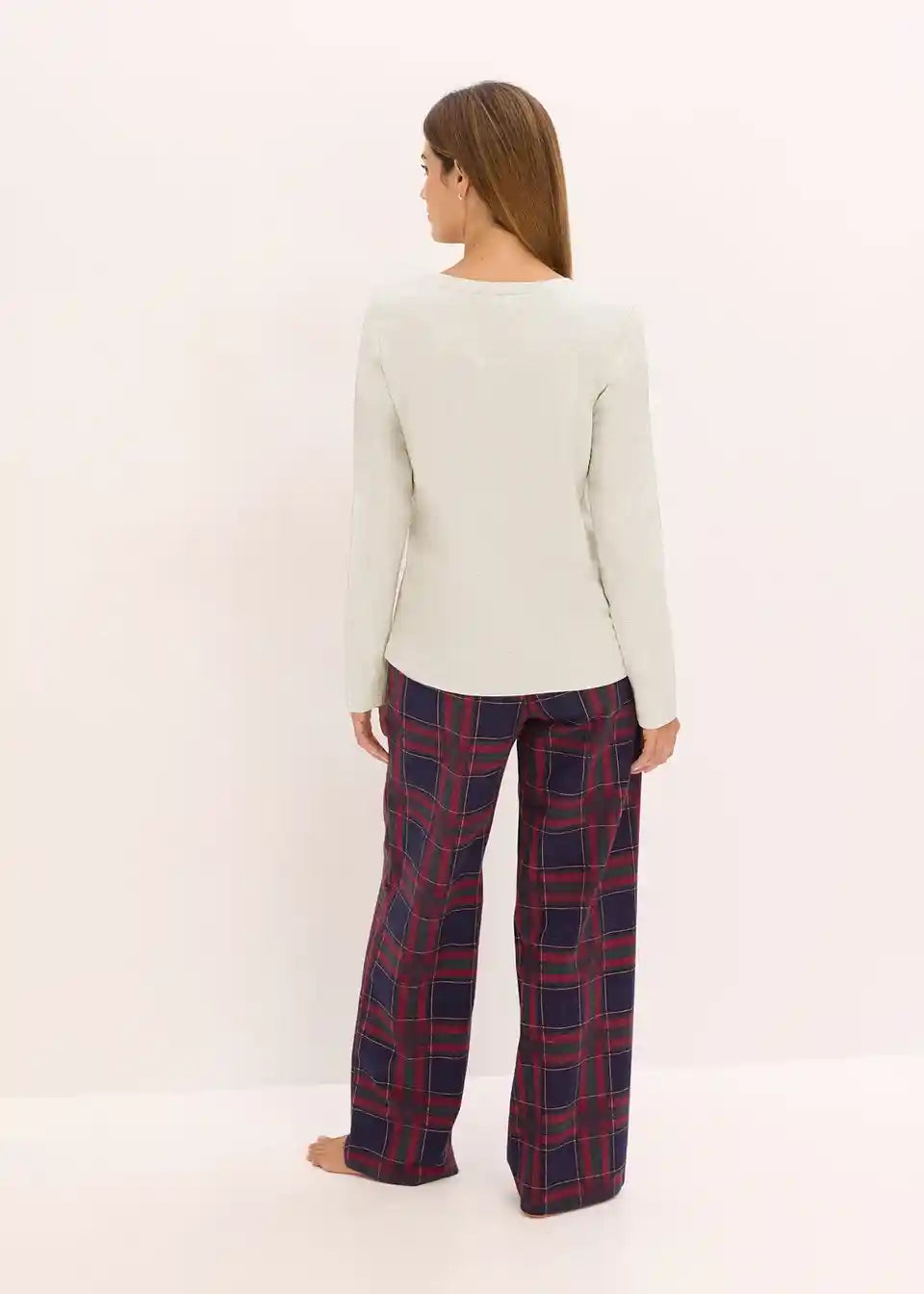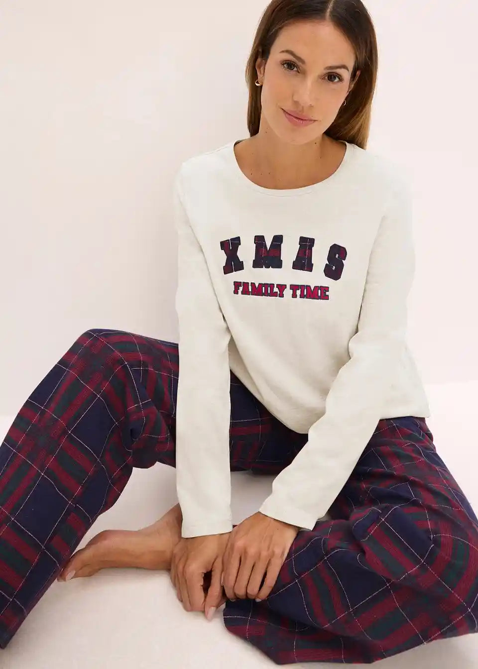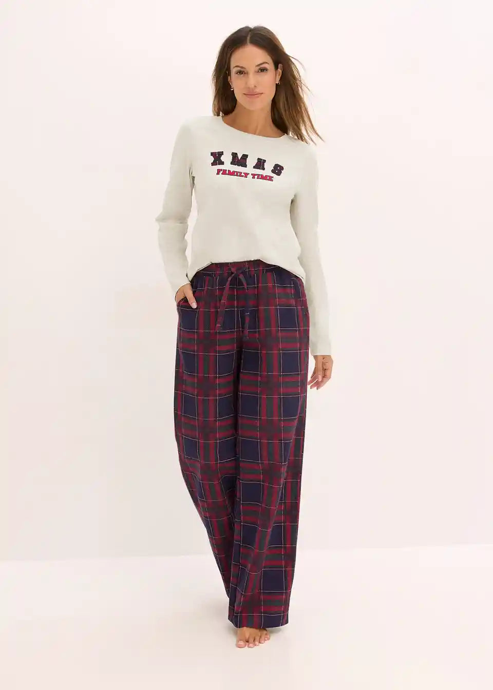 Udobna pižama s tkanimi hlačami iz flanele z všitimi žepi in majico z zimskim aplikacijo iz flanele