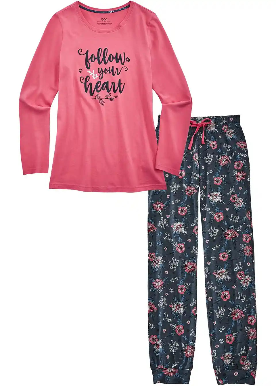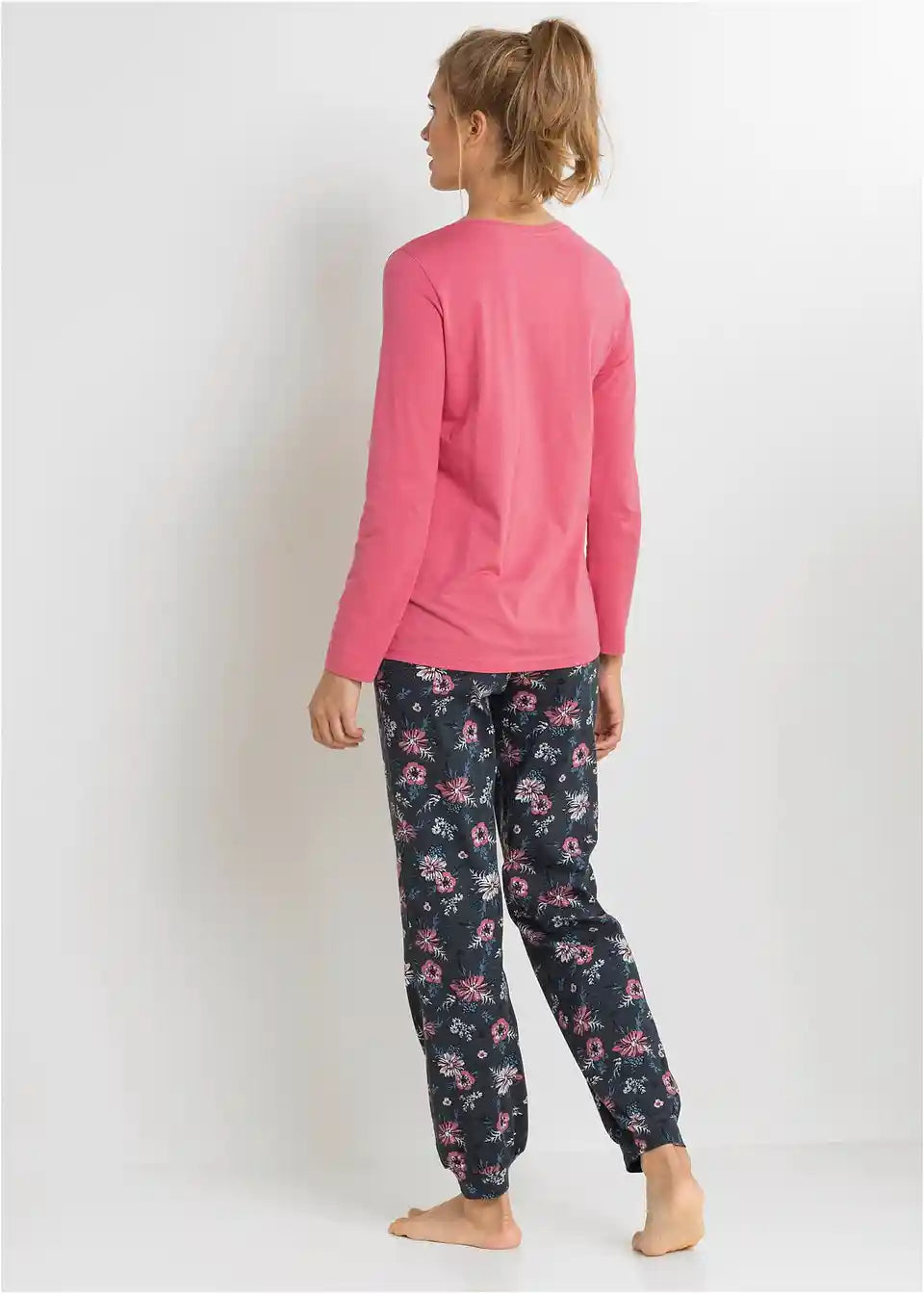 Zgornji del dvodelnega kompleta je oblikovan z dolgimi rokavi in prijetnim okroglim izrezom. Hlače imajo elastičen pas in elastične manšete na koncu hlačnic, kar zagotavlja odlično udobje pri nošenju.