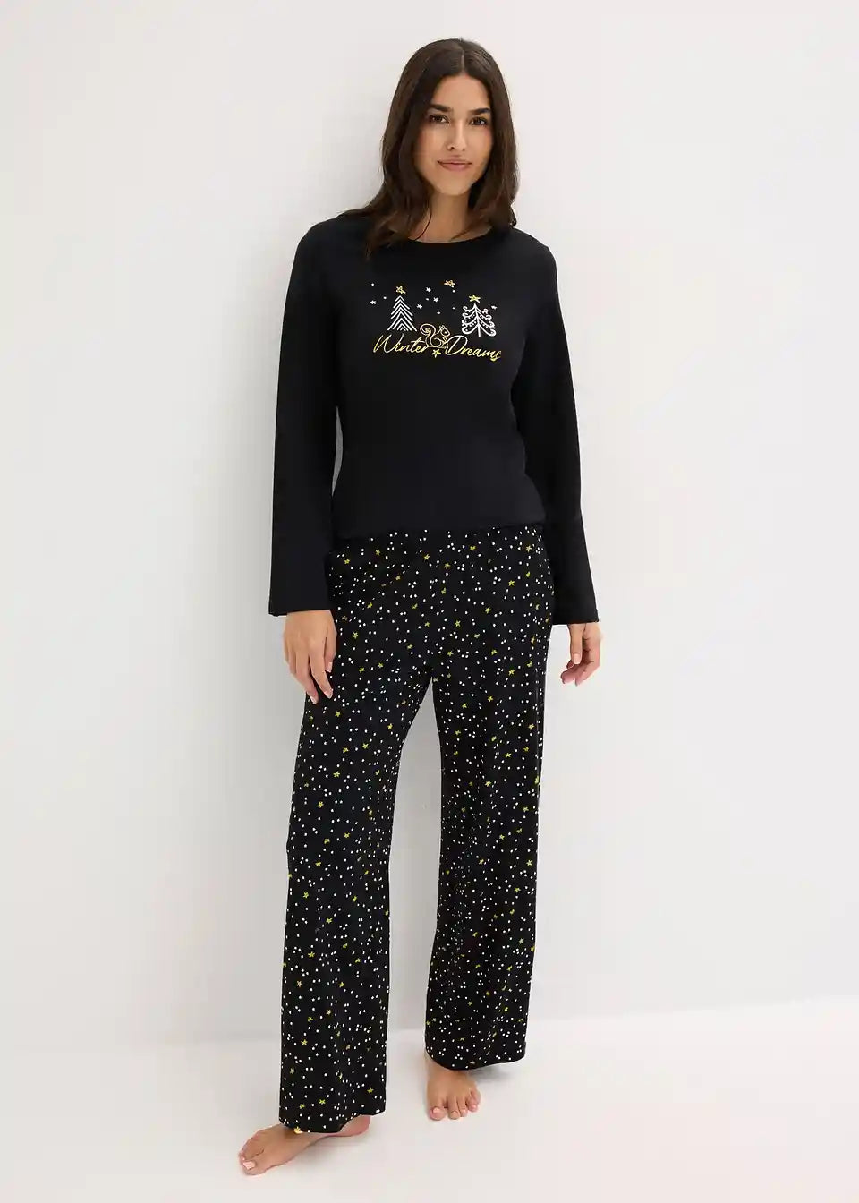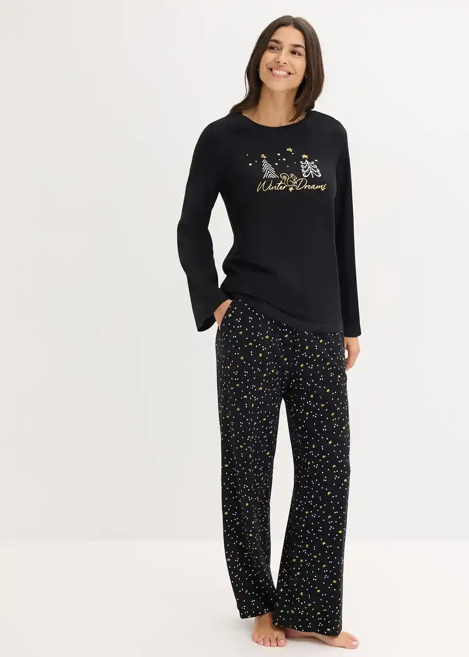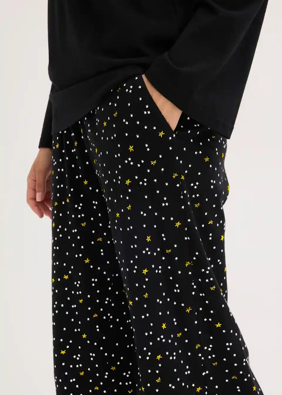 Udobna pižama s posebnim sijočim potiskom z majico z okroglim izrezom in dolgimi rokavi ter dolgimi hlačami z všitimi žepi in širokimi hlačnicami