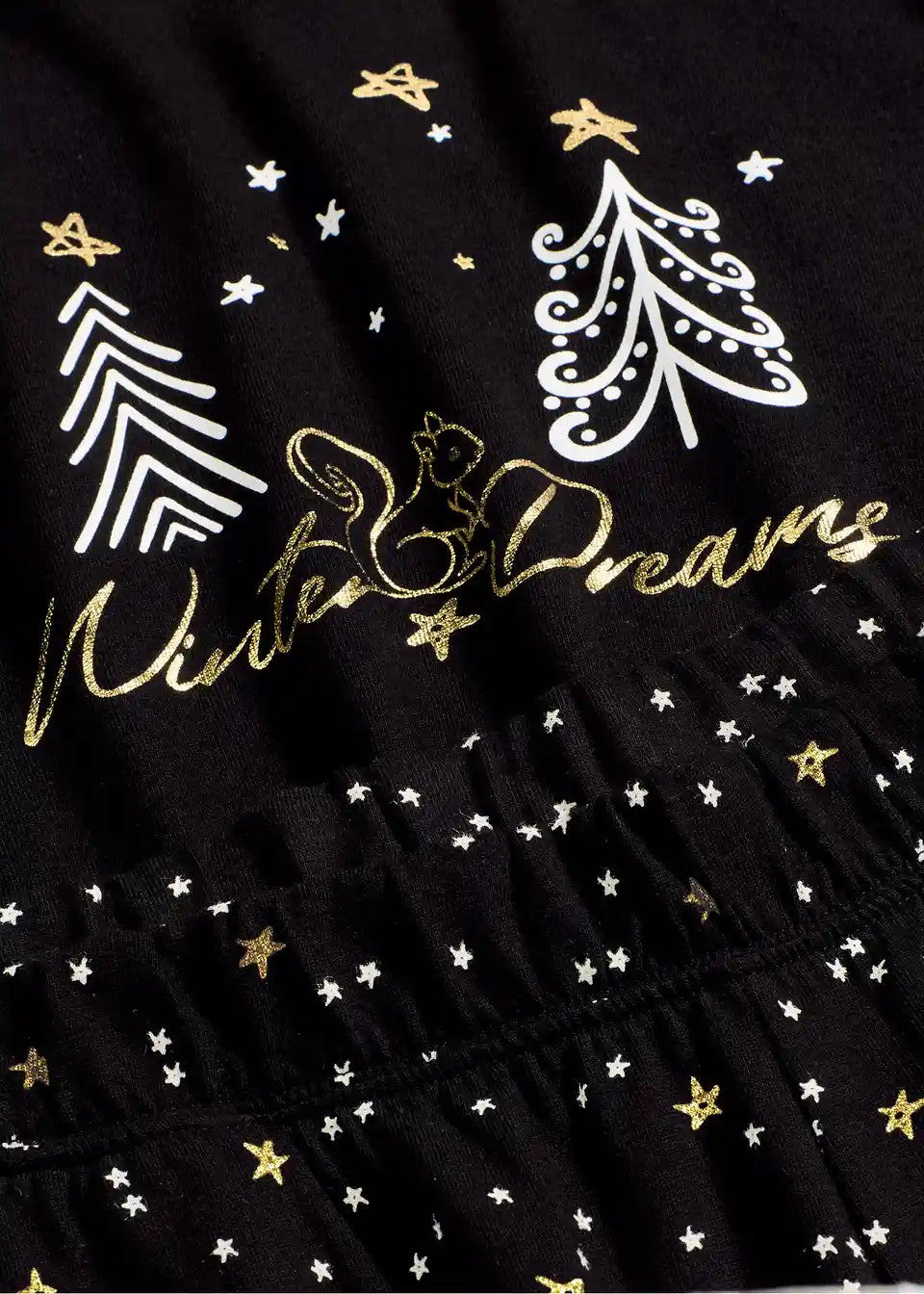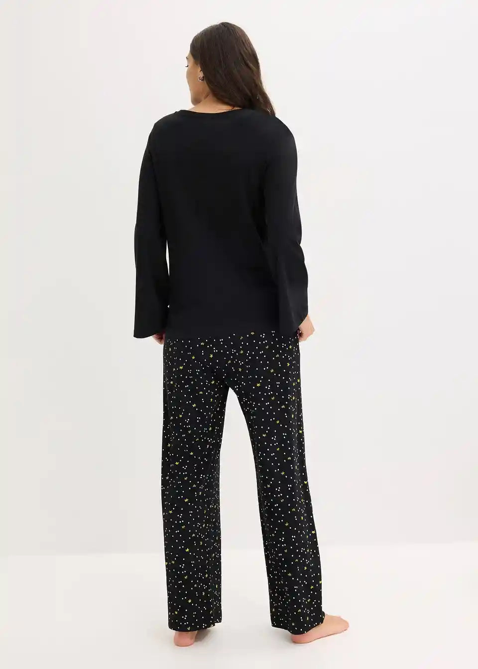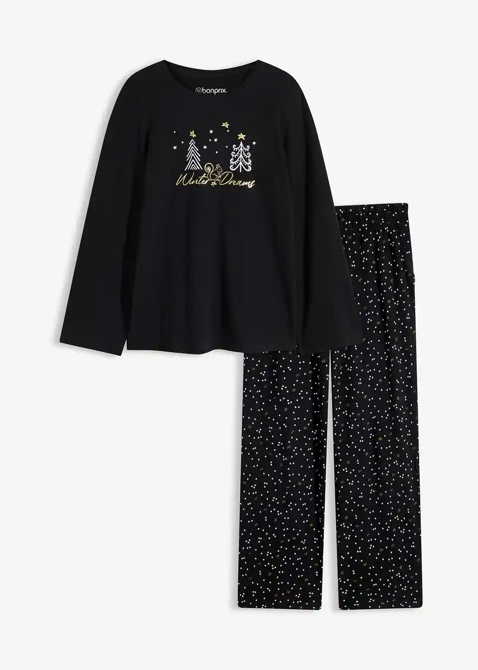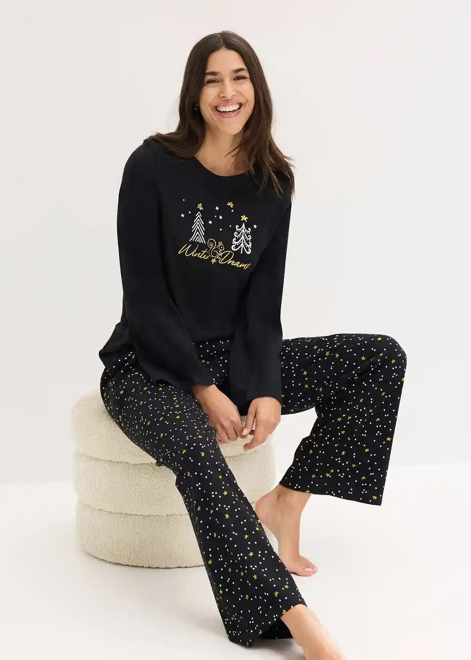 Udobna pižama s posebnim sijočim potiskom z majico z okroglim izrezom in dolgimi rokavi ter dolgimi hlačami z všitimi žepi in širokimi hlačnicami
