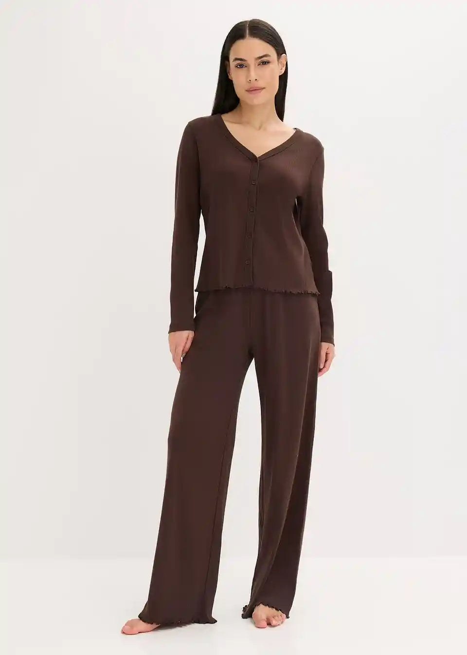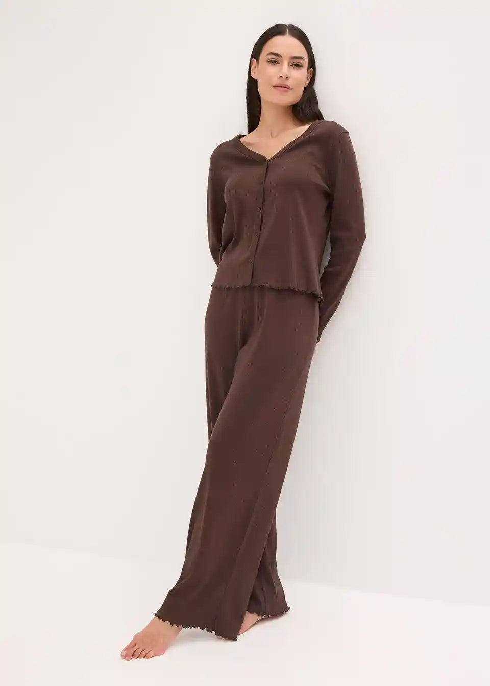 Modna pižama iz rebrastega materiala z letvijo z gumbi in širokimi hlačami