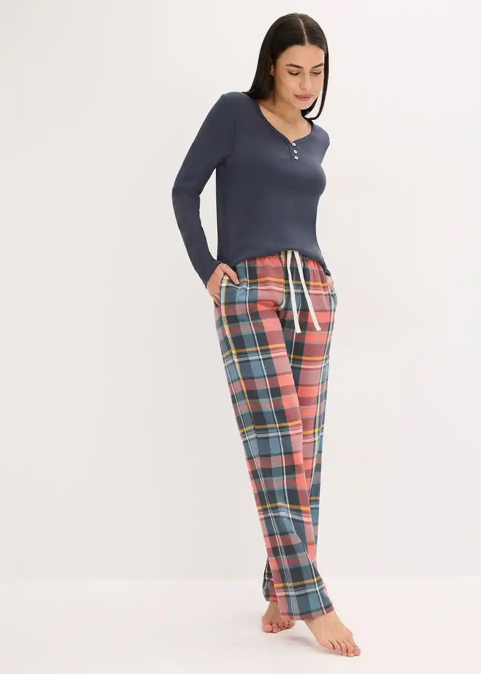 Udobna pižama z rebrastim zgornjim delom z gumbi ter hlačami iz flanele s trakom za zavezovanje in všitimi žepi