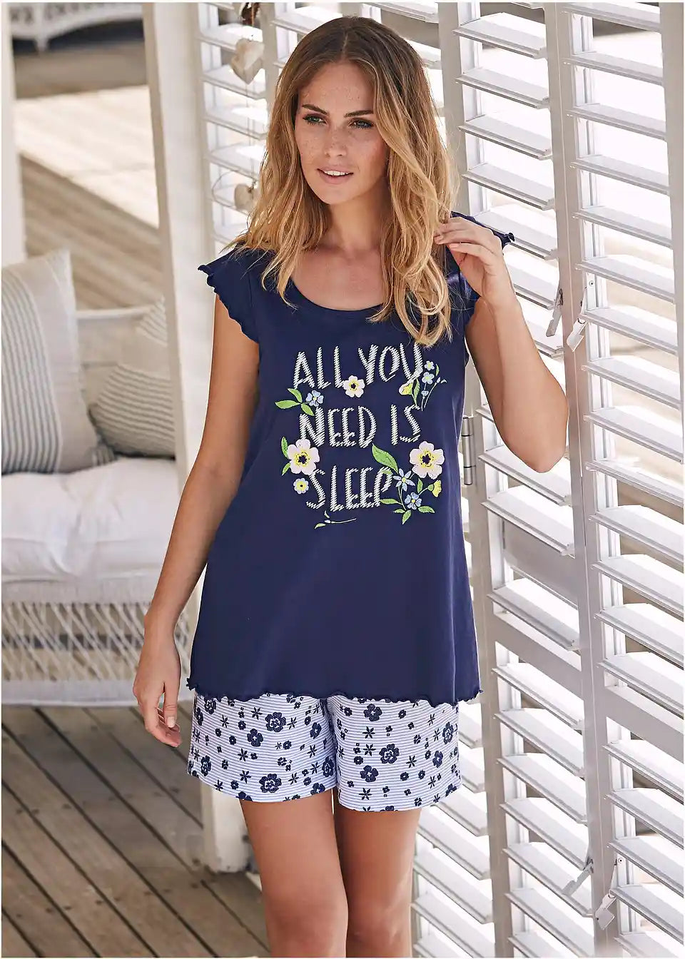 Mehka pižama je sestavljena iz kratkih hlač z vzorcem in majice s kratkimi rokavi ter okroglim izrezom. Razširjen A-kroj majice in lahki krilni rokavi dajo kompletu pižame ženstven videz.