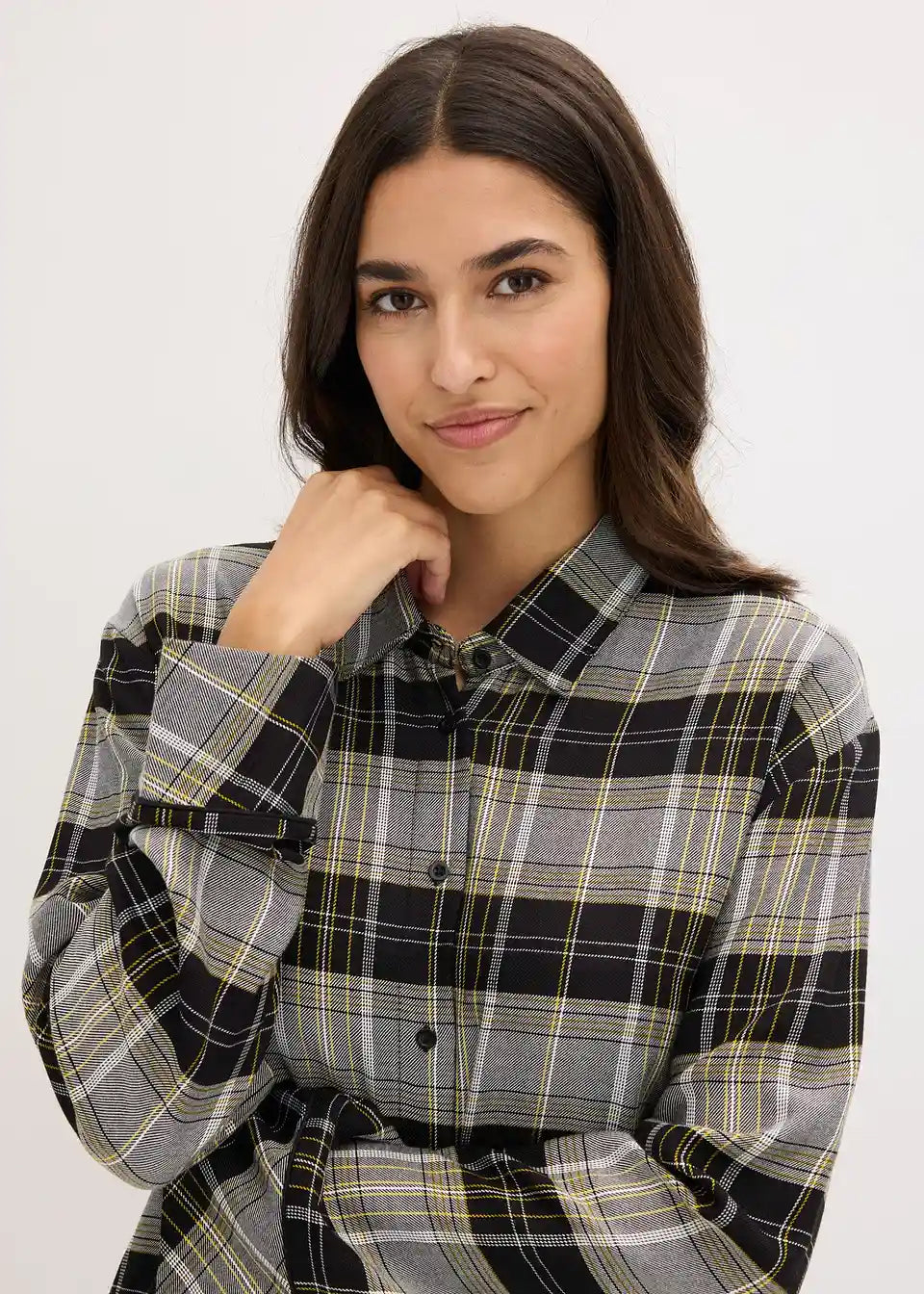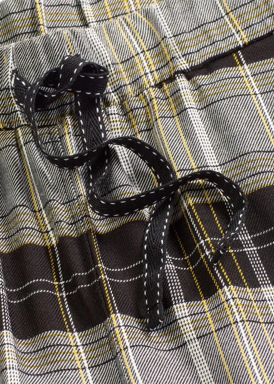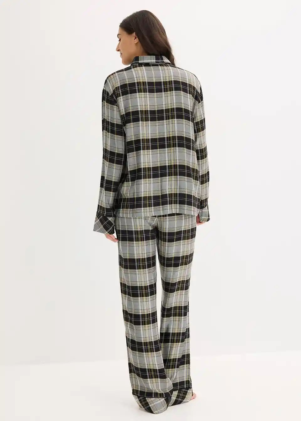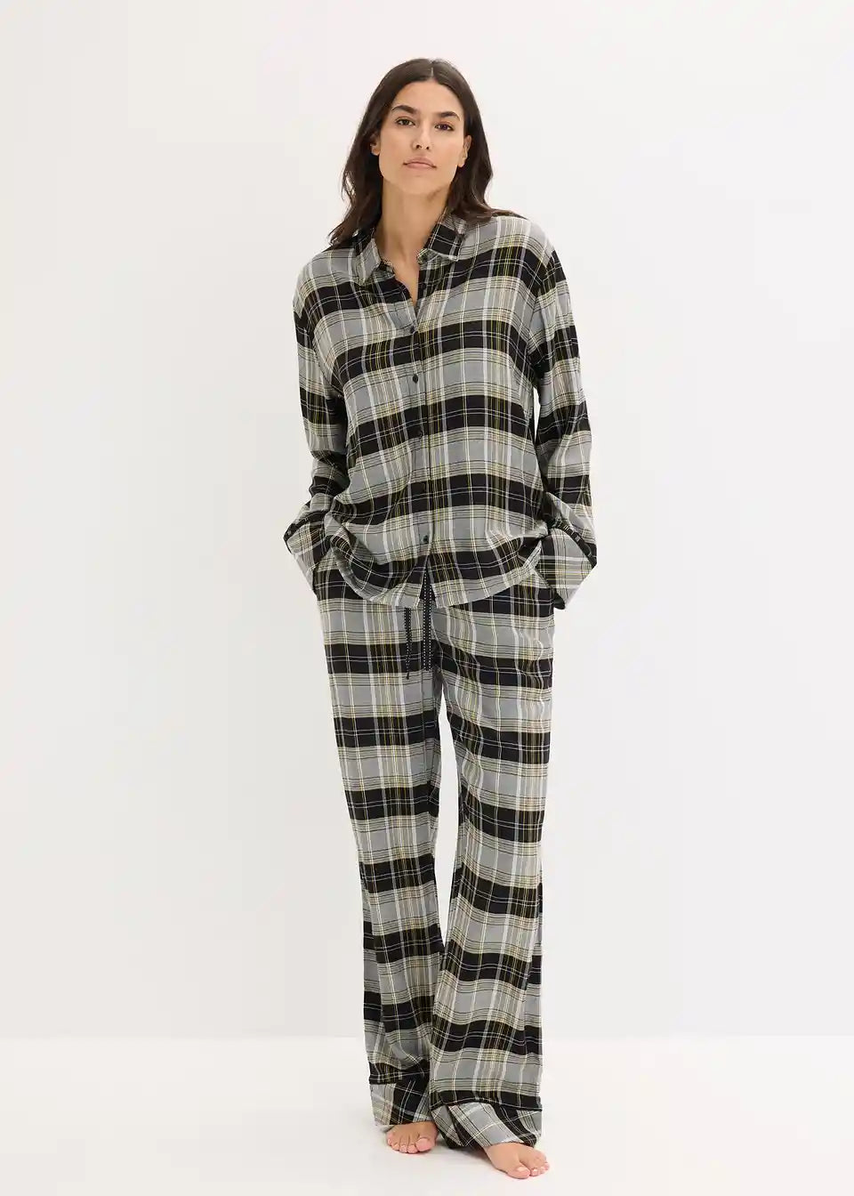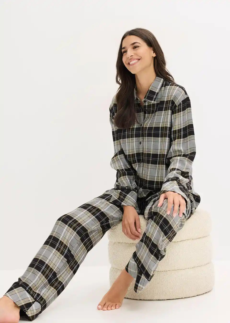 Tkana pižama iz flanele s koničastim bluznim ovratnikom in všitimi žepi na hlačah ter trakom za zavezovanje