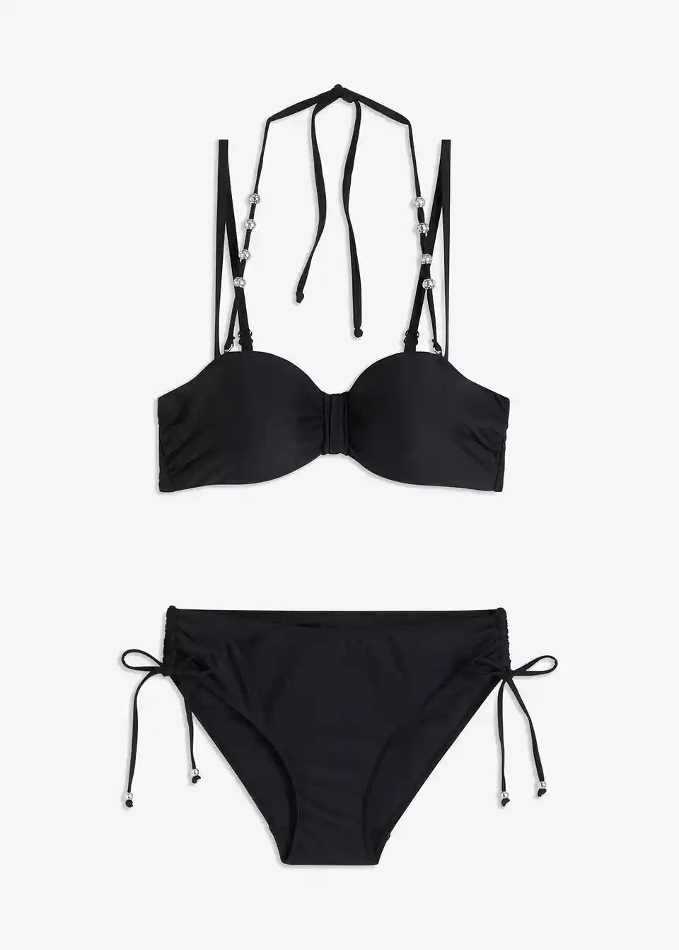 Bikini z žico blagovne znamke BODYFLIRT stilsko poudari žensko postavo. S predoblikovanimi košaricami v slogu Balconette zgornji del pričara čudovit dekolte. Naramnice so nastavljive in pri velikih košaricah širše. Dodatne snemljive vratne naramnice so okrašene s čudovitimi perlicami. Na hrbtni strani je vgrajena enostavna sponka za udobno zapiranje zgornjega dela bikinija. Podložene bikini hlačke so krojene v osnovni obliki in opremljene s stranskimi trakovi za povezovanje.