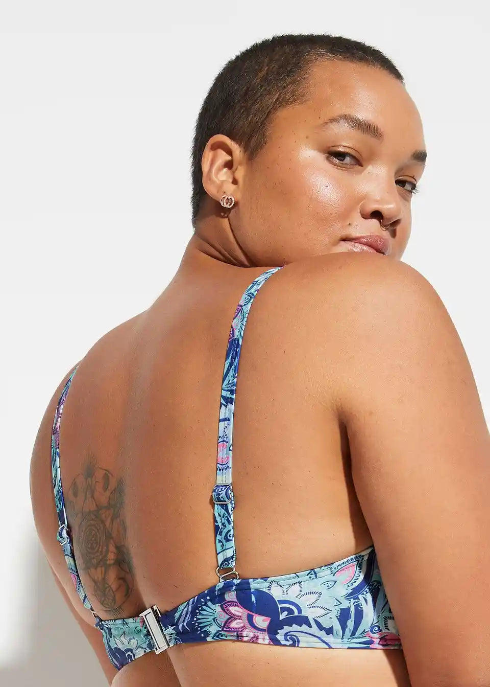 Z nastavljivimi naramnicami. Podloga na prsih. Na hrbtni strani z zapenjanjem na klik.