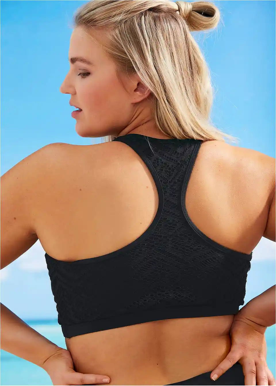 Z rokavom v slogu boksarskega hrbta. Z podlogo za prsi. Okoli in okoli z elastičnim spodnjim trakom pod prsmi.