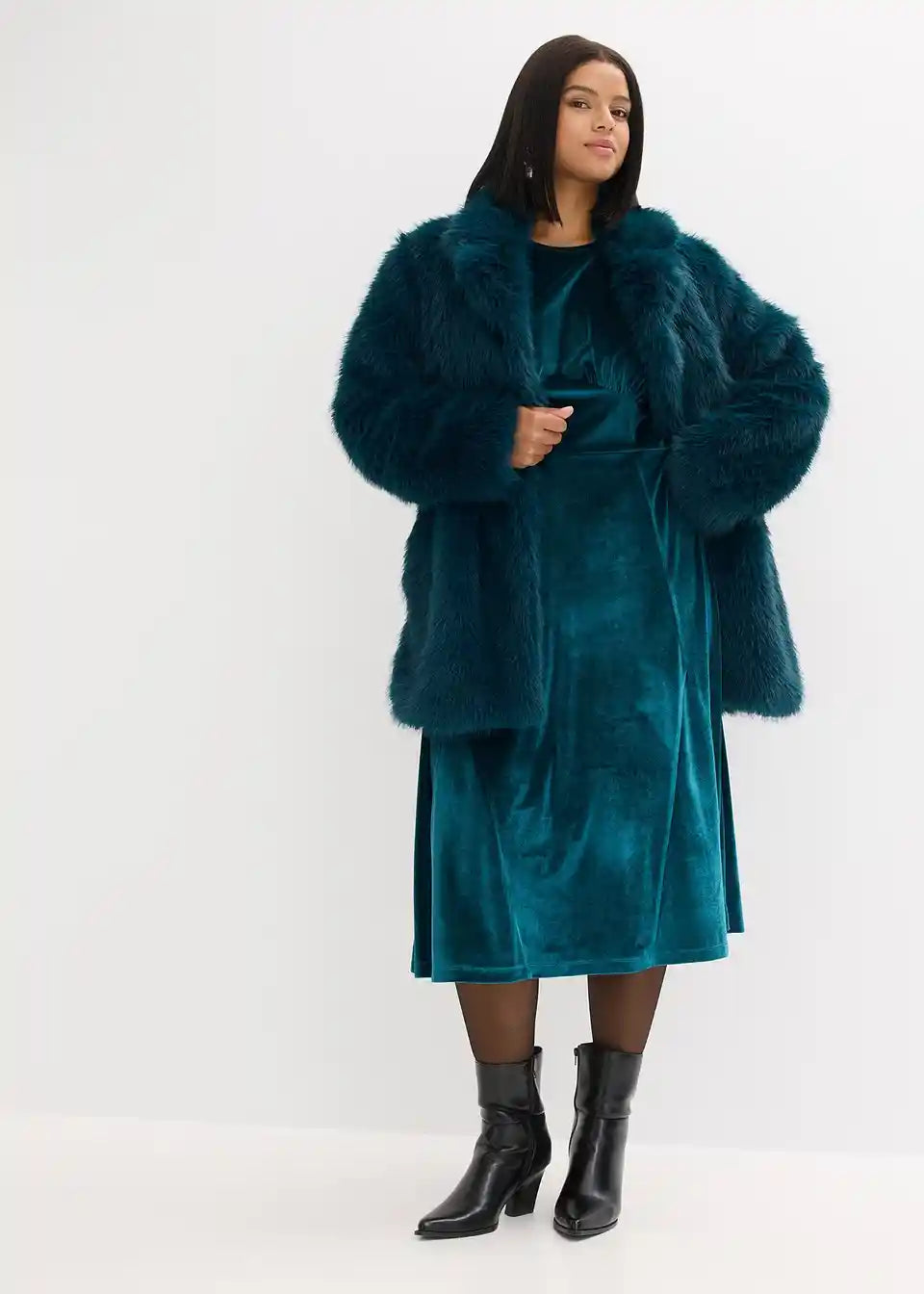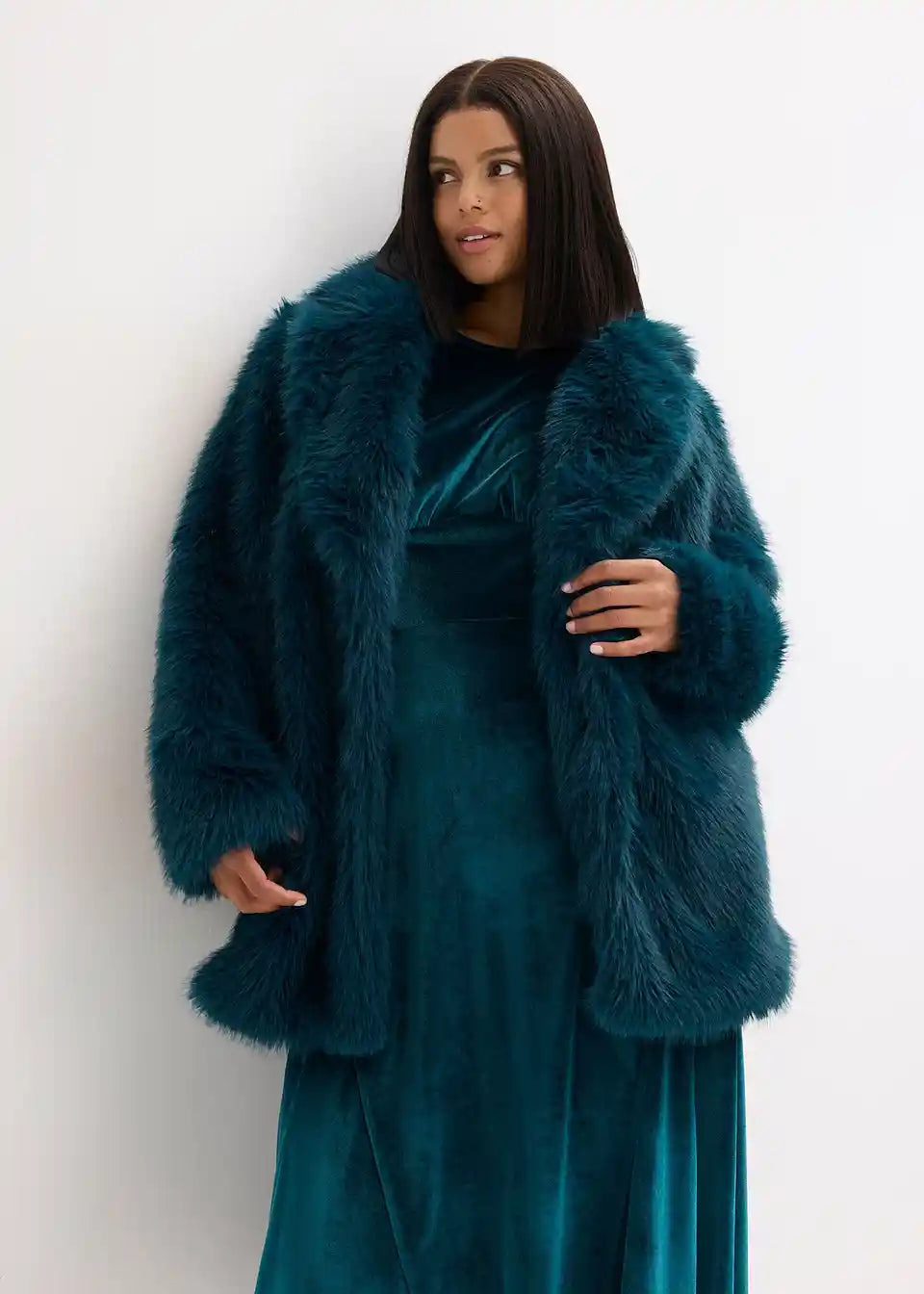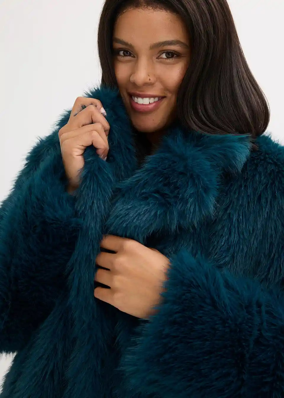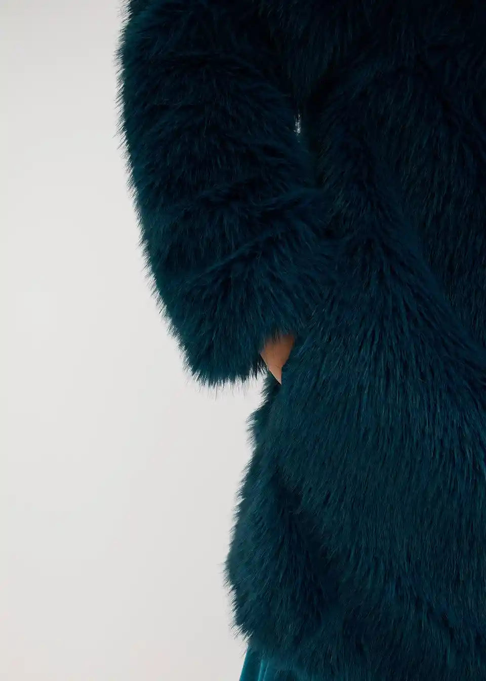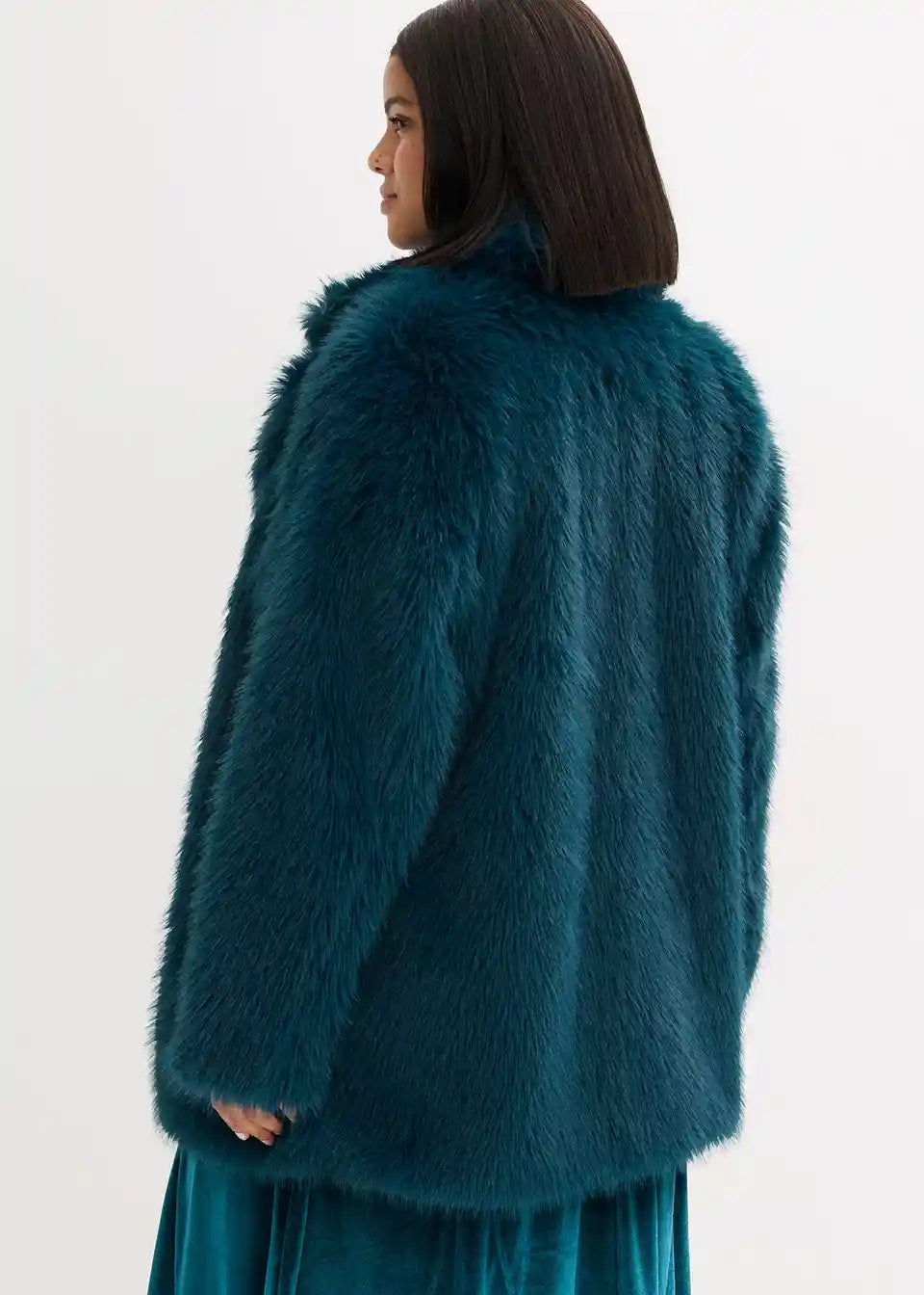 Modna jakna iz umetnega krzna s fazona ovratnikom in pritiskači za zapenjanje spredaj.