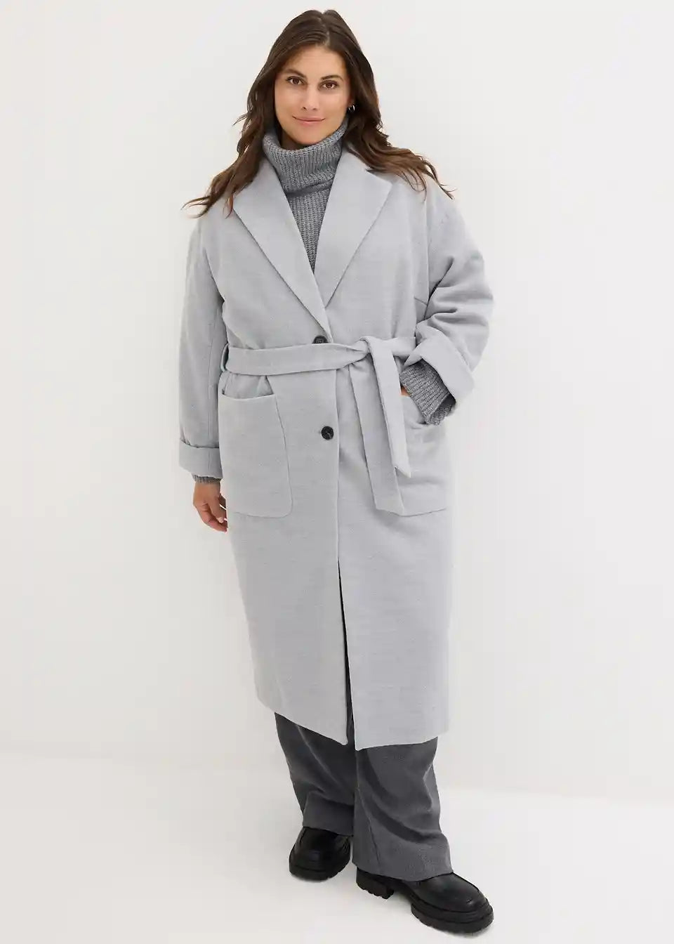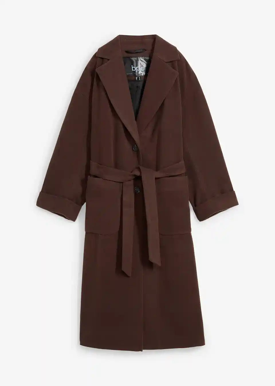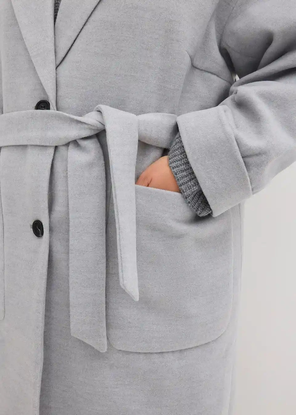 Sodoben plašč iz imitacije volne z žepi in pasom za zavezovanje