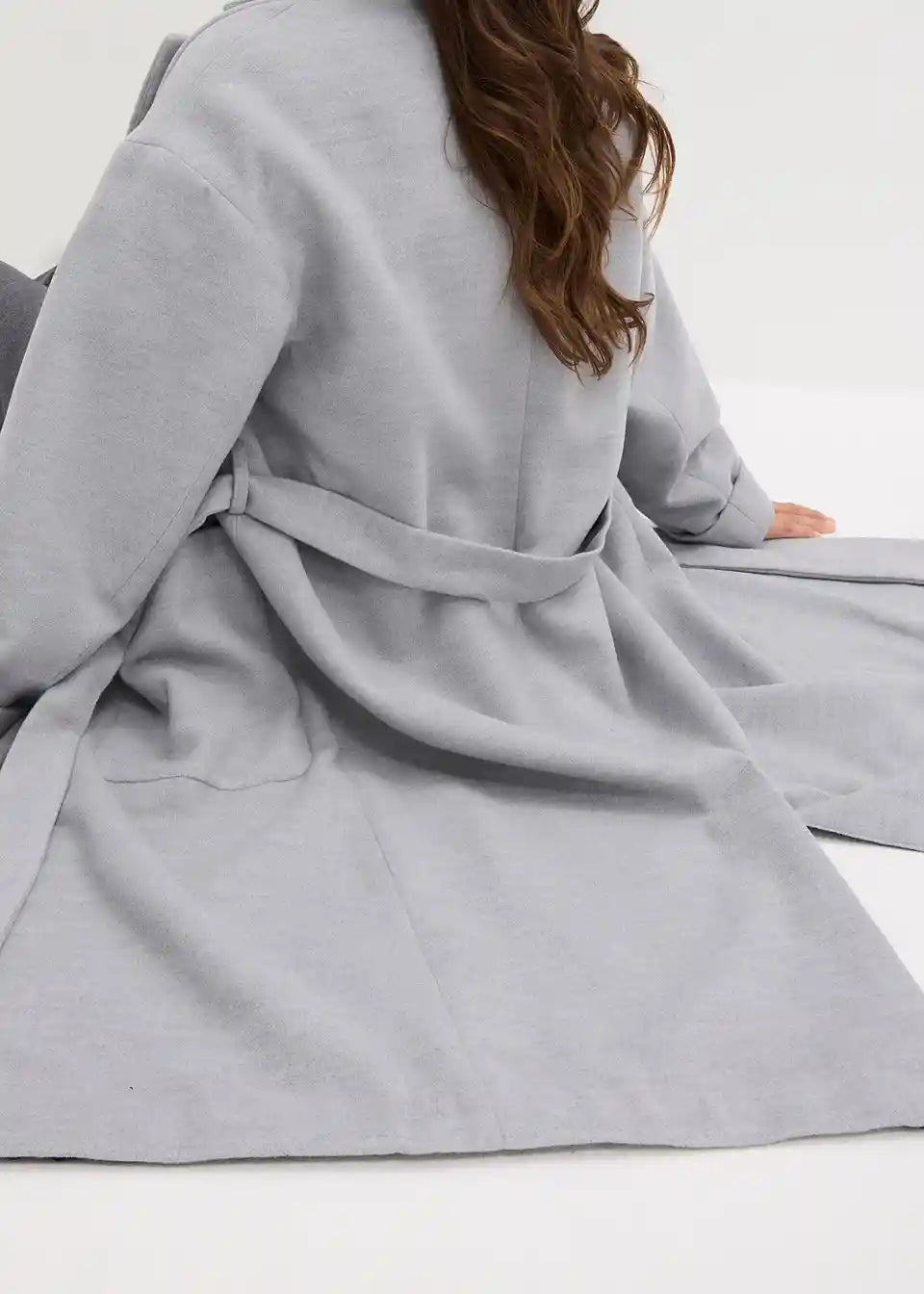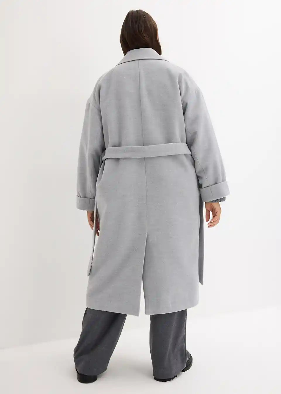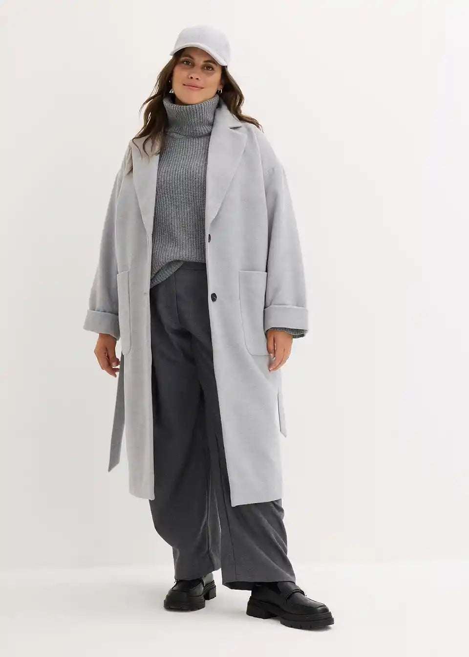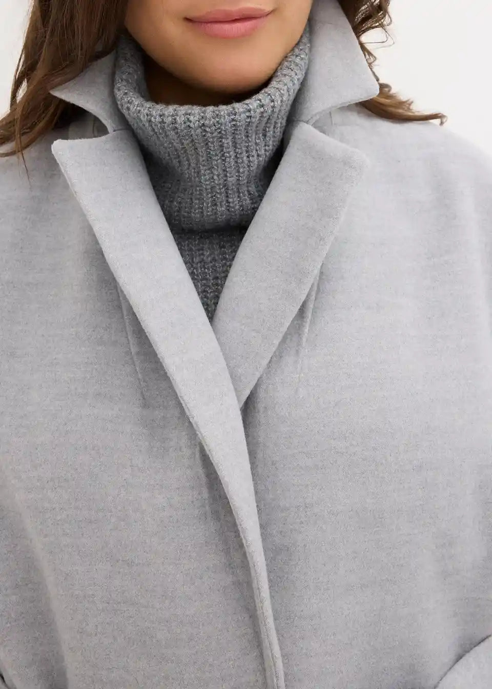Sodoben plašč iz imitacije volne z žepi in pasom za zavezovanje