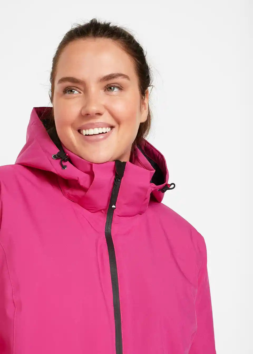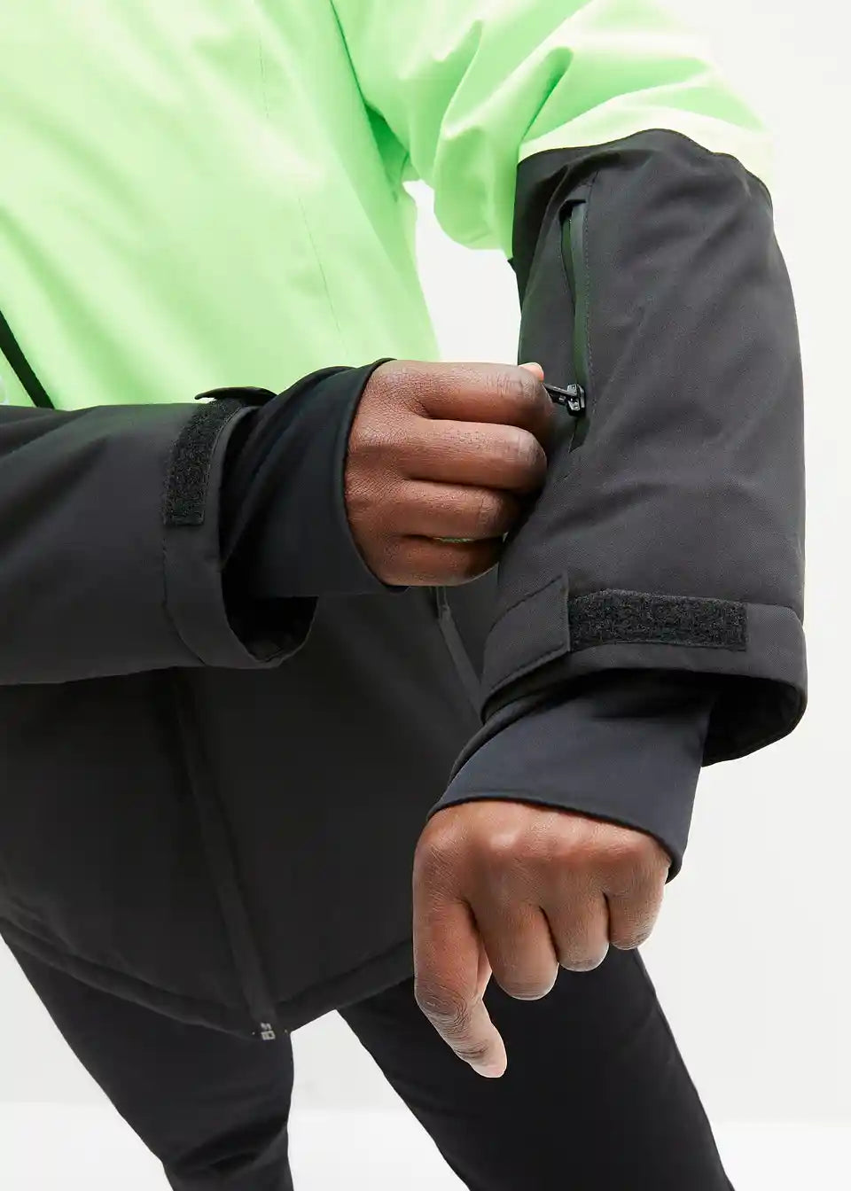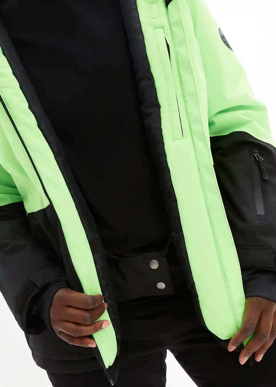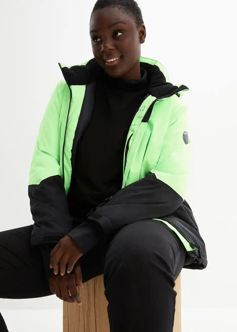 Prilegajoča se smučarska jakna z zračnimi odprtinami in flisasto podlogo na hrbtu ter v žepih, širok kroj