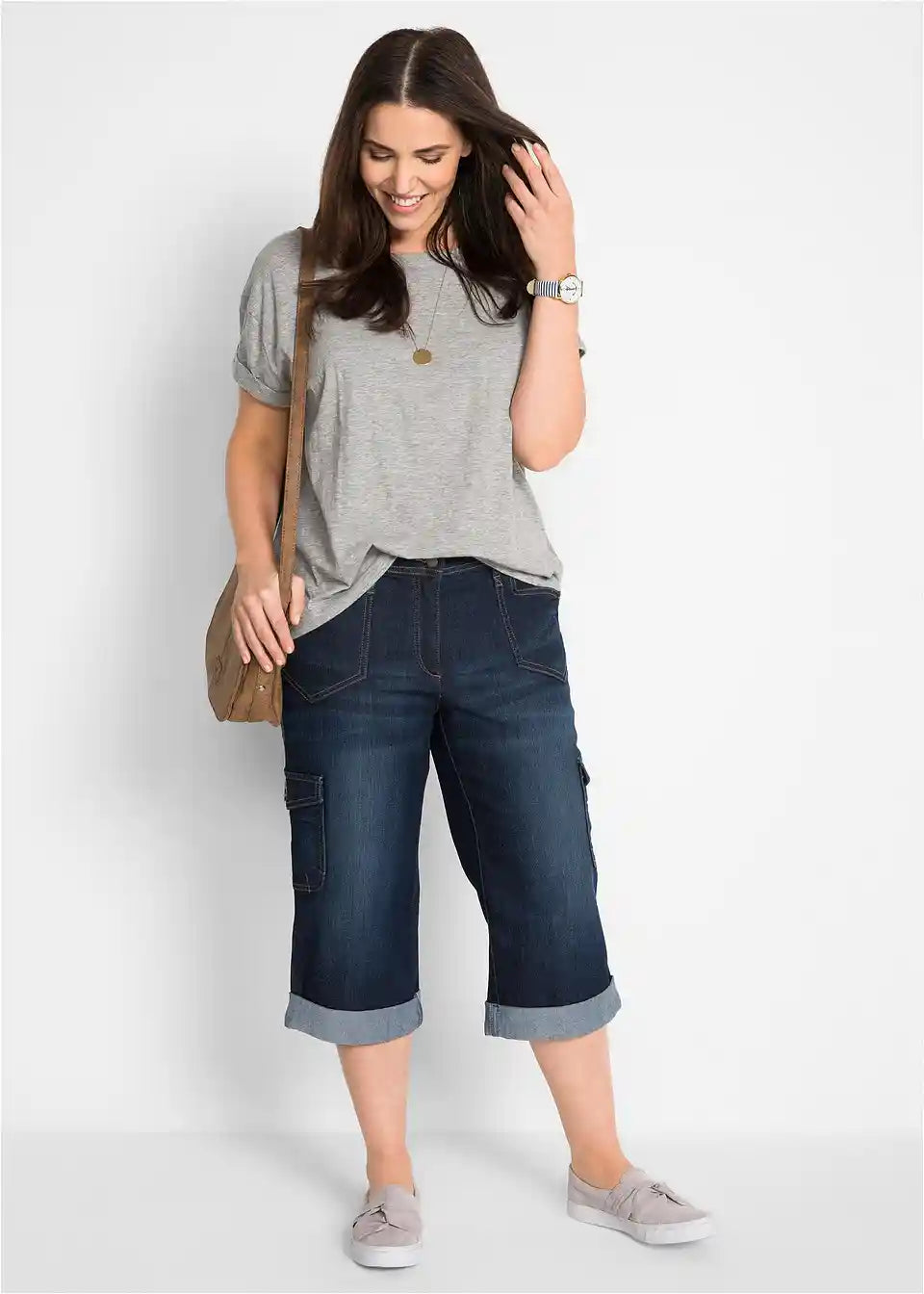 Atraktivne Cargo-Stretch-jeans v capri dolžini odlikuje odlična funkcija za udobje. Stranska všita elastika naredi pas prilagodljiv in zagotavlja prijetno prileganje. Višji pas in ravna, ohlapna hlačnica hkrati prispevata k udobnemu kroju. Dva našita žepa zadaj in dva velika Cargo-žepa spredaj dajejo Stretch-jeans znamke bpc sproščen videz. Rob modela je subtilno zavihan.