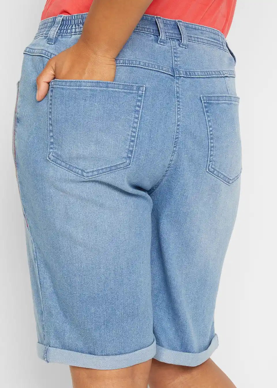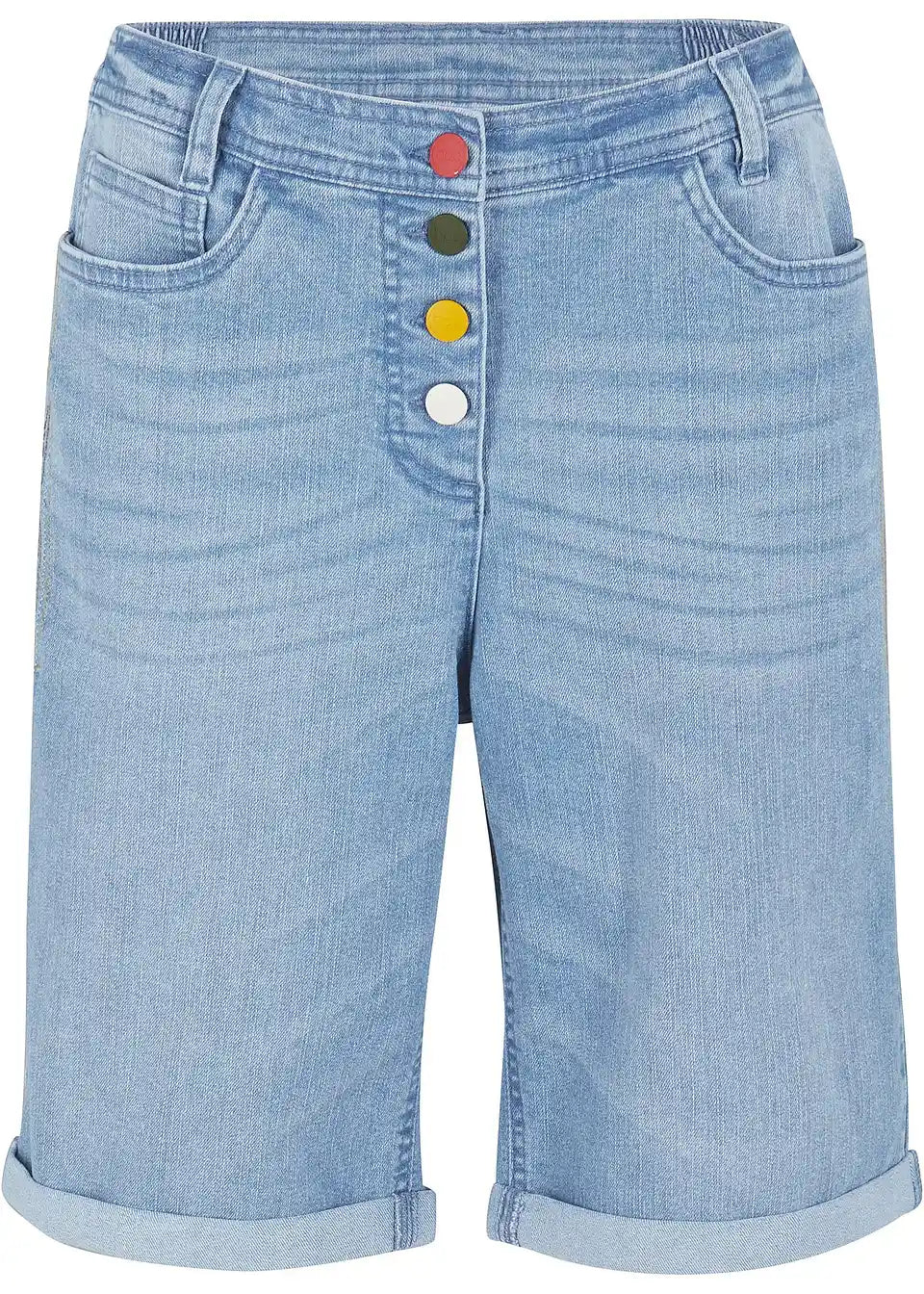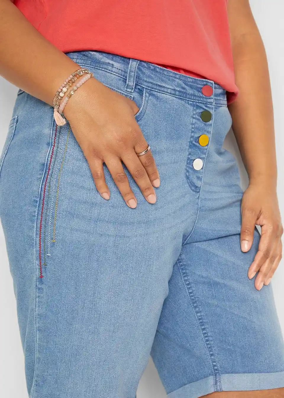 Raztegljiva jeans Bermuda z vezenjem in vpadljivim zapenjanjem z gumbi v pasu